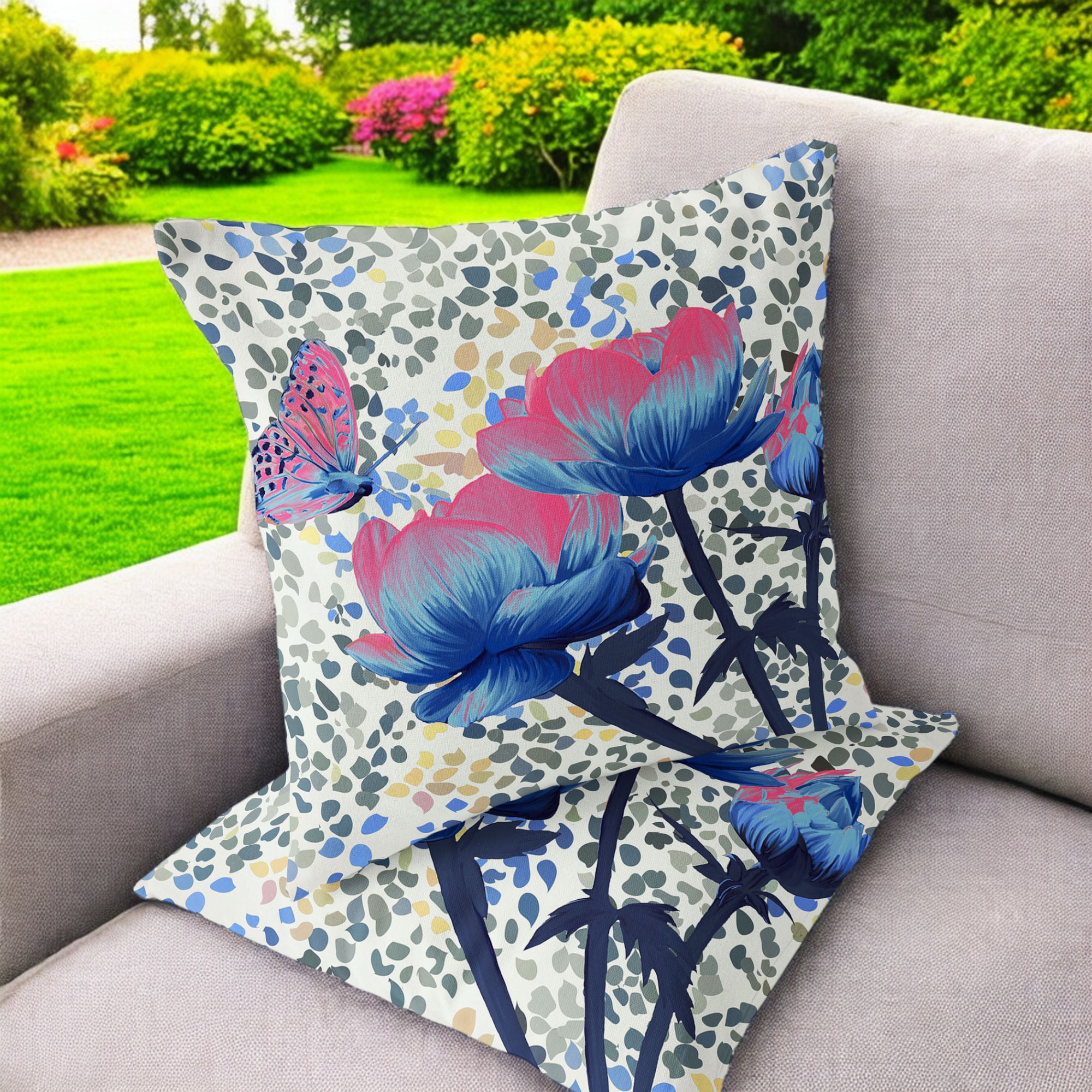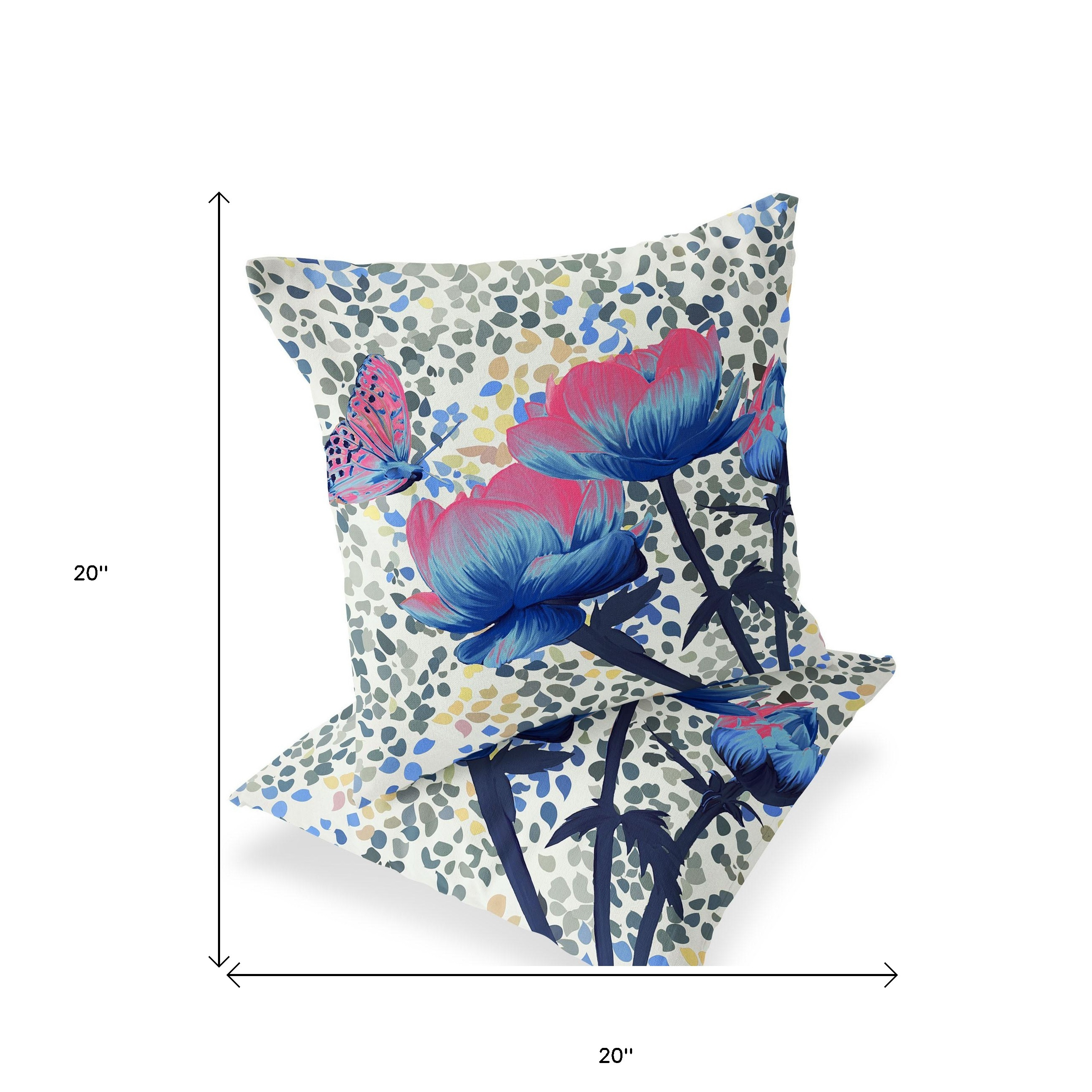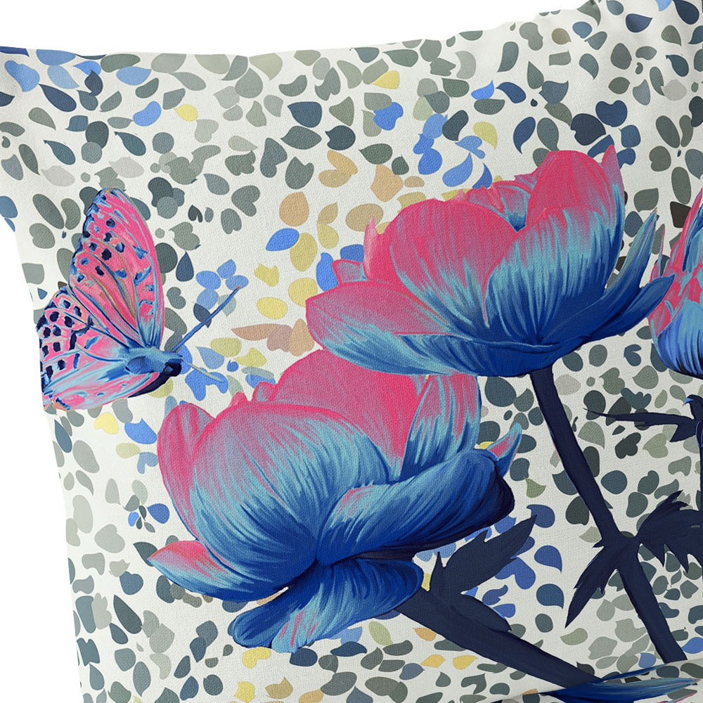Three Roses with Butterfly Indoor/Outdoor Set of 2 Pillows in Pink Blue Cream