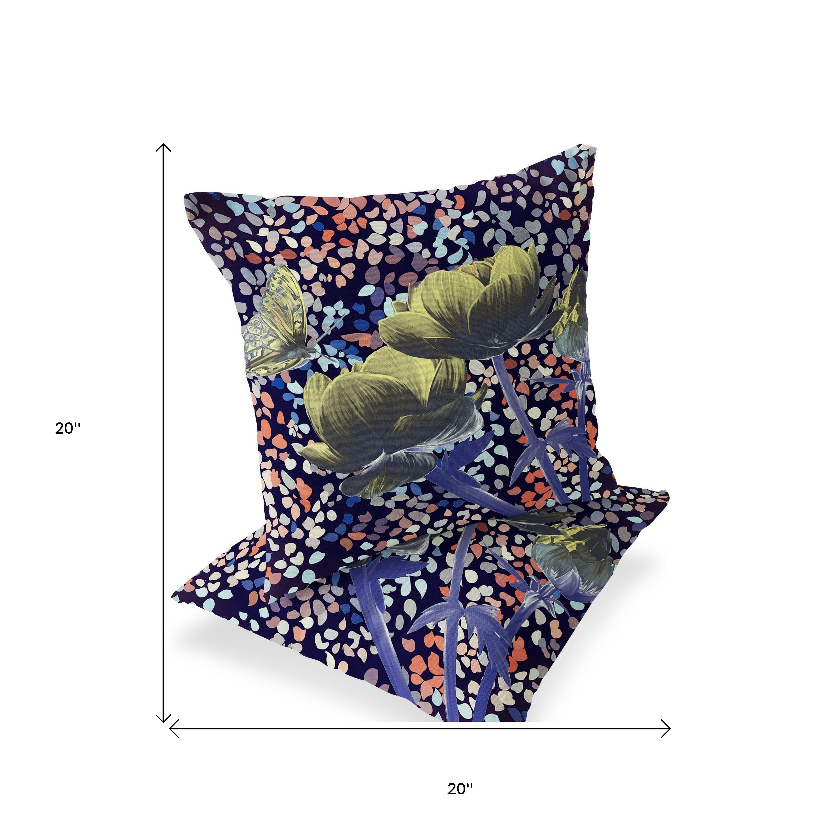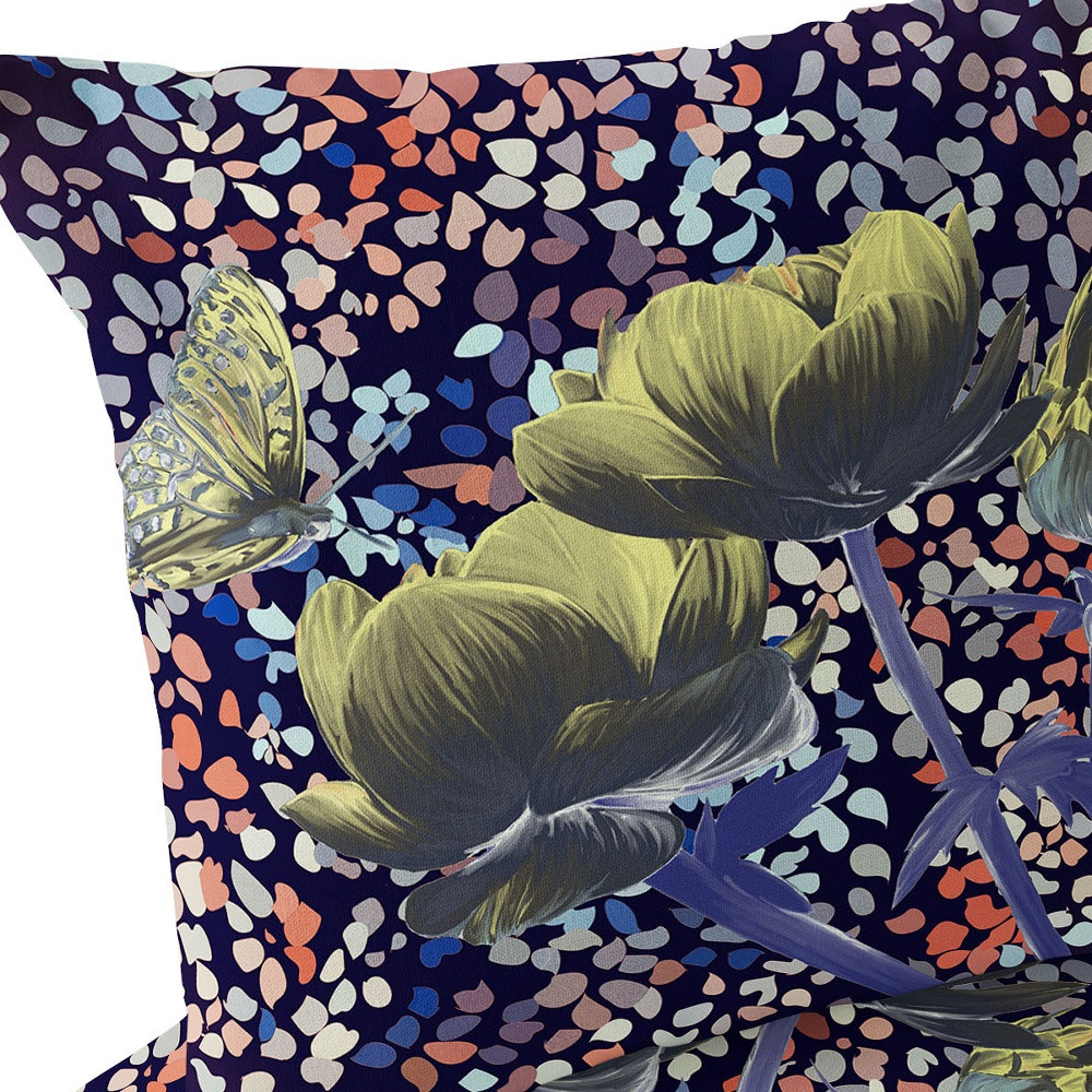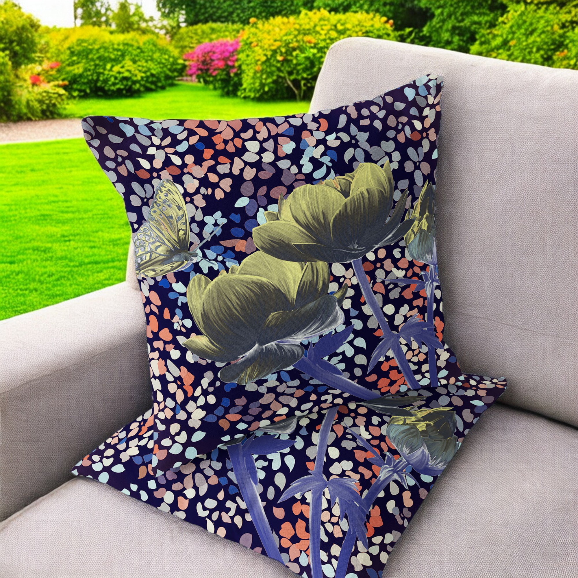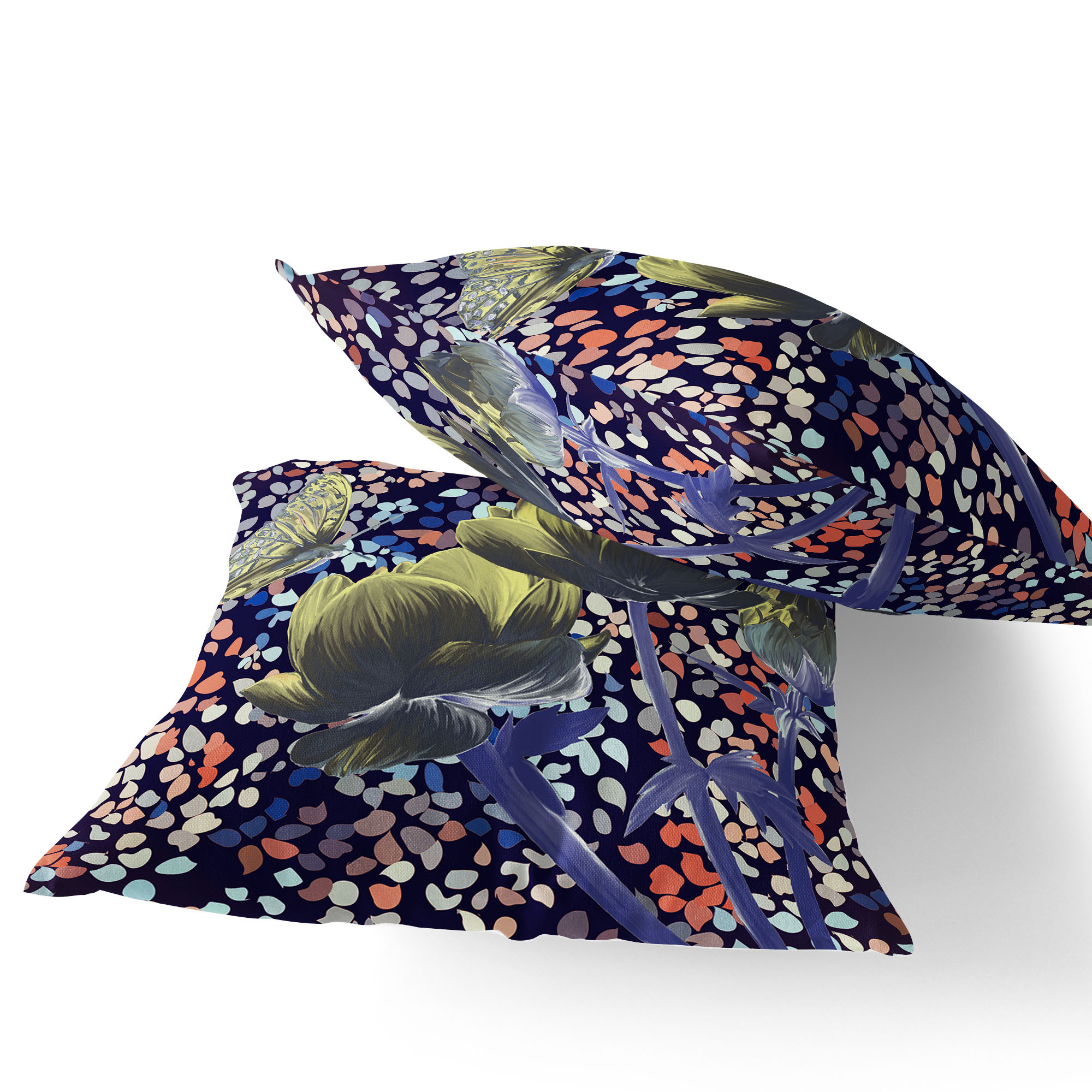 Three Roses with Butterfly Indoor/Outdoor Set of 2 Pillows in Yellow Dark Green Purple