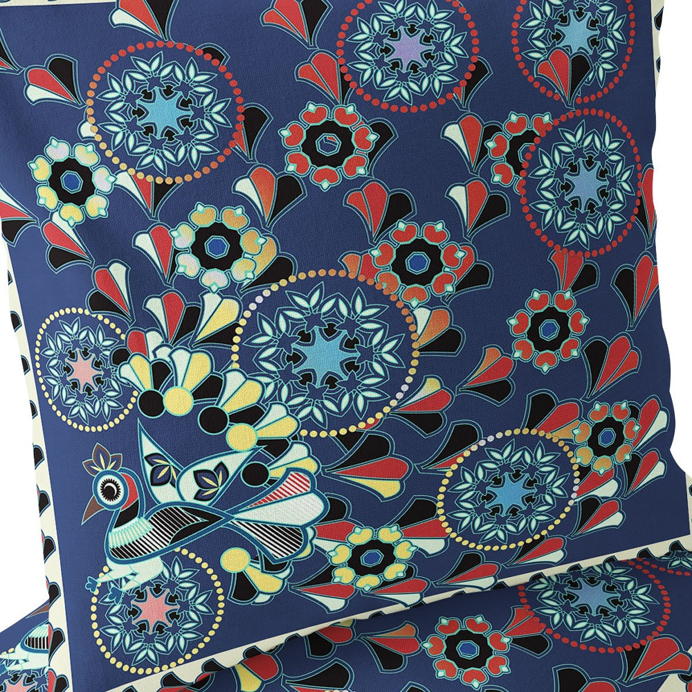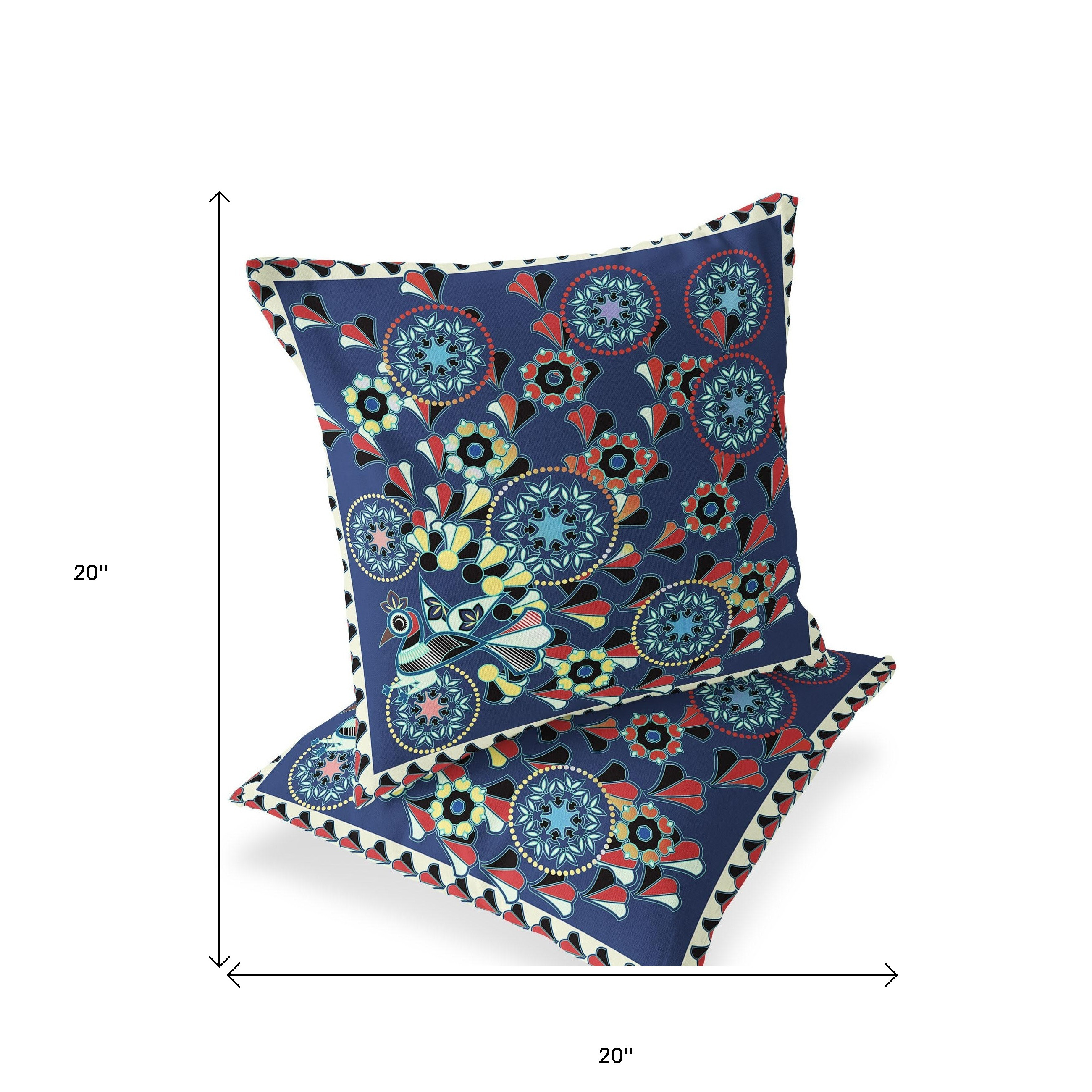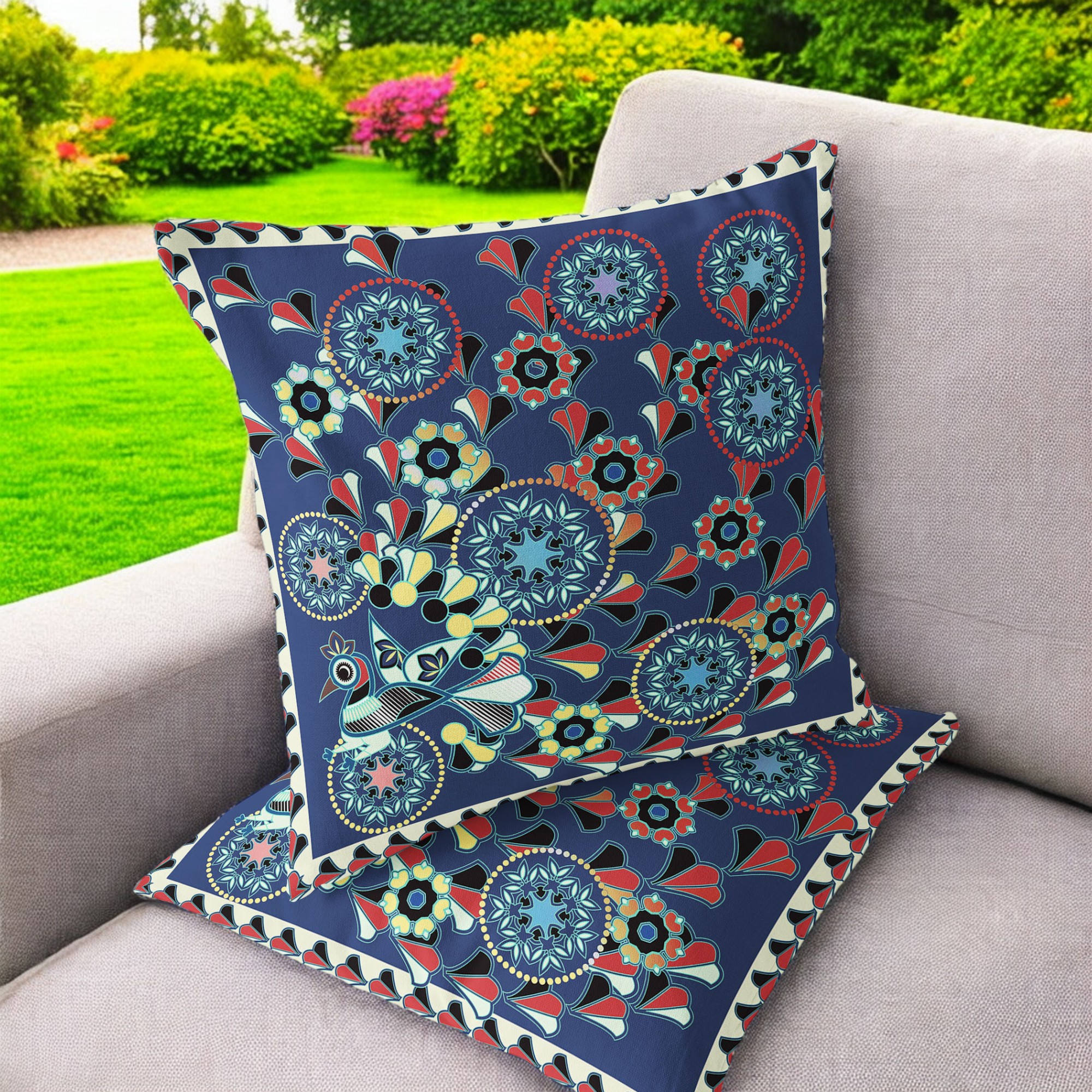 Glory of Flowers Peacock Indoor/Outdoor Set of 2 Pillows in Deep Blue Red Off-White