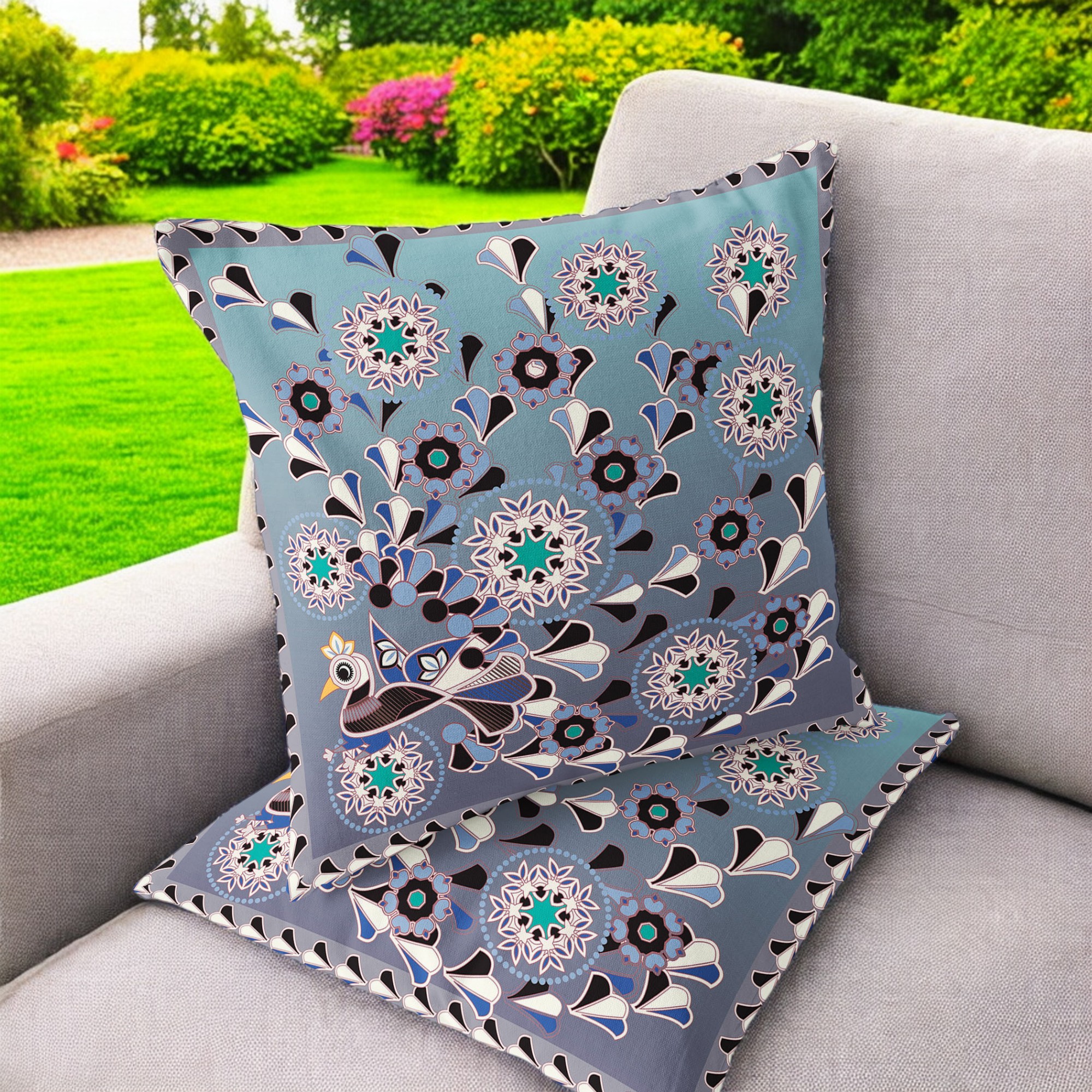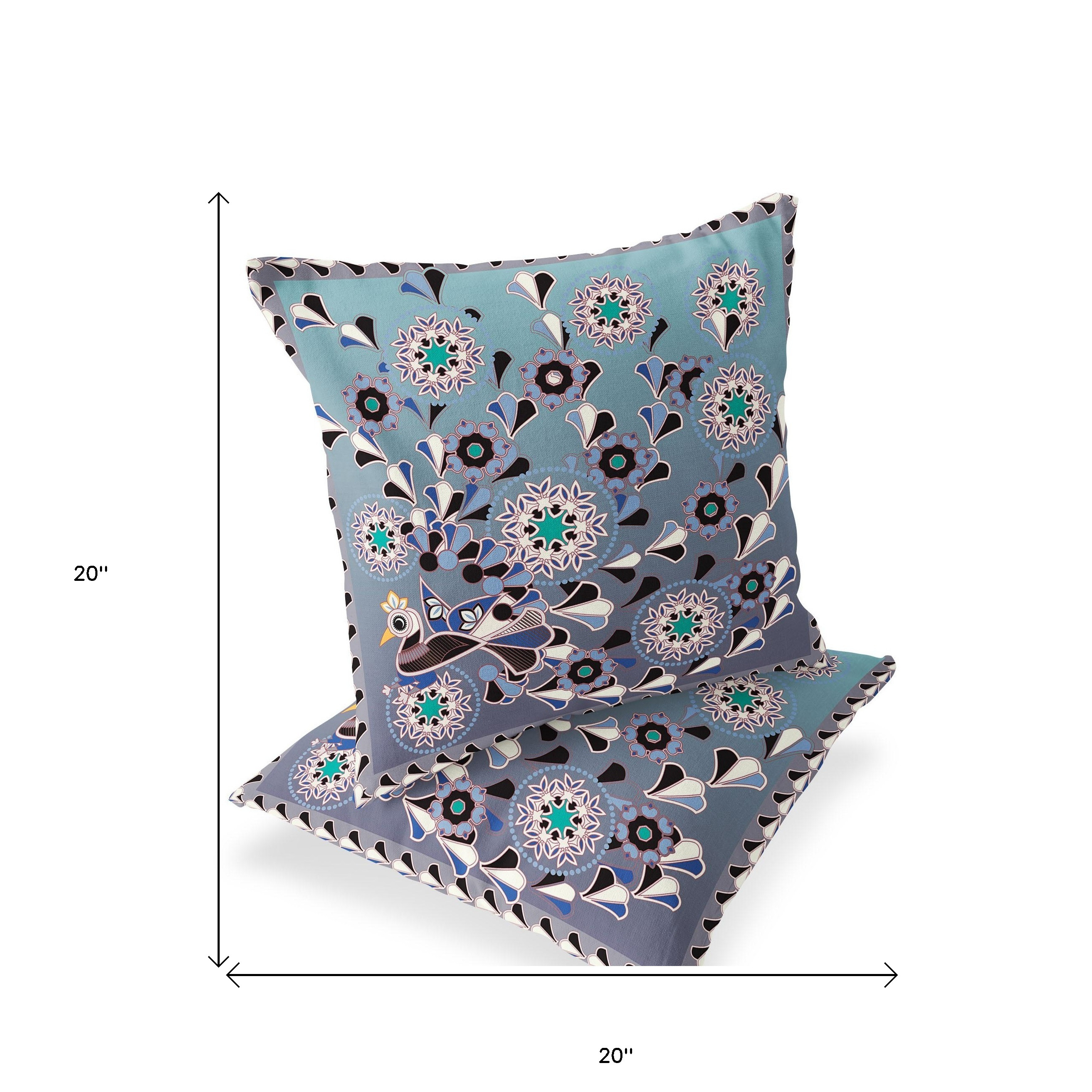 Glory of Flowers Peacock Indoor/Outdoor Set of 2 Pillows in Purple Blue Gray