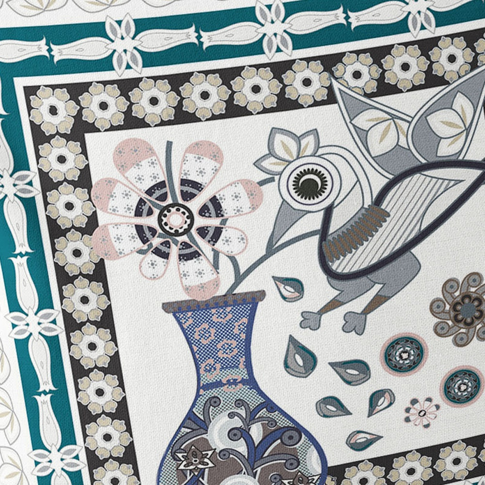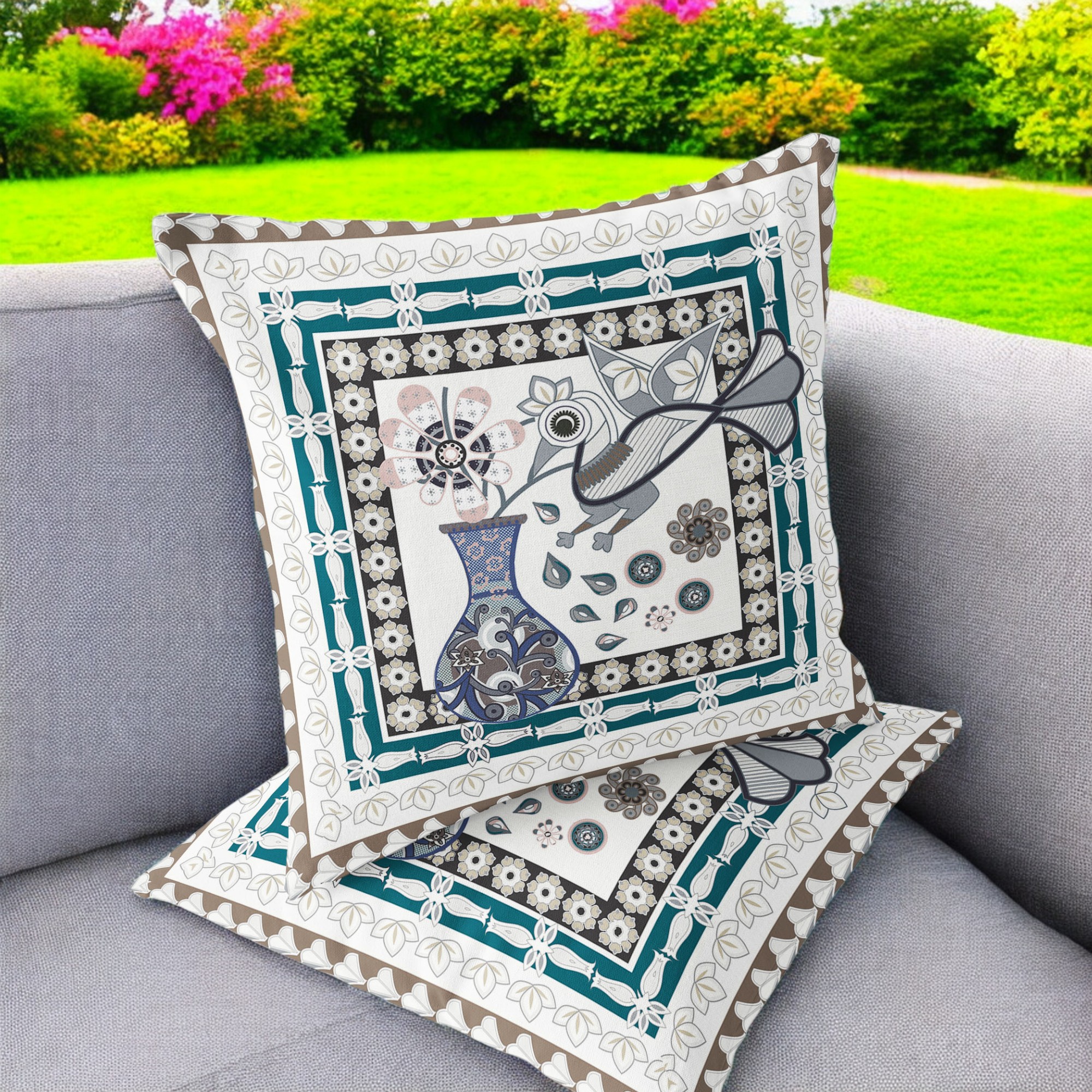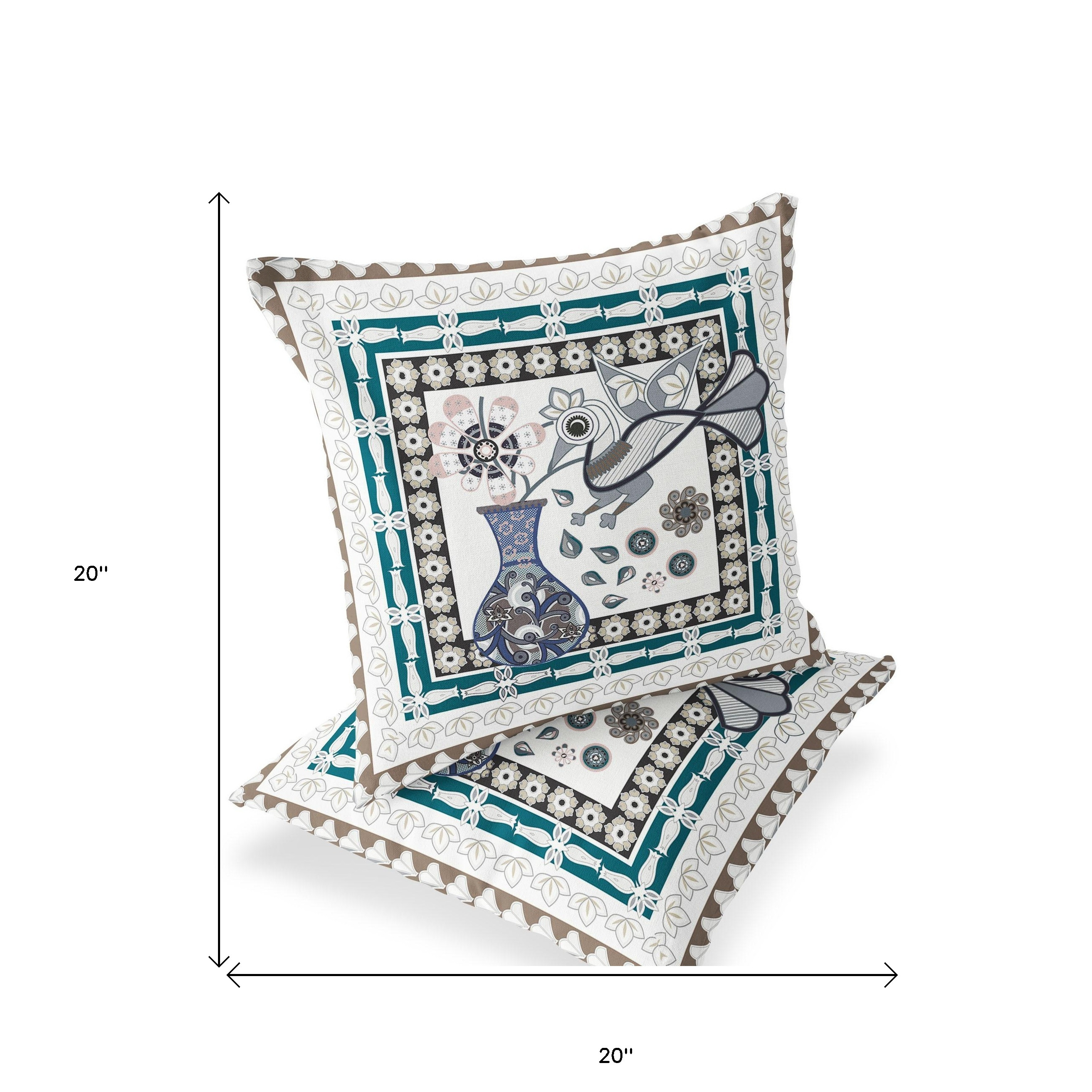 Love Your Vase Peacock Indoor/Outdoor Set of 2 Pillows in Off-White Dark Aqua Beige