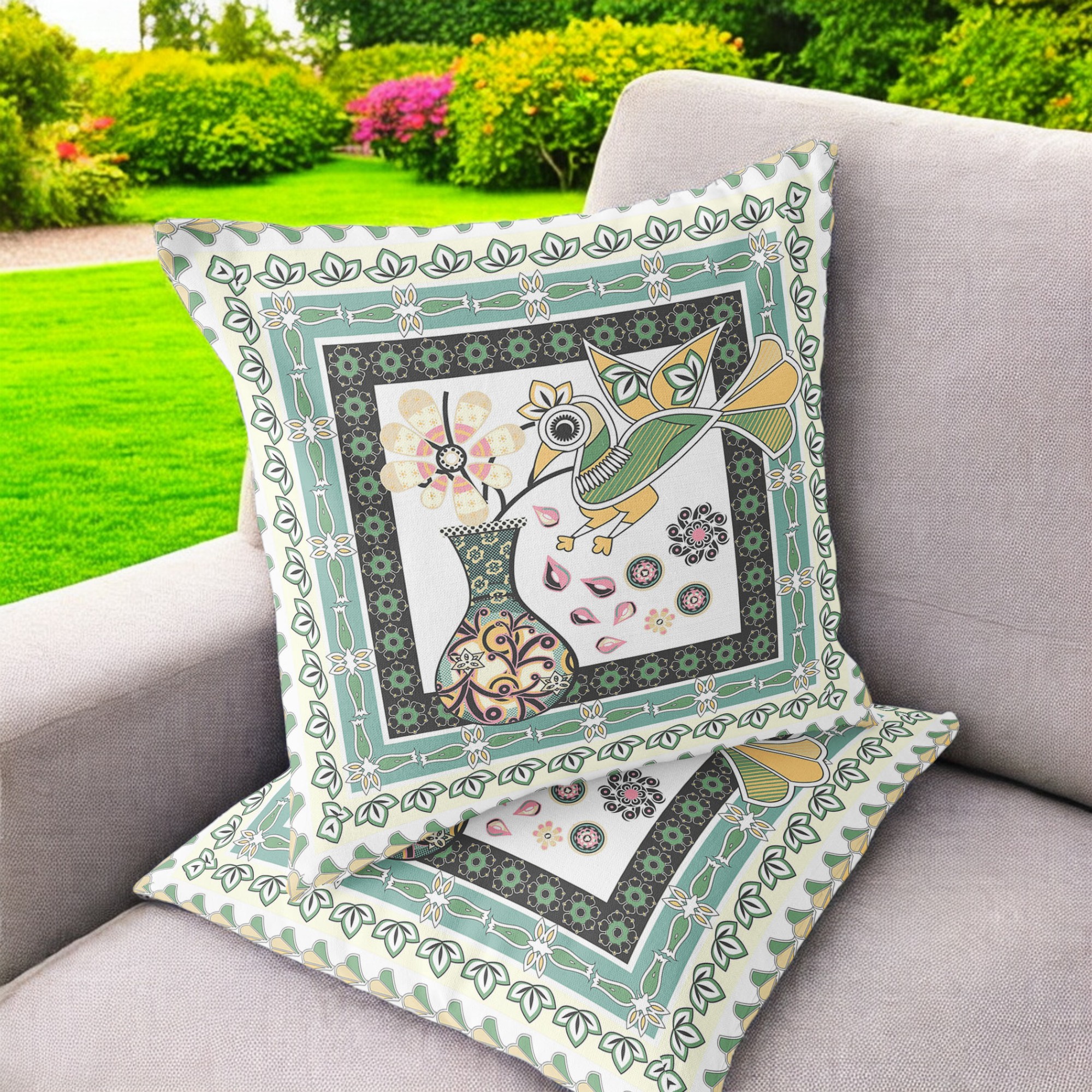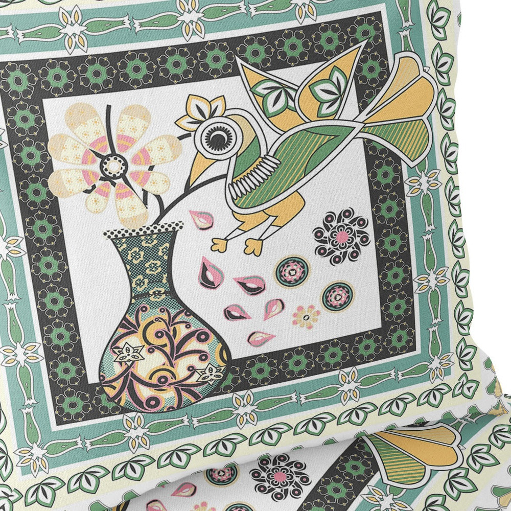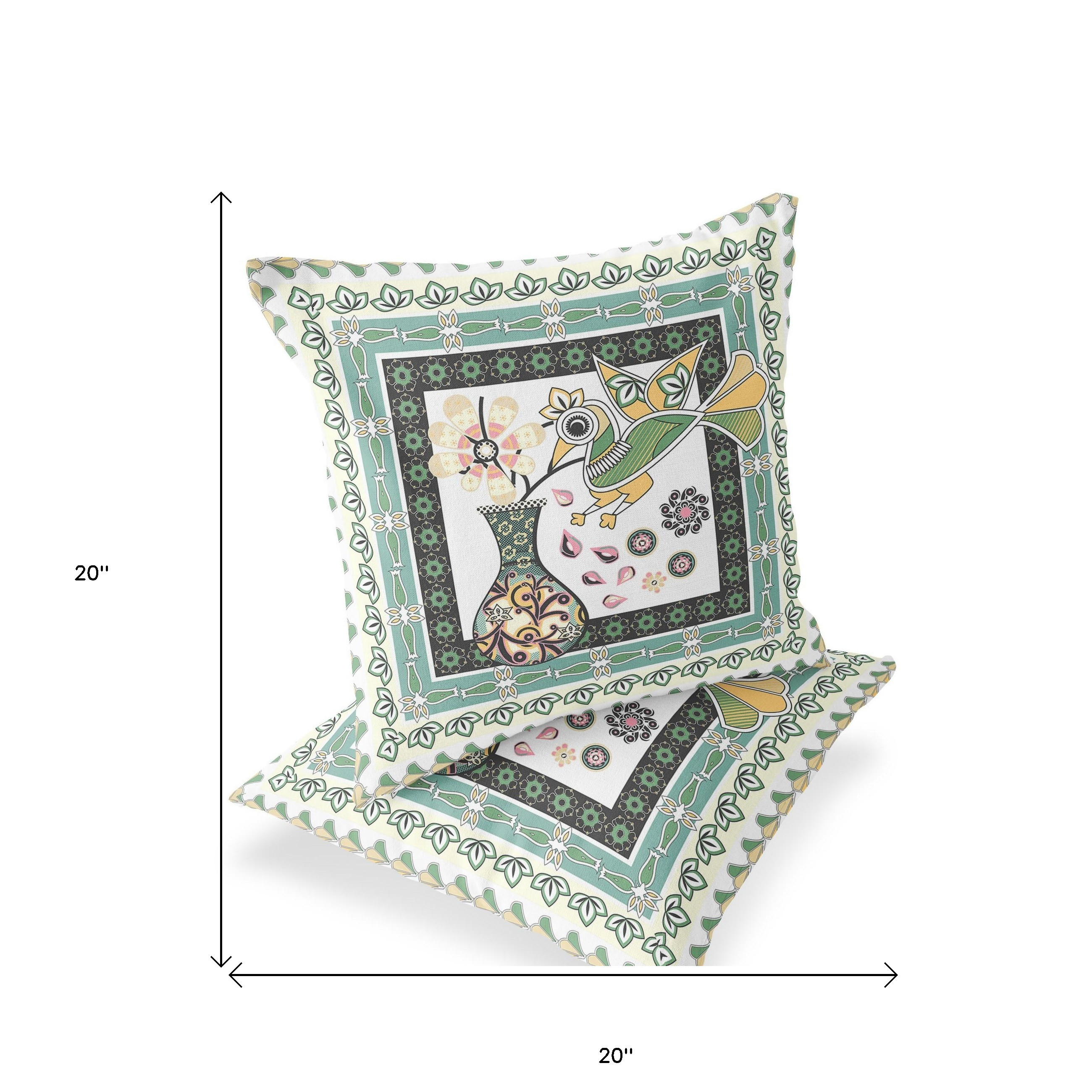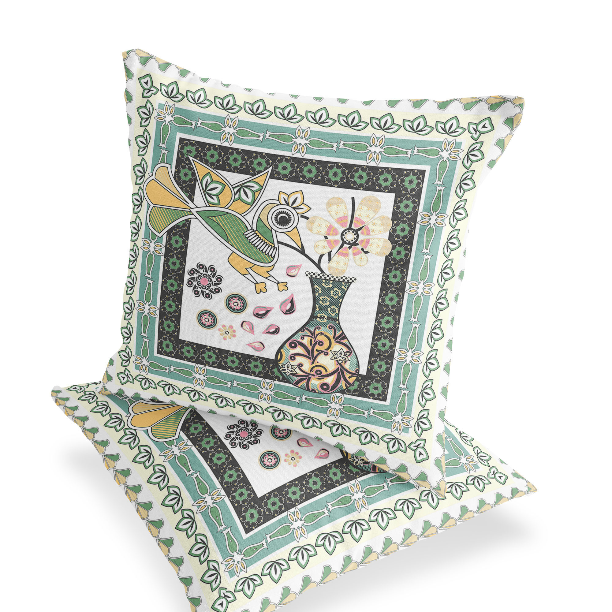 Love Your Vase Peacock Indoor/Outdoor Set of 2 Pillows in White Black Yellow Green