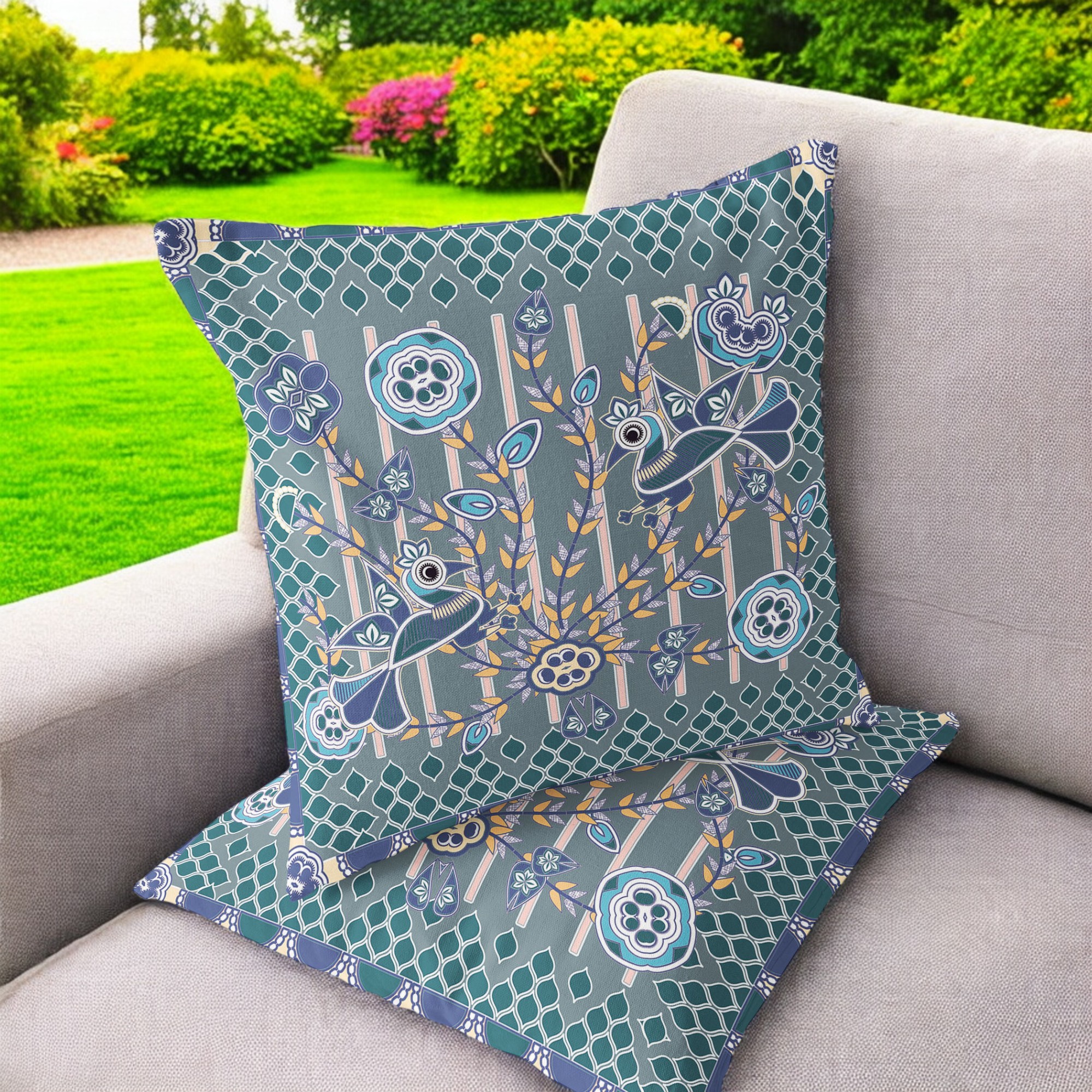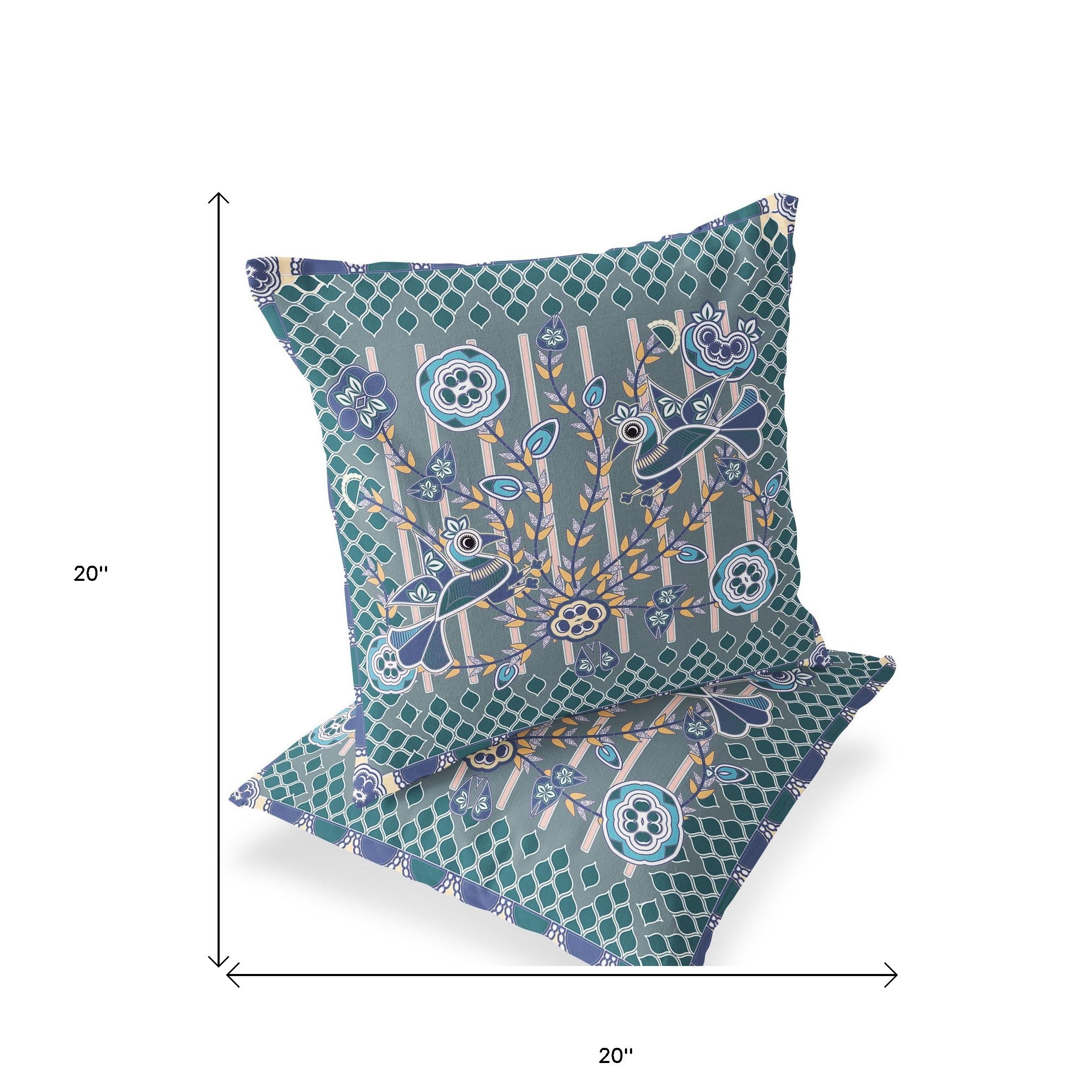 Pond Peacock Indoor/Outdoor Set of 2 Pillows in Gray Muted Blue Light Blue