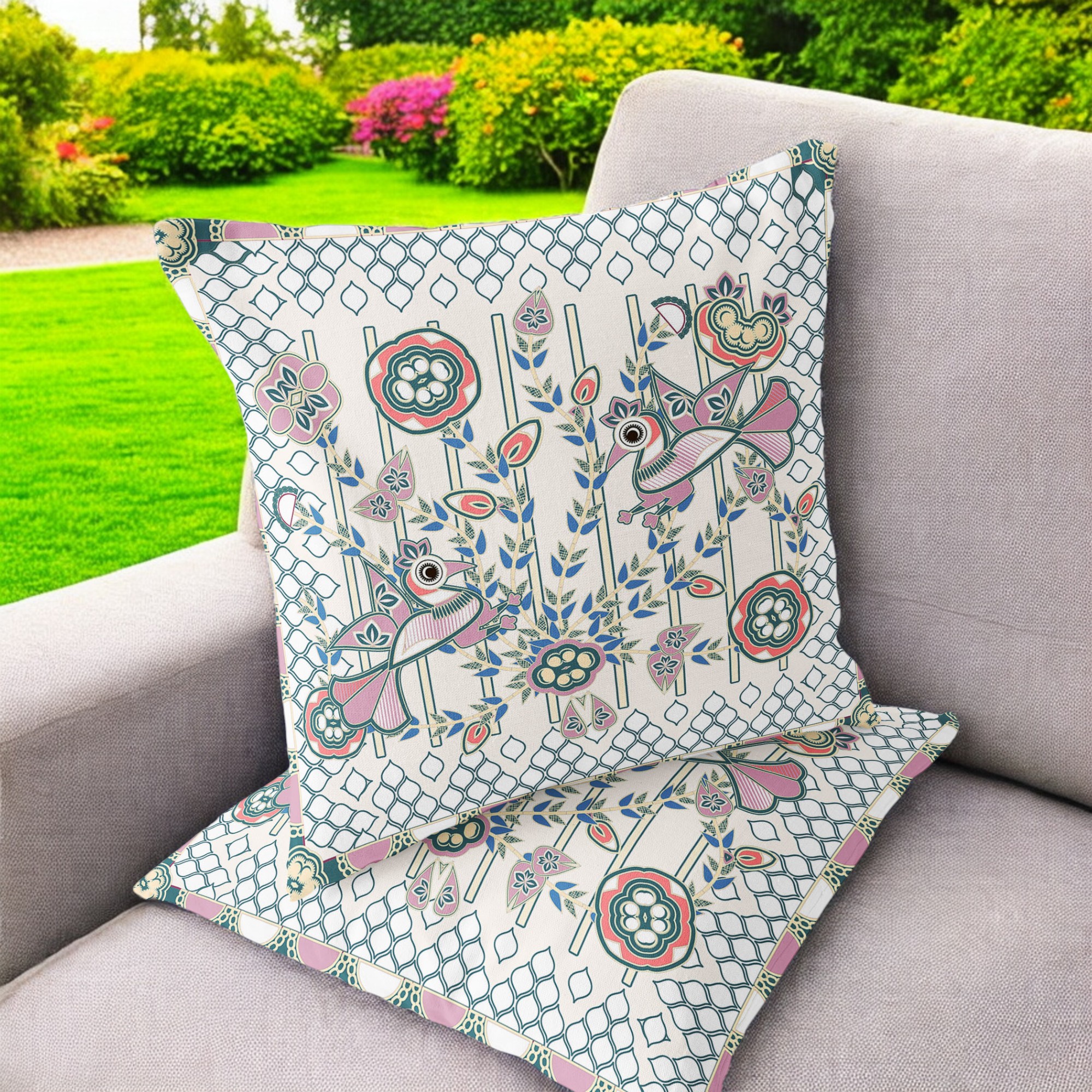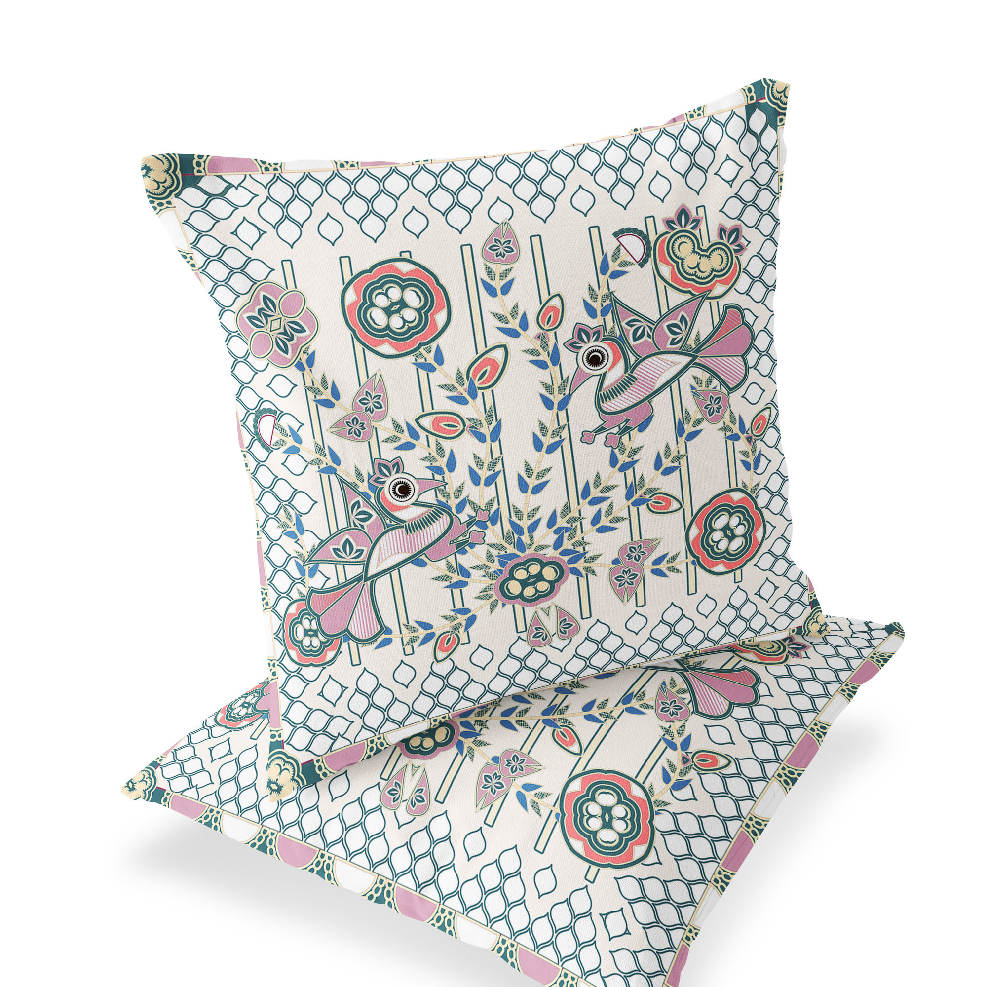 Pond Peacock Indoor/Outdoor Set of 2 Pillows in Off-White Orange Blue Green