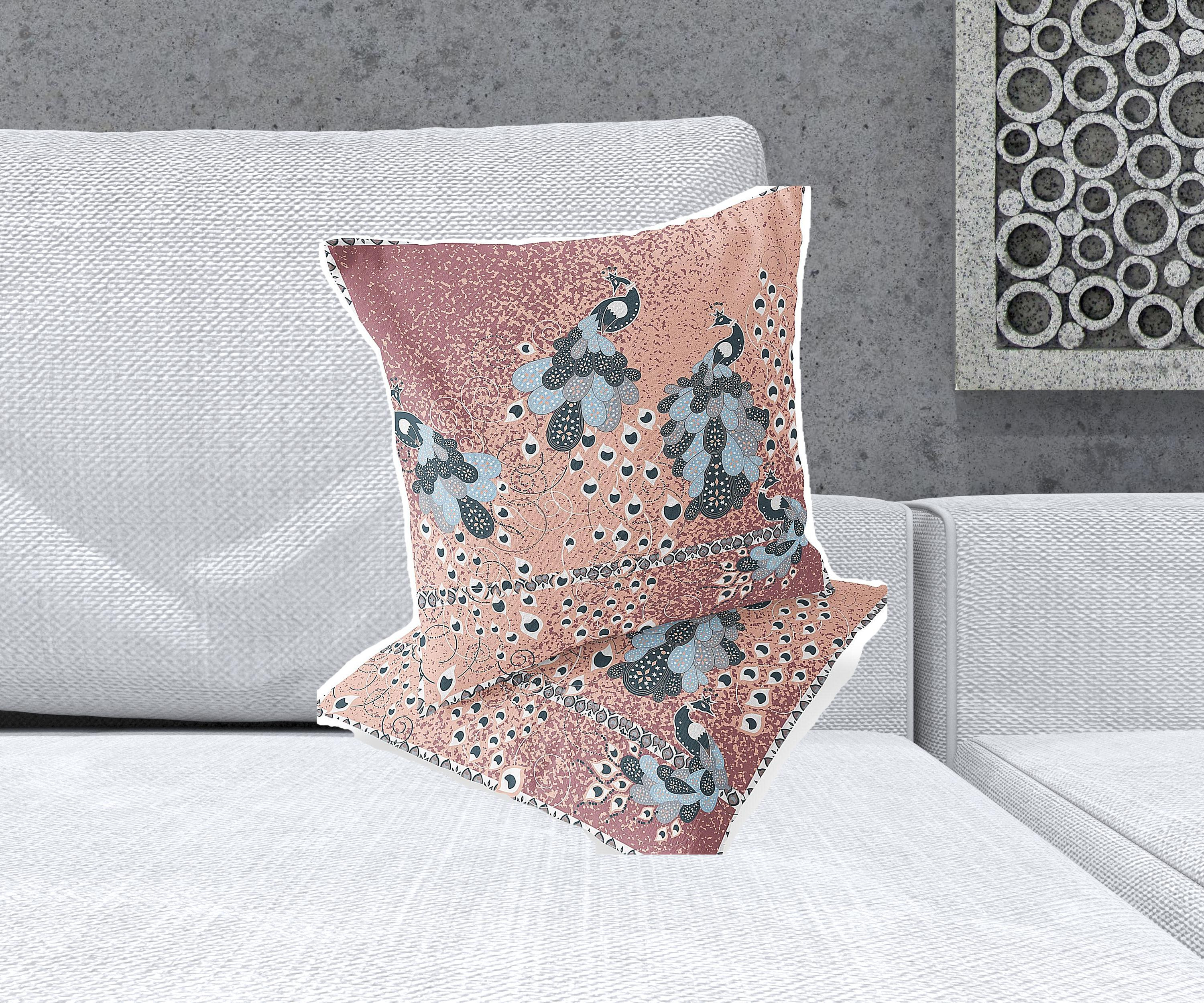Painted Peacock Indoor/Outdoor Set of 2 Pillows in Blue on Muted Magenta