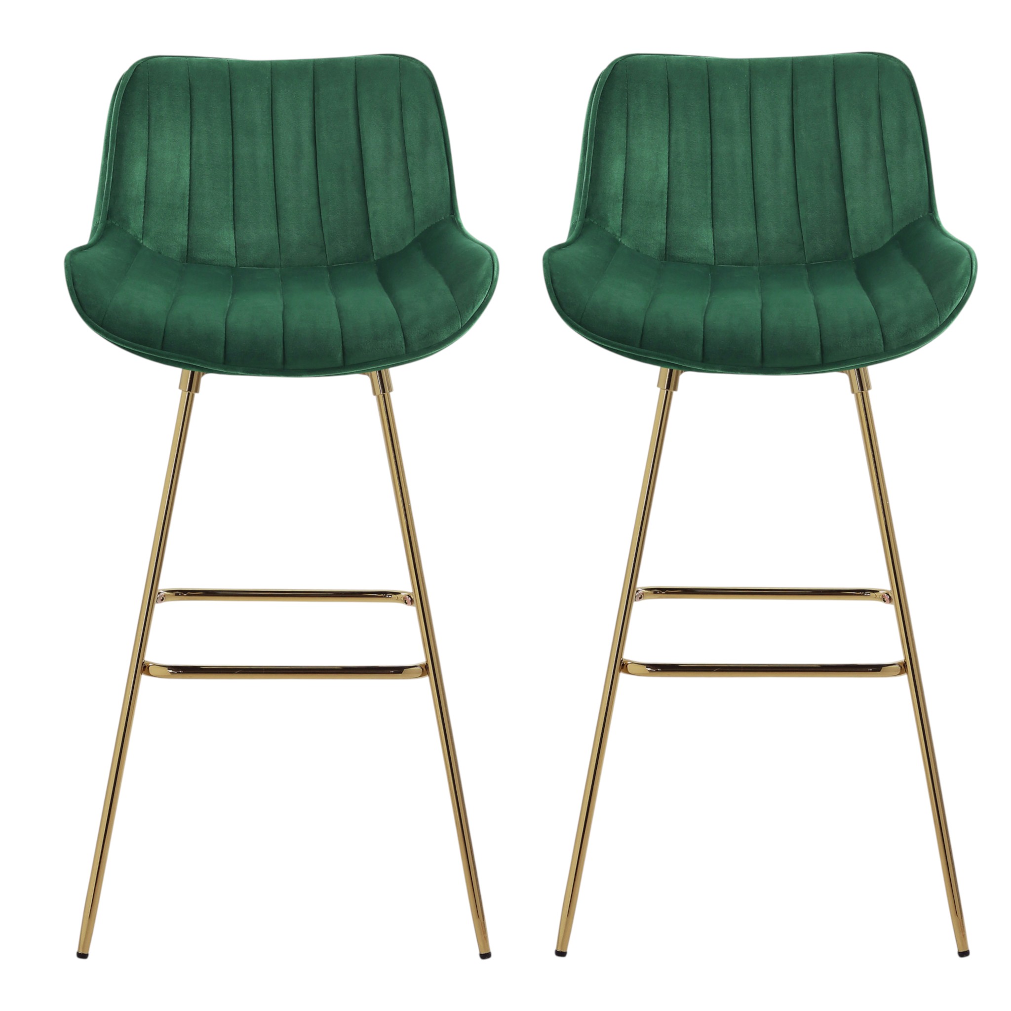 Comfortable enough to sit in for awhile, this set of two 29-inch green and gold velvet and metal low back bar height swivel bar chairs will transcend the look of your room. The gold coloration of the high quality metal base marries nicely with the green velvet seat. Not only good looking and stylish, this chair features a bucket shaped seat and a low_back for the ultimate in comfort and enjoyment. Designed with a footrest for comfort and convenience. 38.19-inch h x 19.29-inch w x 19.09-inch d.