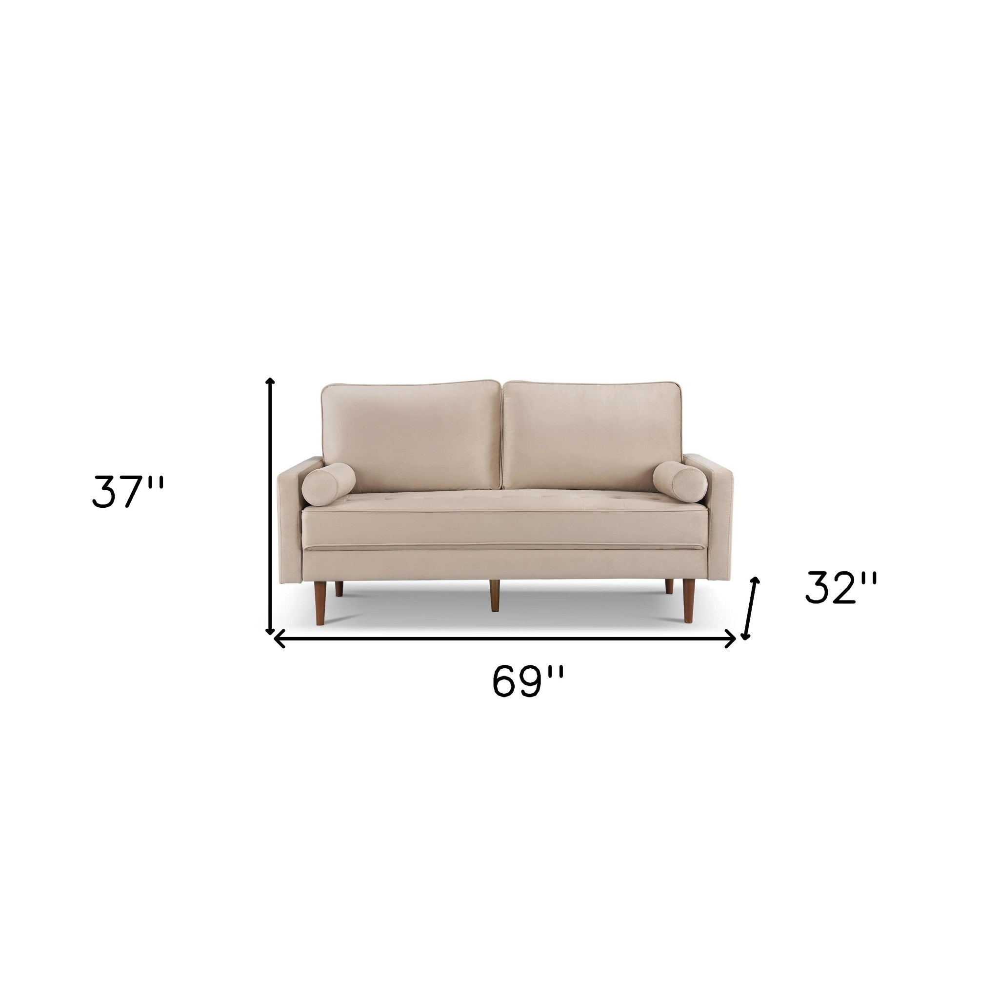 Add an air of fashion to your space with this fabulous 69-inch beige velvet sofa and toss pillows with dark brown legs. This solid color standard is made from sturdy and resilient velvet that has a warm and rich look and is a super soft and comfortable to the touch. Solid colors give you lots of decorative options and are easy to work into your decor scheme. Pocket spring construction gives this piece strong support and makes it comfortable to sit even for long periods of time. Track arms offer a comfy place to rest. The tufted stitching pattern adds visual interest and fine designer detailing. Dark brown solid wood legs effortlessly elevate the room and add a touch of contemporary design. Built to last, this sofa will be a great centerpiece for your room. 37-inch H x 69-inch W x 32-inch D