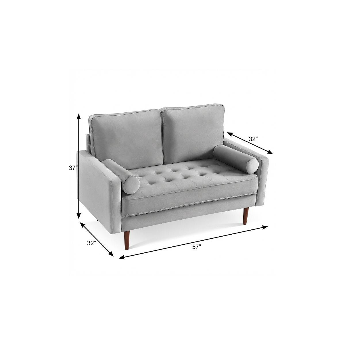 Designed for comfort and good looks, this 57-inch gray and dark brown velvet loveseat and toss pillows is a great option to anchor your space. Track arms offer a comfy place to rest and give this piece some interest and shape. The tufted cushions add visual interest and fine designer detailing. Dark brown solid wood legs effortlessly elevate the room and add a touch of contemporary design. A great showpiece for your room, this sofa is a must have. 37-inch H x 57-inch W x 32-inch D