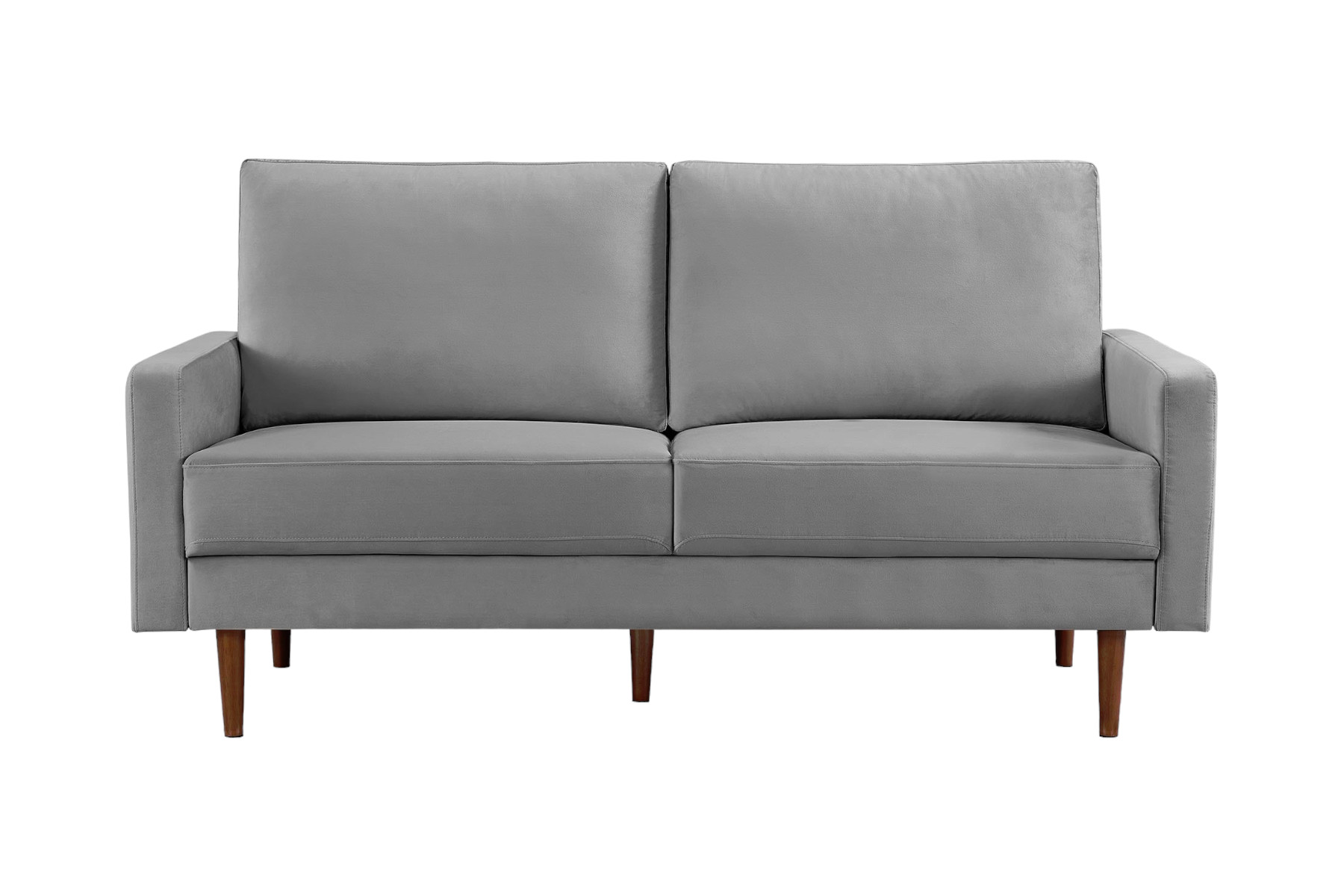 Transform your home's interior with this luxurious 69-inch gray velvet sofa with dark brown legs. This solid color standard is made from sturdy and resilient velvet that has a warm and rich look and is a super soft and comfortable to the touch. Solid colors give you lots of decorative options and are easy to work into your decor scheme. Pocket spring construction gives this piece strong support and makes it comfortable to sit even for long periods of time. Track arms offer a comfy place to rest. Dark brown solid wood legs effortlessly elevate the room and add a touch of contemporary design. Built to last, this sofa will be a great centerpiece for your room. 37-inch H x 69-inch W x 32-inch D
