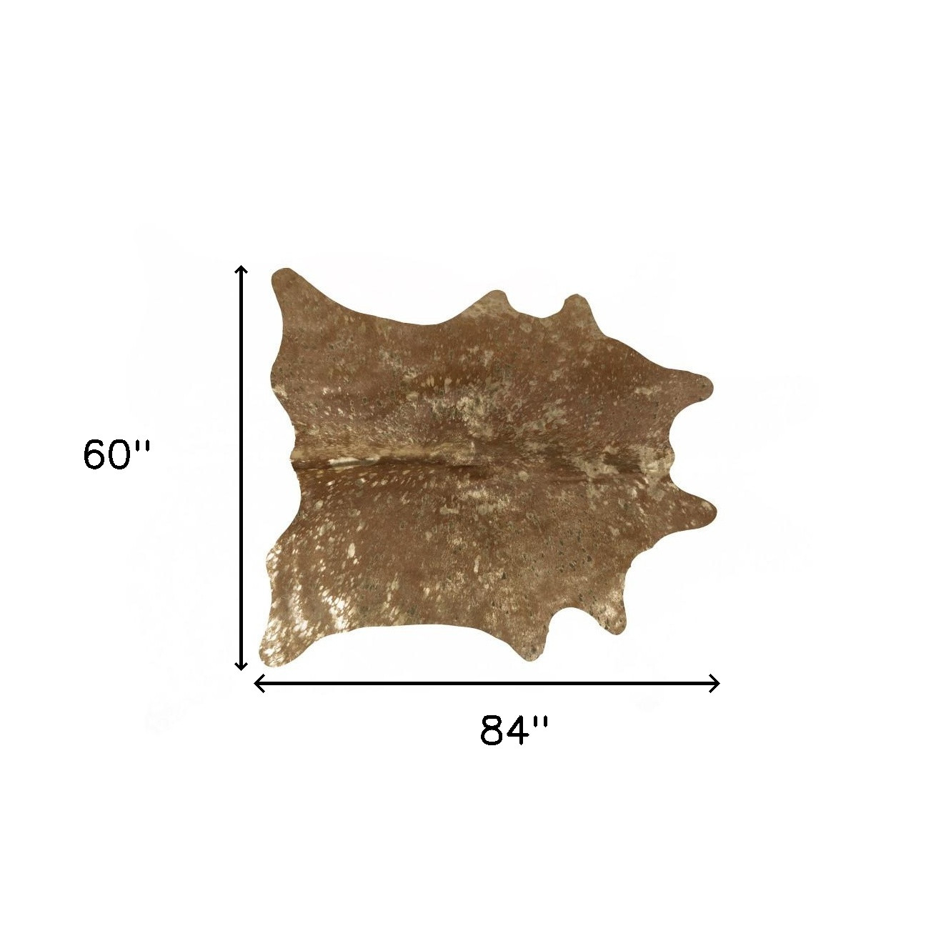 Set an inviting tone in your space with this 5-foot x 7-foot gold and brown cowhide hand knotted area rug. Crafted by skilled artisans, this hand knotted rug is genuine and unique. No two will be exactly alike. Ideal for spaces with kids and pets, this rug is stain resistant to help repel dirt and spilled liquids. This larger sized rug is ideal to create a focal point or statement piece in your room. 60-inch h x 84-inch w x 0.1-inch d