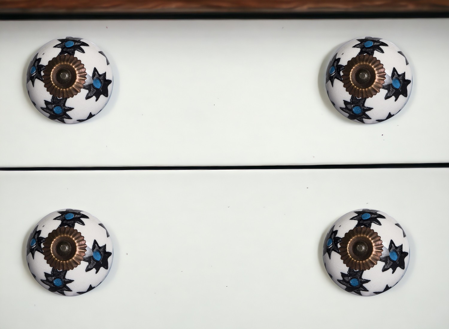 Give your drawers or cabinets a facelift with this set of eight black and white ceramic and metal drawer pull knobs. A favorite of designers and diyer's alike, these high quality round knob traditional style knobs are versatile in use and will change up the look of your existing furniture and cabinetry in a snap. Hand-painted by talented artisans, these knobs will add a touch of artisanal design. 1.5-inch h x 1.5-inch w x 1.5-inch d.