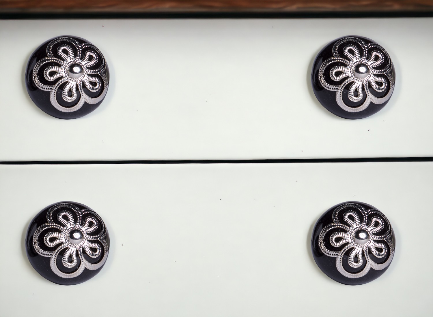 Give your drawers or cabinets a facelift with this set of eight black and silver ceramic and metal drawer pull knobs. Improve the look of your old boring or builder grade furniture and cabinetry with these high quality round knob traditional style knobs. Hand-painted by talented artisans, these knobs will add a touch of artisanal design. 1.5-inch h x 1.5-inch w x 1.5-inch d.