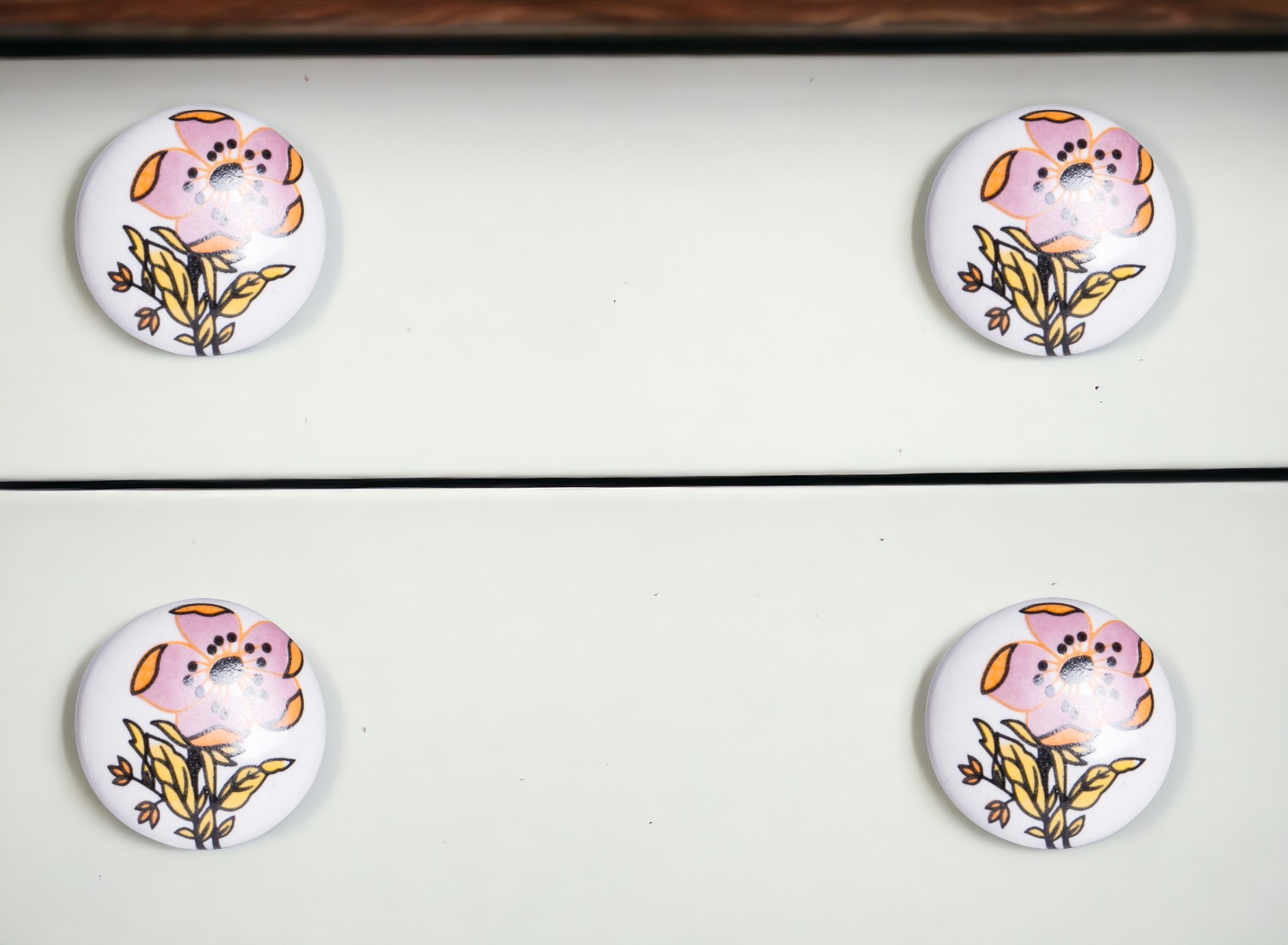 Give your drawers or cabinets a facelift with this set of eight yellow and white ceramic and metal drawer pull knobs. Improve the look of your old boring or builder grade furniture and cabinetry with these high quality round knob traditional style knobs. Hand-painted by talented artisans, these knobs will add a touch of artisanal design. 1.5-inch h x 1.5-inch w x 1.5-inch d.