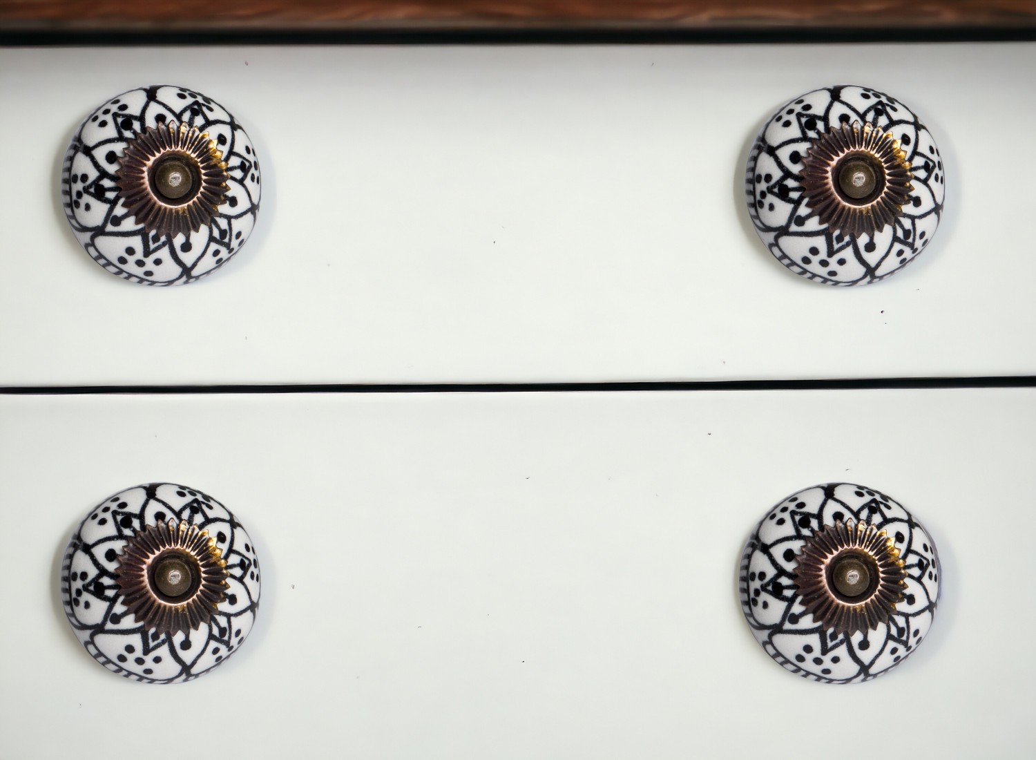 Give your drawers or cabinets a facelift with this set of eight black and white ceramic and metal drawer pull knobs. Improve the look of your old boring or builder grade furniture and cabinetry with these high quality round knob traditional style knobs. Hand-painted by talented artisans, these knobs will add a touch of artisanal design. 1.5-inch h x 1.5-inch w x 1.5-inch d.