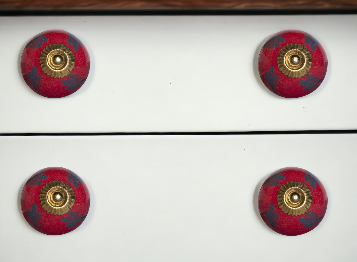 Give your drawers or cabinets a facelift with this set of eight blue and red ceramic and metal drawer pull knobs. A favorite of designers and diyer's alike, these high quality round knob traditional style knobs are versatile in use and will change up the look of your existing furniture and cabinetry in a snap. Hand-painted by talented artisans, these knobs will add a touch of artisanal design. 1.5-inch h x 1.5-inch w x 1.5-inch d.