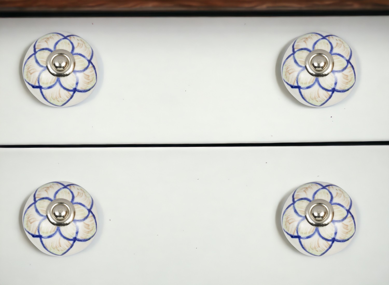 Transform your space quickly and easily with this set of eight blue and cream ceramic and metal drawer pull knobs. Improve the look of your old boring or builder grade furniture and cabinetry with these high quality round knob traditional style knobs. Hand-painted by talented artisans, these knobs will add a touch of artisanal design. 1.5-inch h x 1.5-inch w x 1.5-inch d.
