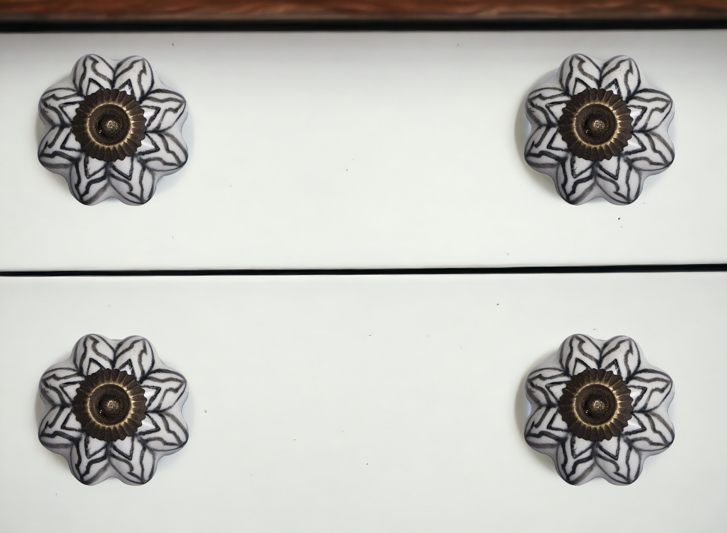 Give your drawers or cabinets a facelift with this set of eight black and white ceramic and metal drawer pull knobs. A favorite of designers and diyer's alike, these high quality round knob traditional style knobs are versatile in use and will change up the look of your existing furniture and cabinetry in a snap. Hand-painted by talented artisans, these knobs will add a touch of artisanal design. 1.5-inch h x 1.5-inch w x 1.5-inch d.