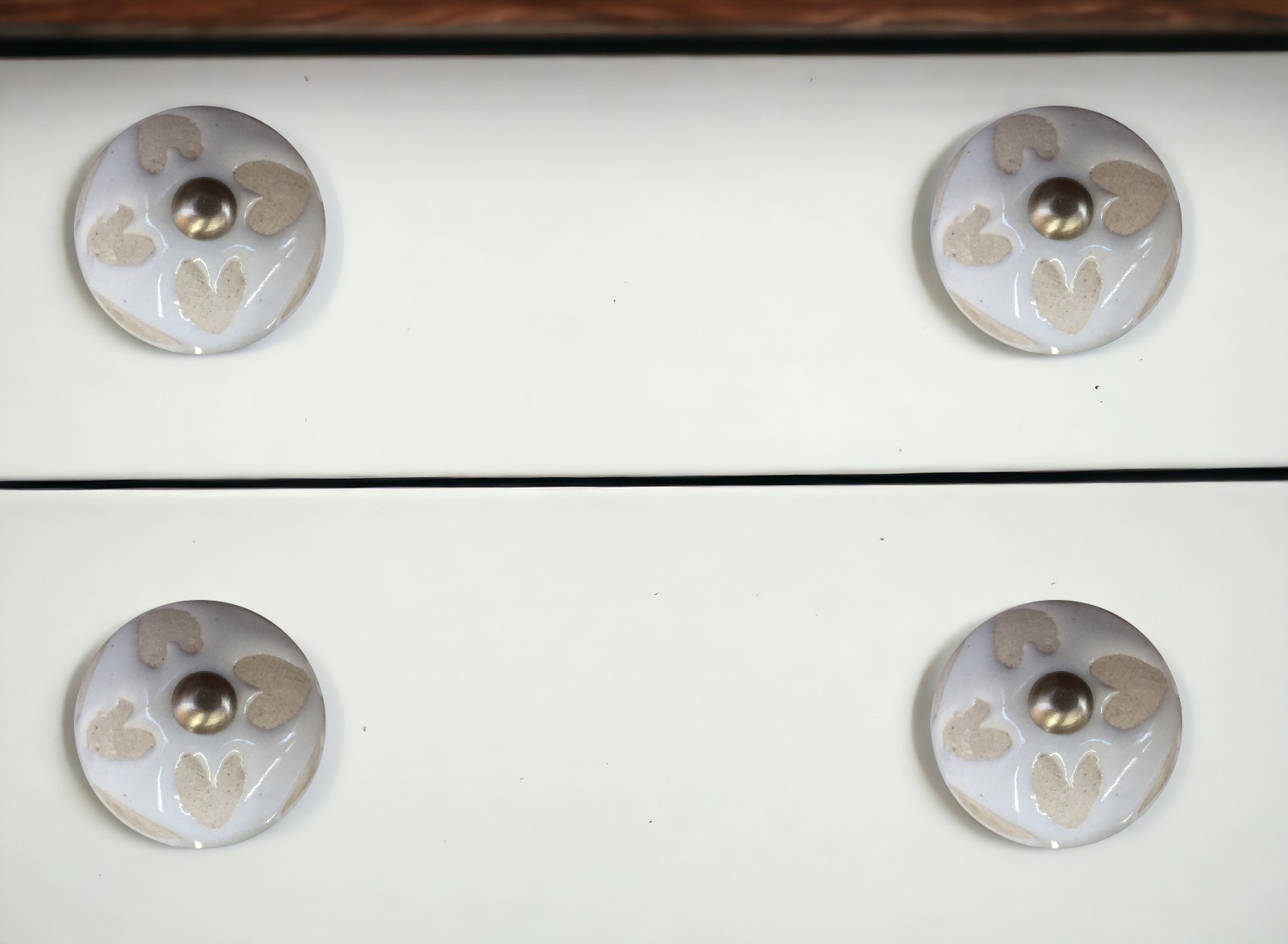 Upgrade your space with a high end look with this set of eight beige and white ceramic and metal drawer pull knobs. Improve the look of your old boring or builder grade furniture and cabinetry with these high quality round knob traditional style knobs. Hand-painted by talented artisans, these knobs will add a touch of artisanal design. 1.5-inch h x 1.5-inch w x 1.5-inch d.