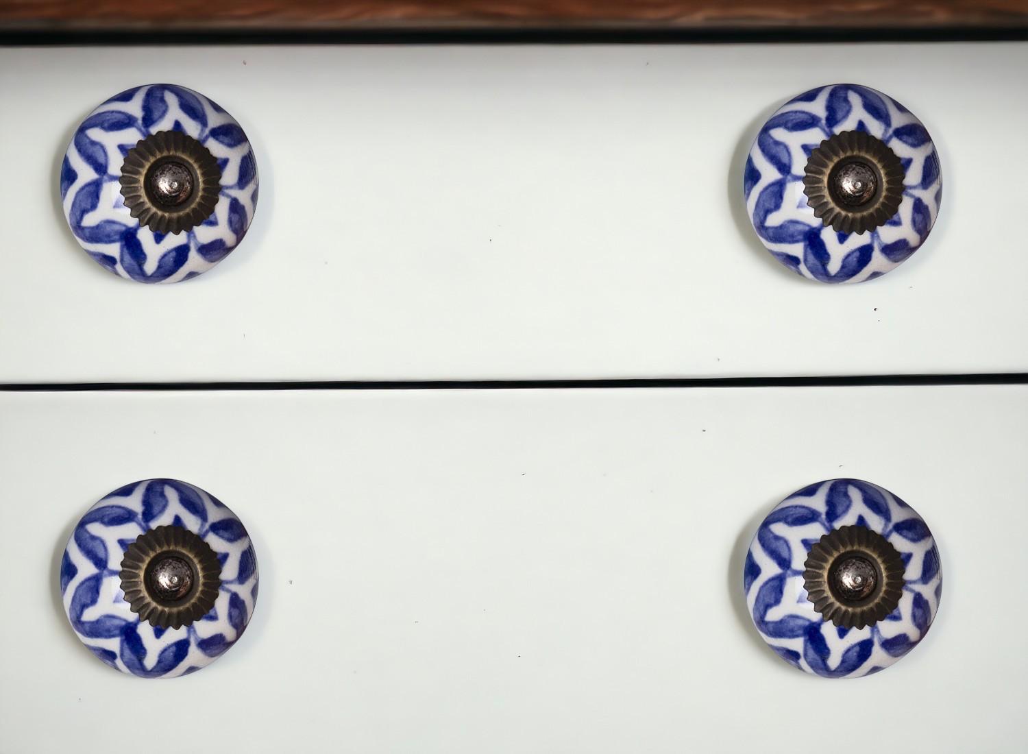 Upgrade your space with a high end look with this set of eight blue and white ceramic and metal drawer pull knobs. A favorite of designers and diyer's alike, these high quality round knob traditional style knobs are versatile in use and will change up the look of your existing furniture and cabinetry in a snap. Hand-painted by talented artisans, these knobs will add a touch of artisanal design. 1.5-inch h x 1.5-inch w x 1.5-inch d.
