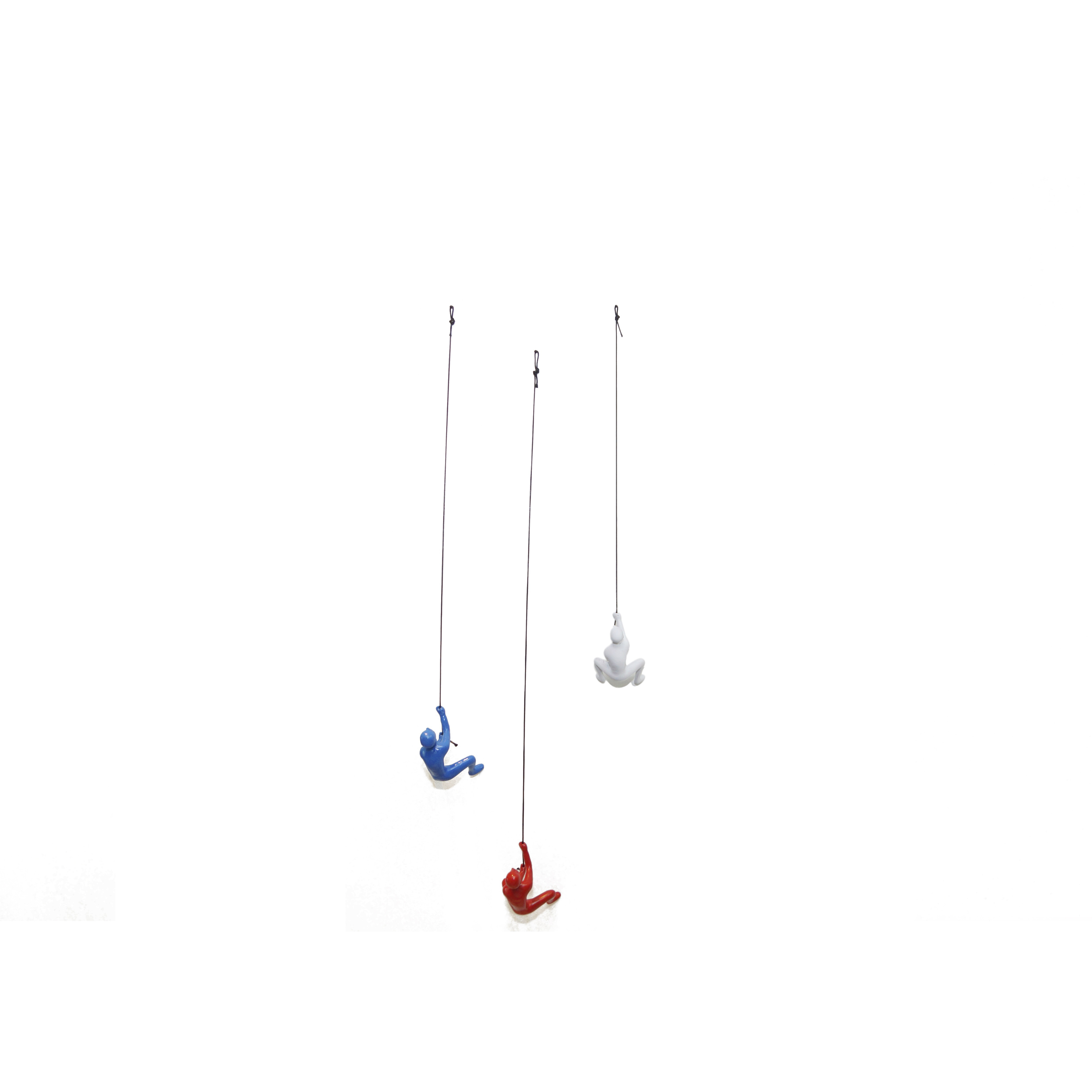Add an air of fashion to your room and rejuvenate the space with this set of three blue red and white people resin novelty hanging dimensional sculpture. This super cool wall sculpture set creates the illusion of men climbing on any surface from which they are hung. Made from durable resin, this striking 3D art creates an eye-catching and conversation starting decor. 6-inch h x 3-inch w x 3-inch d.