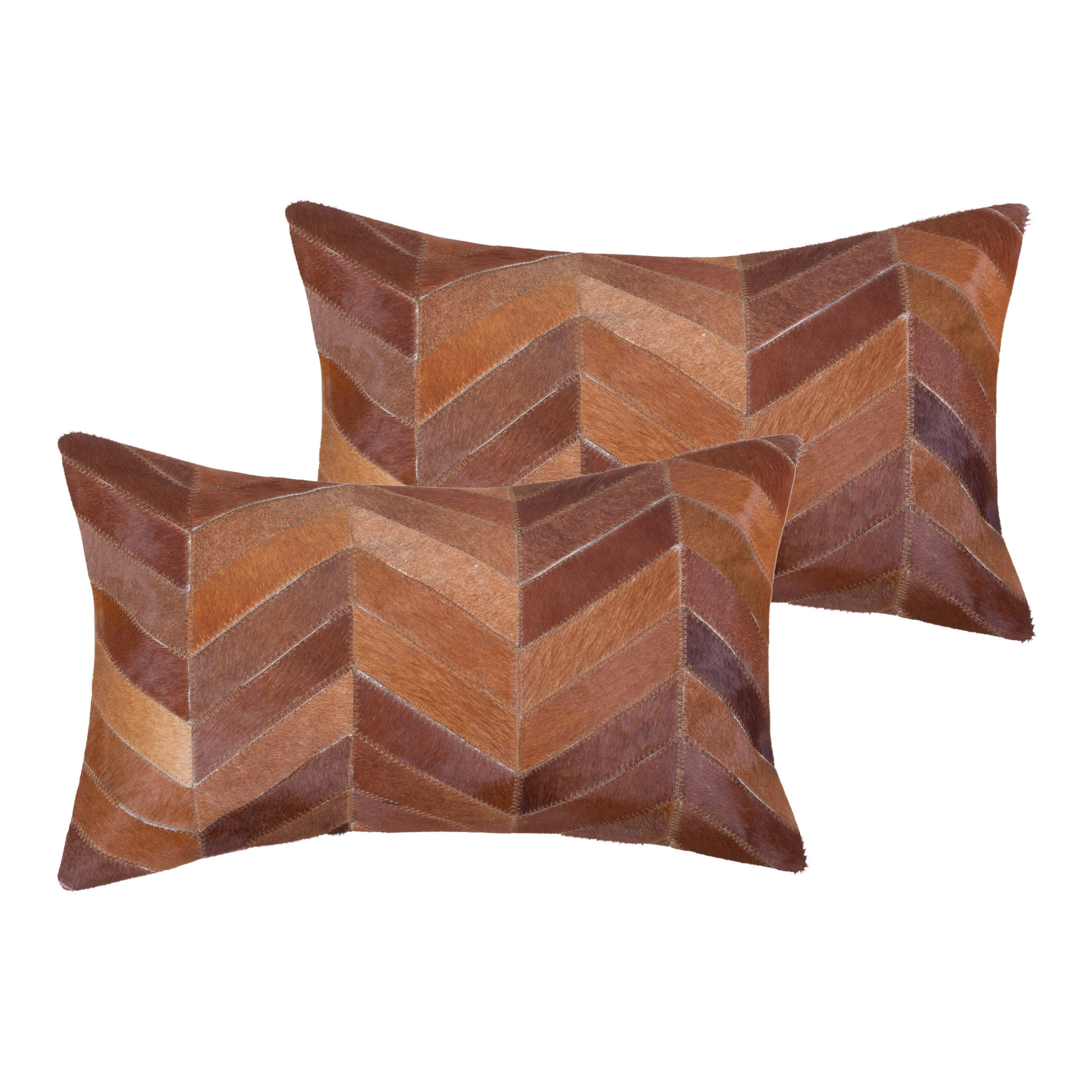 This set of two 12-inch x 20-inch tan chevron cowhide lumbar throw pillows will add a beautiful decorative accent to your decor. The luxurious tan coloring of the genuine cowhide on these pillows will add dimension and texture to your space. Elegantly chic, these pillows are the epitome of luxury. This soft polyfill filled pillow not only is decorative but made to be comfy and cozy all day long. For anyone that loves to decorate or accent their space with color and texture. A great decorative accessory to add color and dimension to your favorite chair, accent your sofa, or to use as part of your bed ensemble. 12-inch h x 20-inch w x 5-inch d.