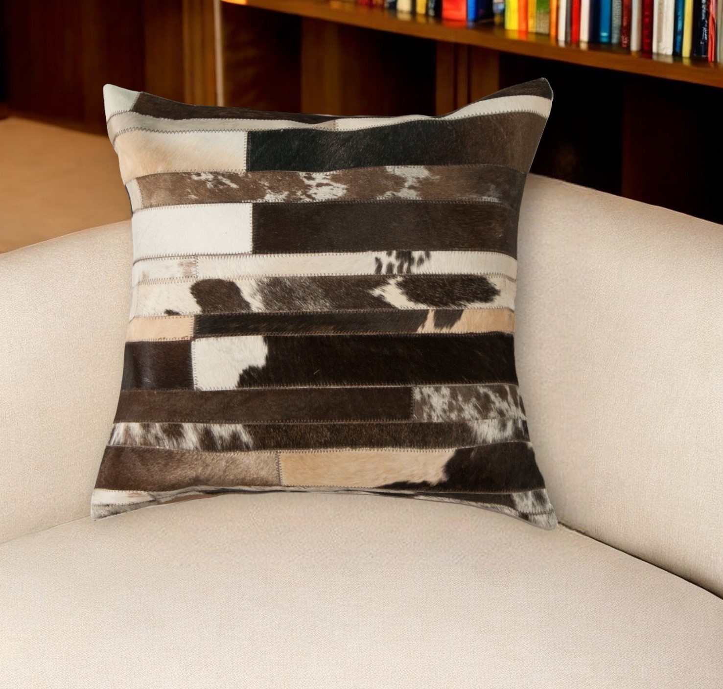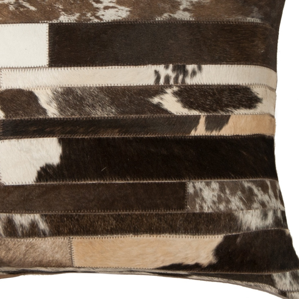 The perfect complement to your sofa, favorite chair, or bed, this 22-inch brown and white cowhide throw pillow is a great decorative accent. This luxuriously soft pillow is expertly made of high grade, genuine cowhide in a brown and white coloration. Elegantly chic, this pillow is the epitome of luxury. Super soft and built to hold its shape, this cotton-filled pillow is a great option. Great to use on its own or mix with other decorations for the perfect look. Decorative throw pillows not only add color and dimension to your space but can be comfy and supportive when you are lounging and cuddling as well. 22-inch h x 22-inch w x 5-inch d.