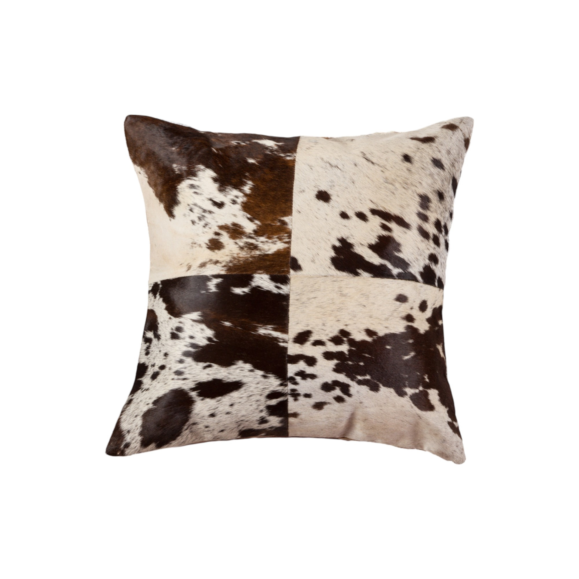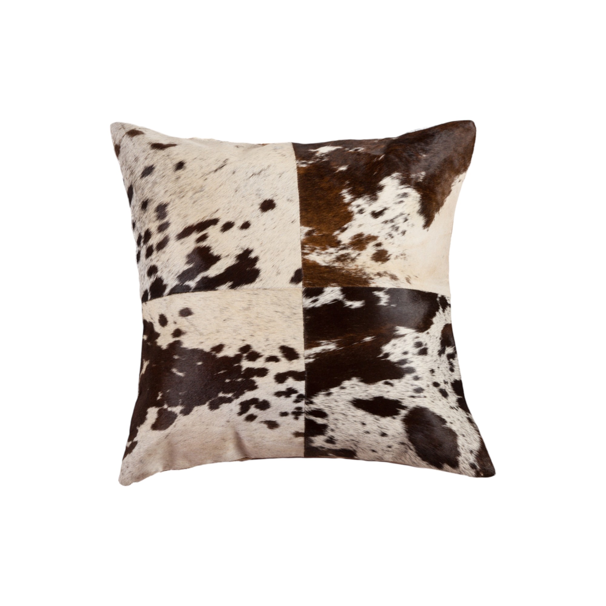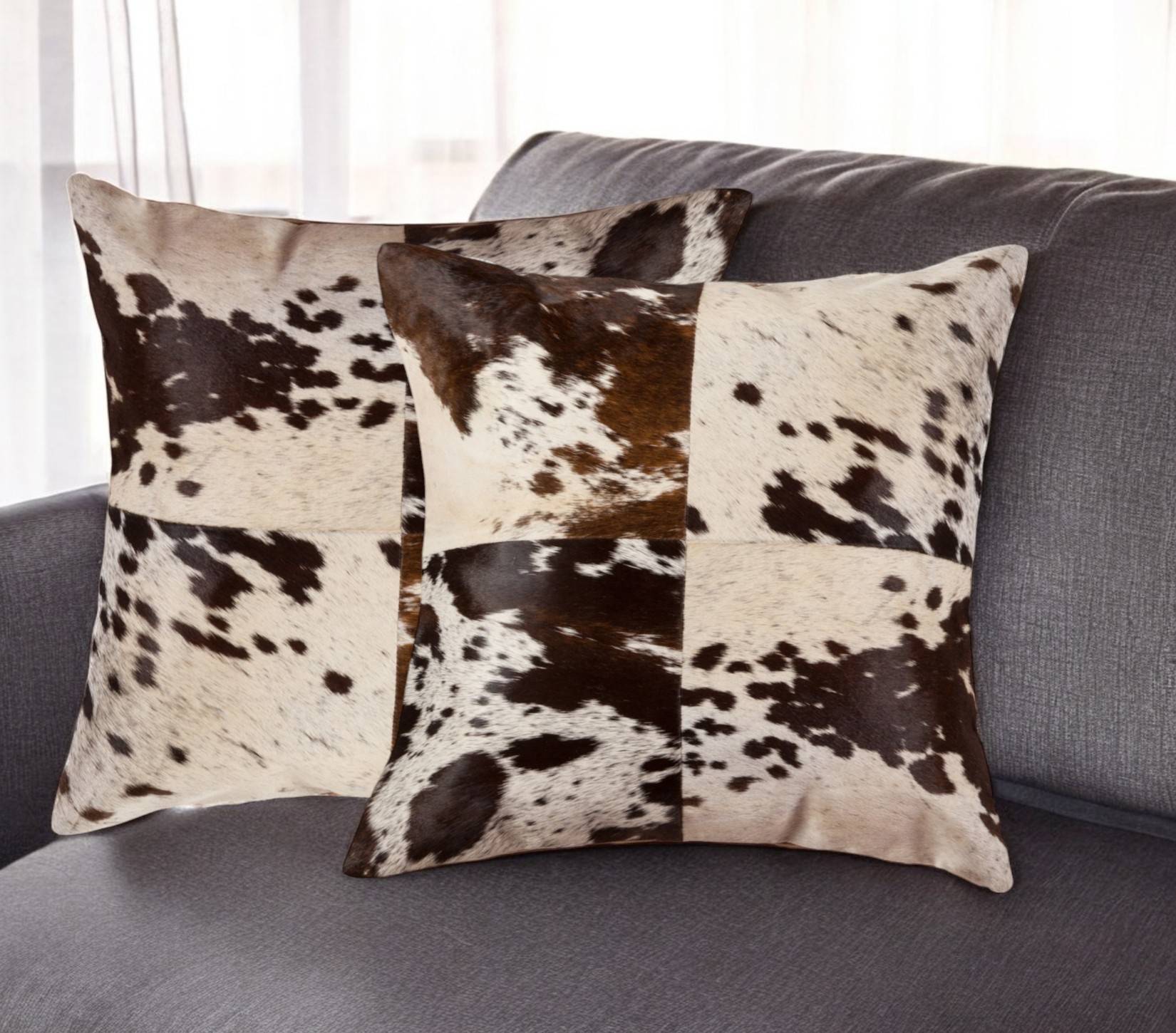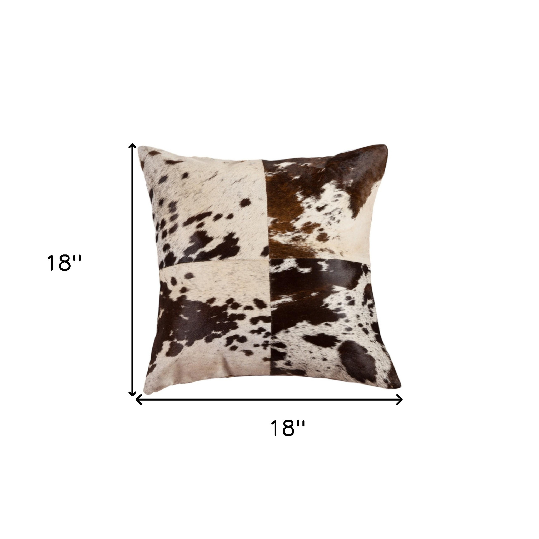 The set of two 18-inch chocolate and white cowhide cowhide throw pillows is the perfect decorative accessory for your home. Indulge in a bit of luxury with these chocolate and white colored decorative pillows covered with high grade, genuine cowhide. Elegantly chic, these pillows are the epitome of luxury. Super soft and built to hold its shape, this polyfill-filled pillow is a great option. Great to use on its own or mix with other decorations for the perfect look. A great decorative accessory to add color and dimension to your favorite chair, accent your sofa, or to use as part of your bed ensemble. 18-inch h x 18-inch w x 5-inch d.