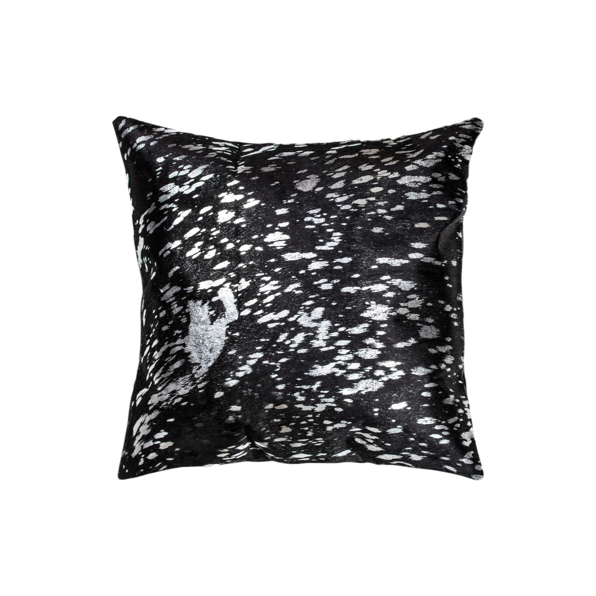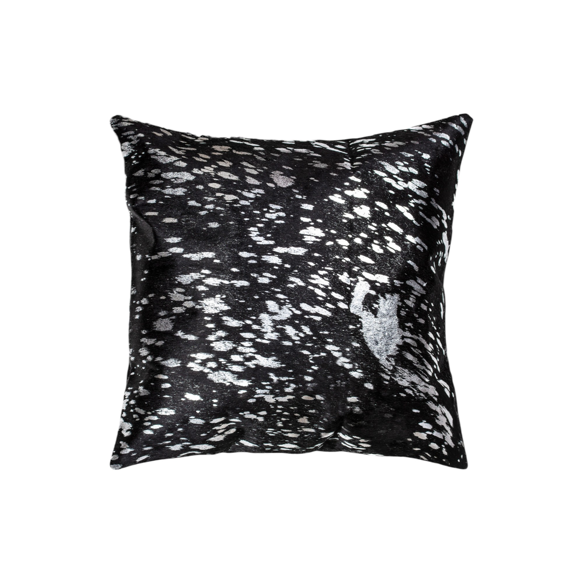 This set of two 18-inch black and silver abstract cowhide throw pillows with glitter will add a beautiful decorative accent to your decor. This luxuriously soft pillow set is expertly made of high grade, genuine cowhide in a black and silver coloration. Elegantly chic, these pillows are the epitome of luxury. This soft polyfill filled pillow not only is decorative but made to be comfy and cozy all day long. Decorative pillows are a great way to change up the look and feel of your space easily and quickly. A great decorative accessory to add color and dimension to your favorite chair, accent your sofa, or to use as part of your bed ensemble. 18-inch h x 18-inch w x 5-inch d.