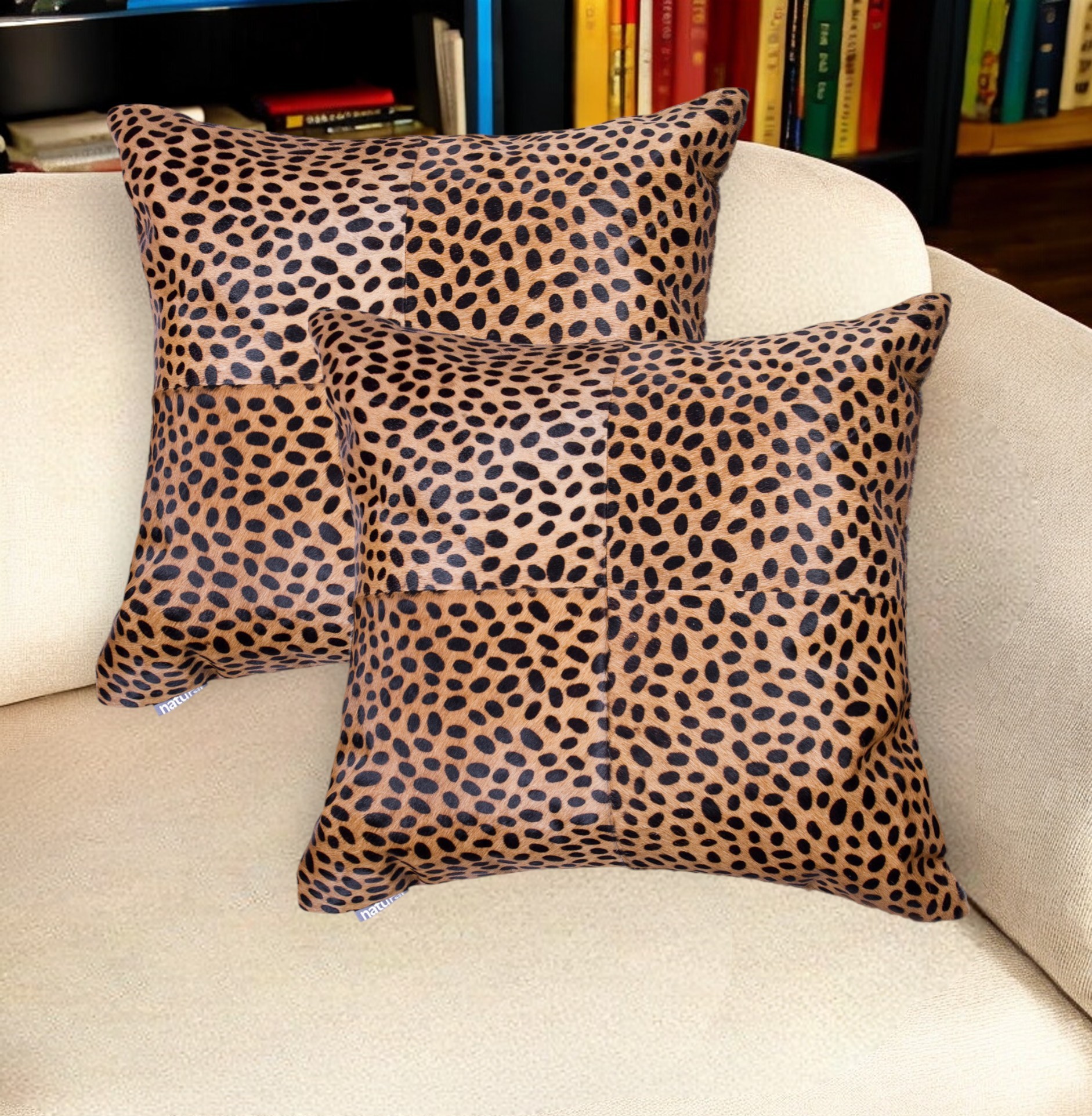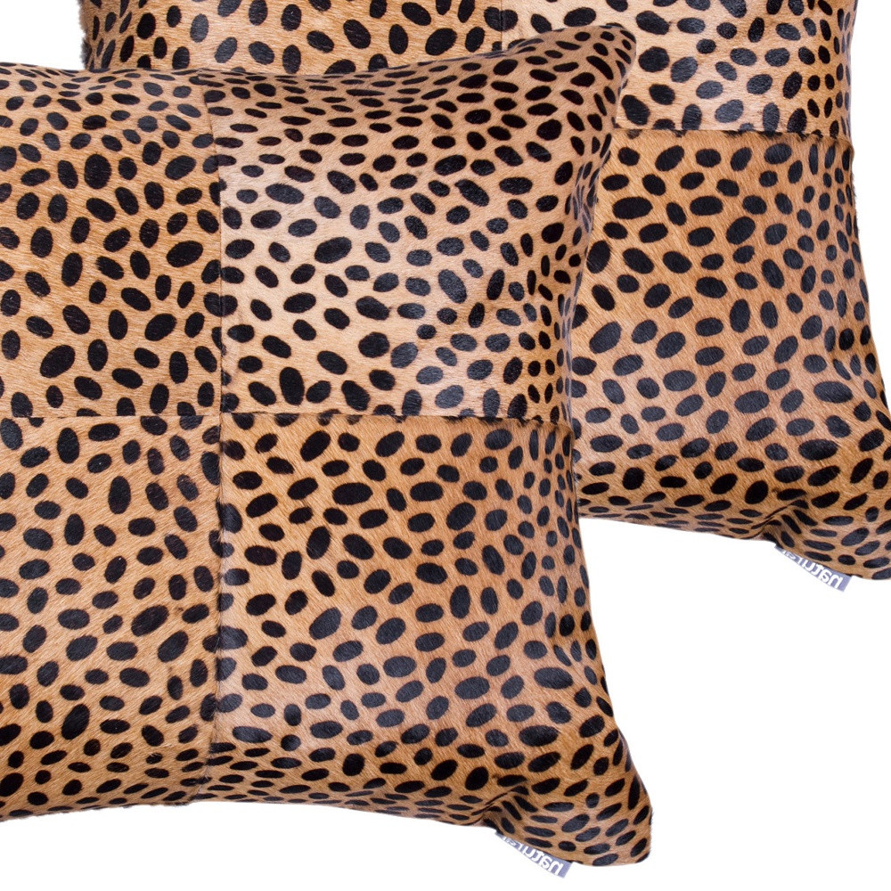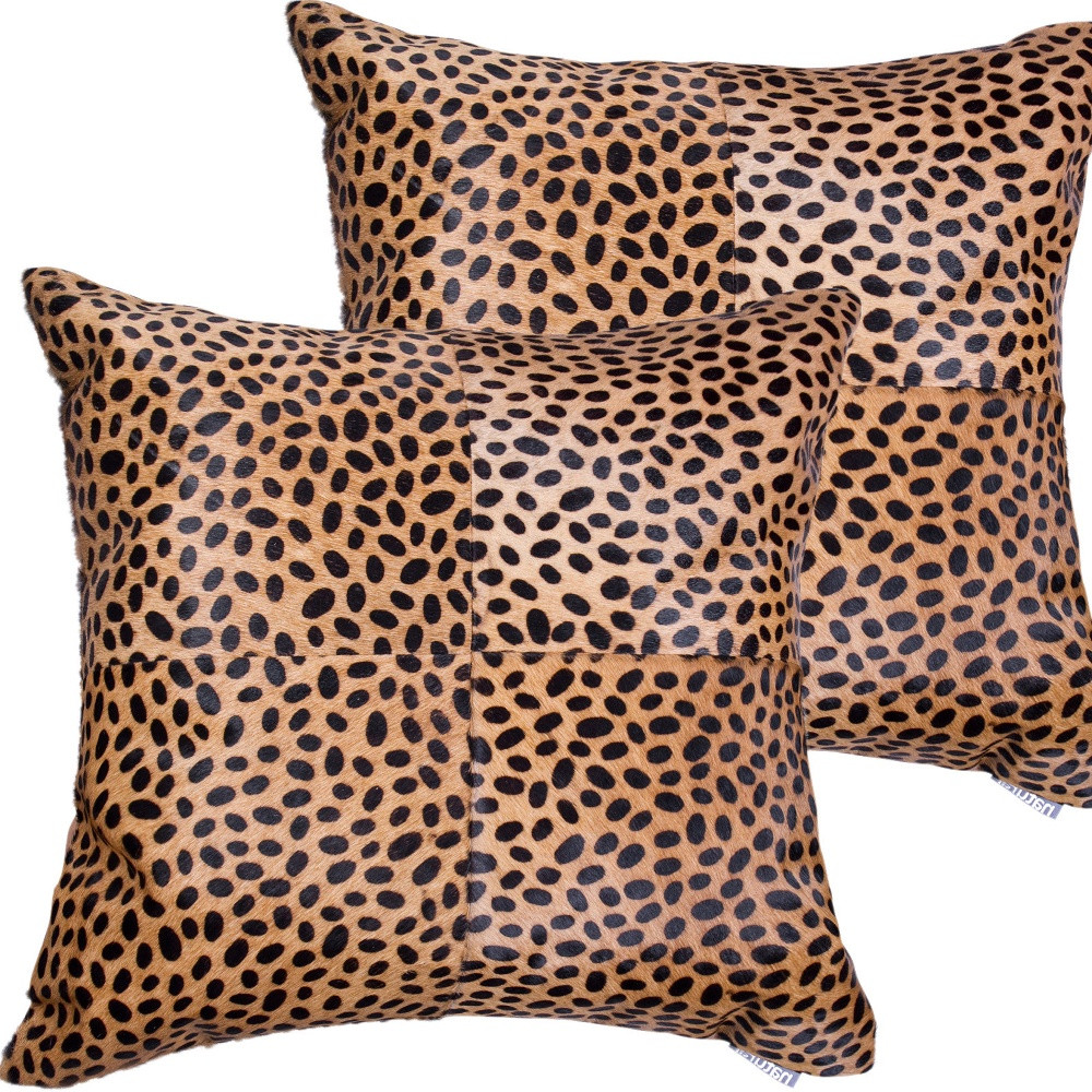 Add an air of fashion to your room and rejuvenate the space with this cute and fashionable set of two 18-inch brown and black cowhide throw pillows. This luxuriously soft pillow set is expertly made of high grade, genuine cowhide in a brown and black coloration. Elegantly chic, these pillows are the epitome of luxury. This soft cotton filled pillow not only is decorative but made to be comfy and cozy all day long. Decorative pillows are a great way to change up the look and feel of your space easily and quickly. A great decorative accessory to add color and dimension to your favorite chair, accent your sofa, or to use as part of your bed ensemble. 18-inch h x 18-inch w x 5-inch d.