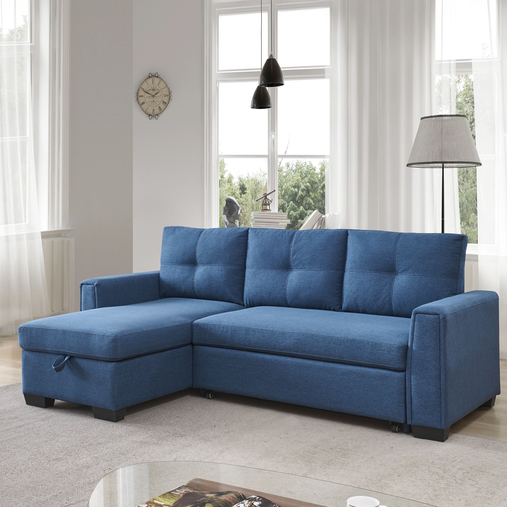 Add an air of fashion to your space with this fabulous 92-inch blue polyester blend convertible futon sleeper sofa with black legs. Built to last, this solid color convertible futon is upholstered with polyester blend that is designed to be soft, resilient, easy to maintain, and stand the test of time. Solid colors give you lots of decorative options and are easy to work into your decor scheme. Pocket spring construction gives this piece strong support and makes it comfortable to sit even for long periods of time. Removable back cushions make this sofa easy to manage. Track arms offer a comfy place to rest. Black solid wood legs effortlessly elevate the room and add a touch of contemporary design. Built to last, this sofa will be a great centerpiece for your room. 36-inch H x 92-inch W x 59-inch D