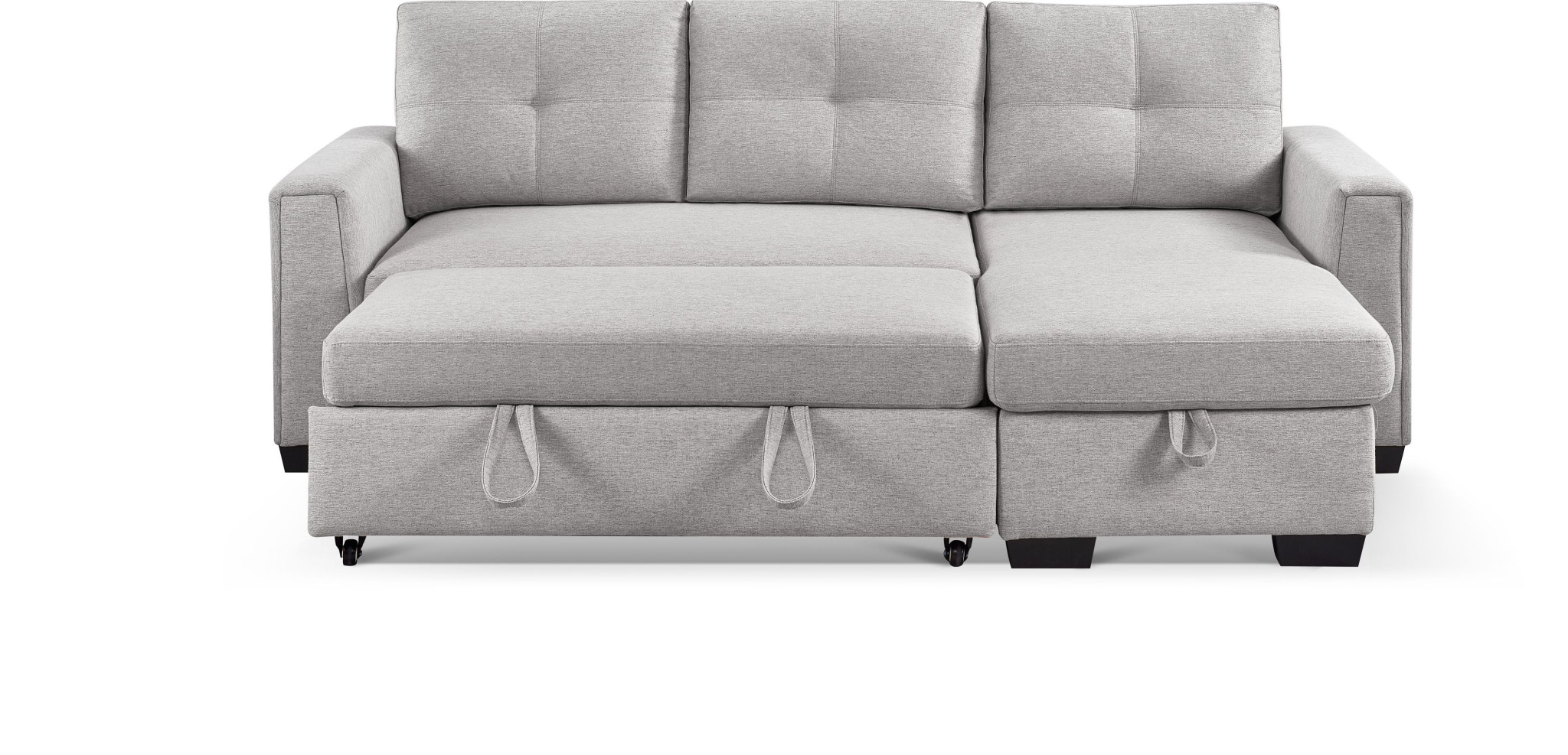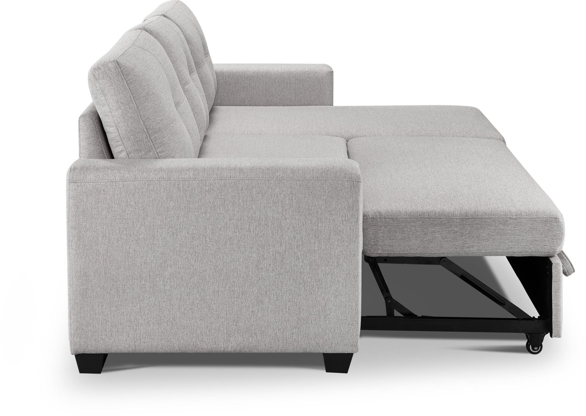 Designed for comfort and good looks, this 92-inch light gray polyester blend convertible futon sleeper sofa with black legs is a great option to anchor your space. Built to last, this solid color convertible futon is upholstered with polyester blend that is designed to be soft, resilient, easy to maintain, and stand the test of time. Solid colors give you lots of decorative options and are easy to work into your decor scheme. Pocket spring construction gives this piece strong support and makes it comfortable to sit even for long periods of time. Removable back cushions make this sofa easy to manage. Track arms offer a comfy place to rest. Black solid wood legs effortlessly elevate the room and add a touch of contemporary design. A great showpiece for your room, this sofa is a must have. 36-inch H x 92-inch W x 59-inch D