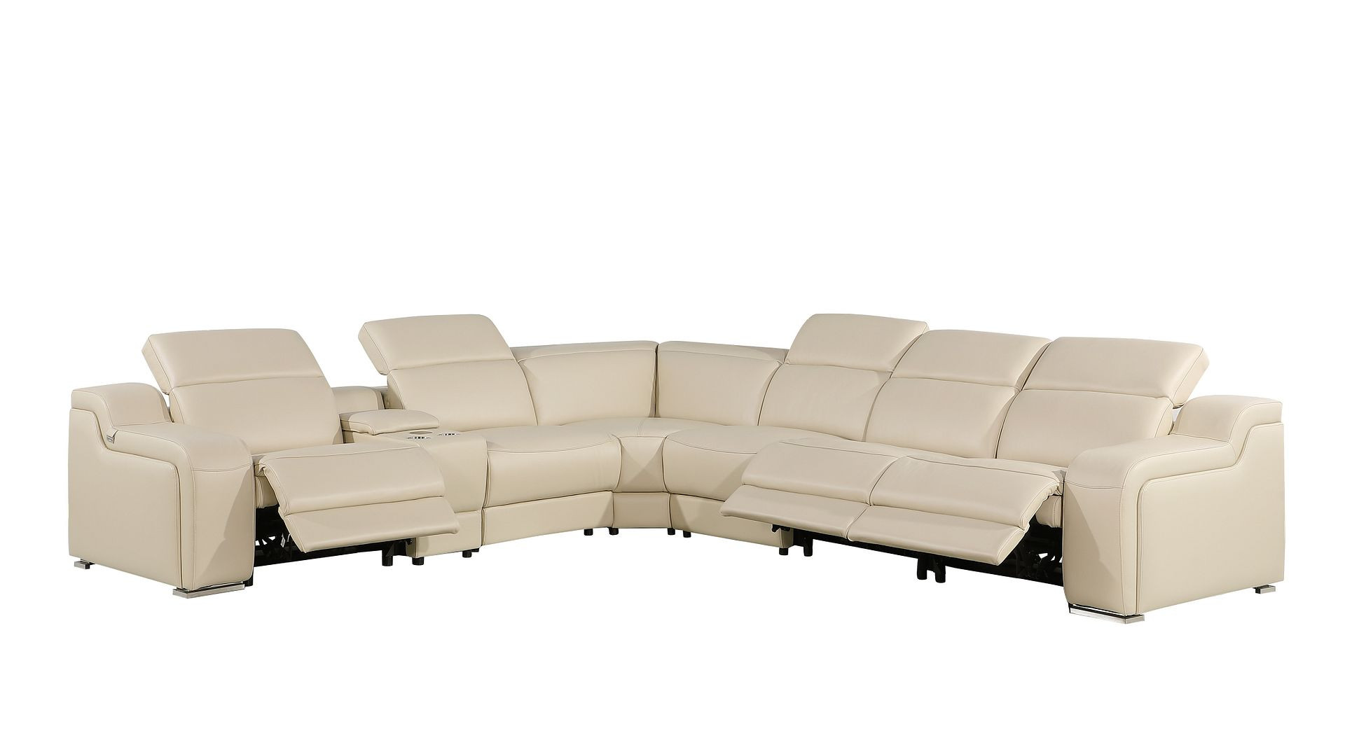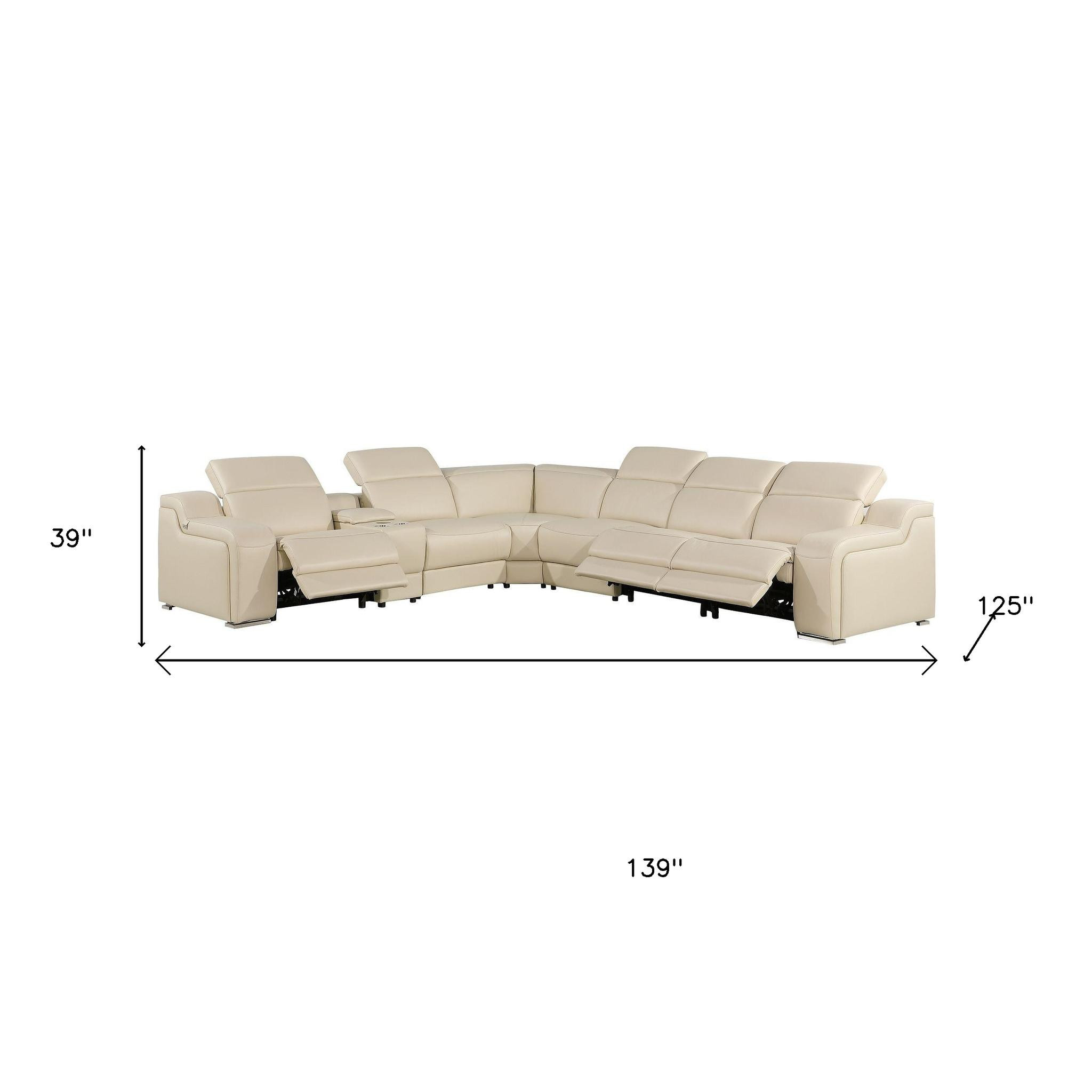 An interior designer's dream, this buttery soft high-grade leather beige italian leather power reclining curved seven piece corner sectional with console will bring just the right touch to your space. The premium leather used makes your lounging luxuriously comfortable and adds an elegant appeal to your space. Solid colors give you lots of decorative options and are easy to work into your decor scheme. Round arms offer a comfy place to rest. Power - push button recline allows you to truly rest, lounge and even sleep comfortably. Silver metal legs effortlessly elevate the room and add a touch of contemporary design. Curved sectionals are a great way to maximize seating space without someone getting stuck in the uncomfortable corner seat. A great showpiece for your room, this sectional is a must have. 39.00-inch h x 139.00-inch w x 125.00-inch d.