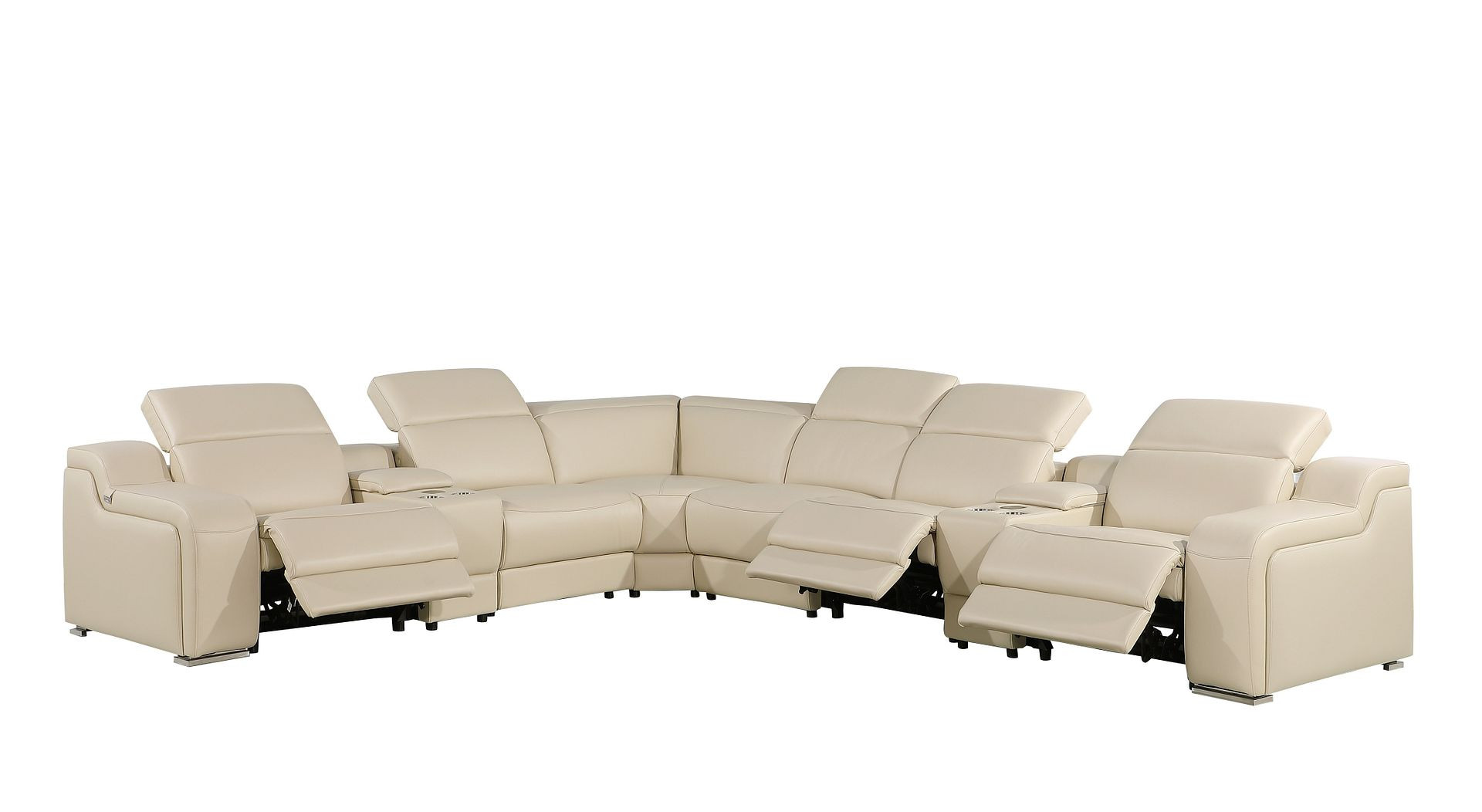 An interior designer's dream, this buttery soft high-grade leather beige italian leather power reclining curved seven piece corner sectional with console will bring just the right touch to your space. The premium leather used makes your lounging luxuriously comfortable and adds an elegant appeal to your space. Solid colors give you lots of decorative options and are easy to work into your decor scheme. Round arms offer a comfy place to rest. For the ultimate in relaxation, this sectional includes power - push button recline that turns it into a comfy lounge for sleeping or resting. Silver metal legs effortlessly elevate the room and add a touch of contemporary design. Ideal for placing in the middle of a room, this curved showstopper is an unconventional way to seat multiple people in a stylish and elegant manor. Great for everyday lounging and for entertaining, sectionals are an ideal way to seat multiple people. 39.00-inch h x 152.00-inch w x 125.00-inch d.