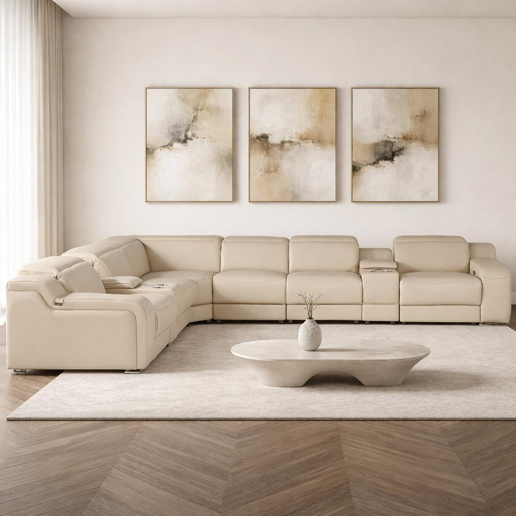 beige italian leather power reclining, leather power reclining curved seven, seven piece corner sectional console, italian leather power reclining curved, curved seven piece corner sectional |