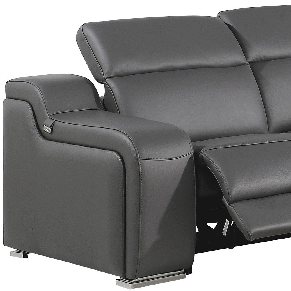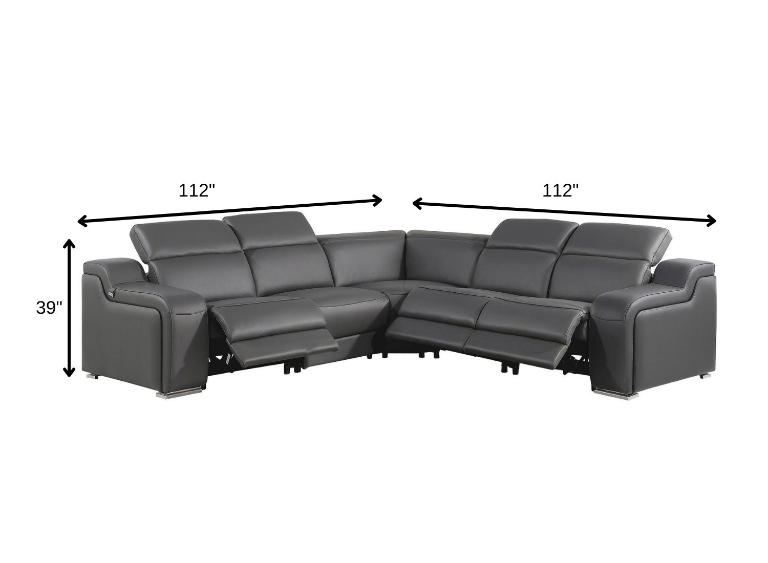 Superior construction from fabulously soft and high-grade leather gives this dark gray italian leather power reclining l shaped five piece corner sectional a leg up on the competition. The premium leather used makes your lounging luxuriously comfortable and adds an elegant appeal to your space. Solid colors give you lots of decorative options and are easy to work into your decor scheme. Round arms offer a comfy place to rest. For the ultimate in relaxation, this sectional includes power - push button recline that turns it into a comfy lounge for sleeping or resting. Black metal legs effortlessly elevate the room and add a touch of contemporary design. Great for everyday lounging and for entertaining, sectionals are an ideal way to seat multiple people. 39-inch H x 112-inch W x 112-inch D