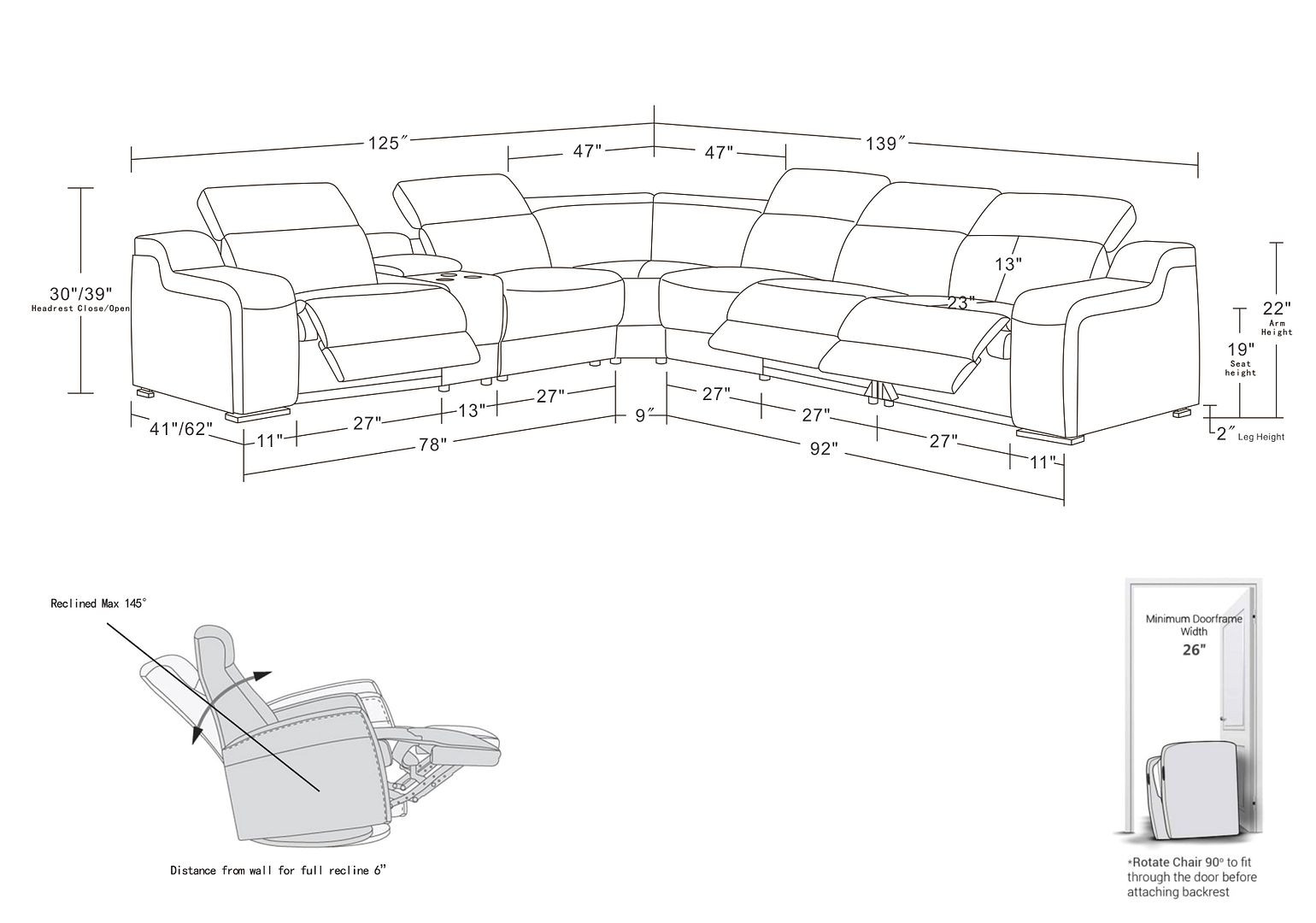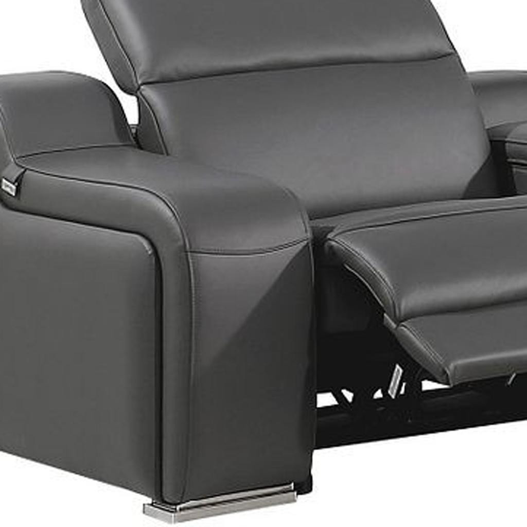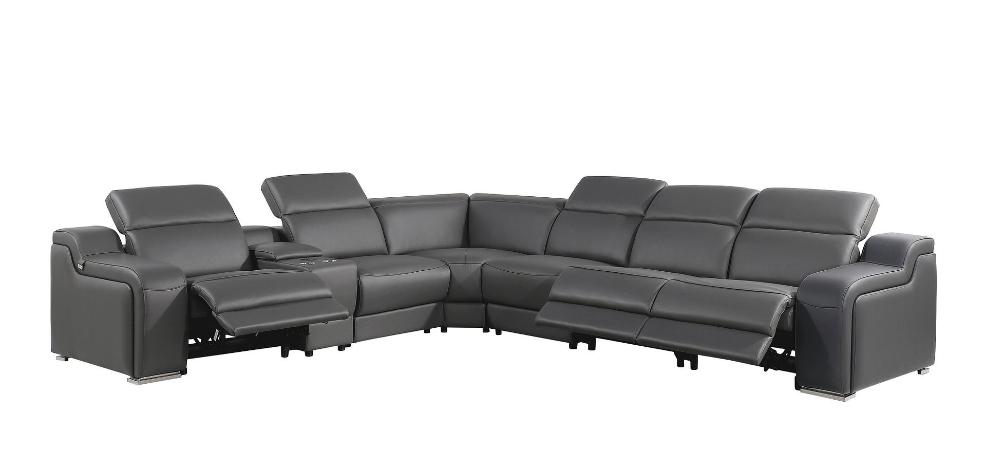 Take your relaxation to the next level with this super soft and comfortable gray italian leather power reclining curved seven piece corner sectional with console. The high-end premium leather used makes your lounging luxuriously comfortable and adds an elegant appeal to your space. Solid colors give you lots of decorative options and are easy to work into your decor scheme. Round_arms offer a comfy place to rest. For the ultimate in relaxation, this sectional includes power - push button recline that turns it into a comfy lounge for sleeping or resting. Add versatility to your room as this sectional opens up into a n/a sleeper bed. Silver metal legs effortlessly elevate the room and add a touch of contemporary design. Ideal for placing in the middle of a room, this curved showstopper is an unconventional way to seat multiple people in a stylish and elegant manor. A great showpiece for your room, this sectional is a must have. 39-inch h x 139-inch w x 125-inch d.