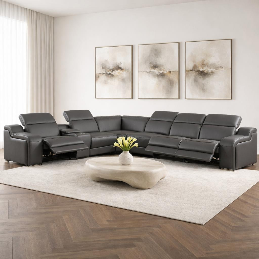leather power reclining curved seven, gray italian leather power reclining, seven piece corner sectional console, italian leather power reclining curved, curved seven piece corner sectional |