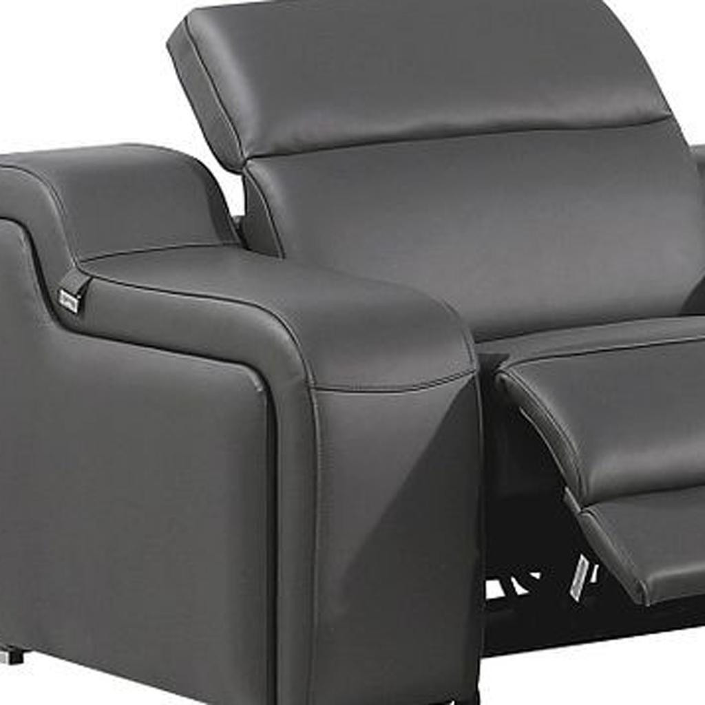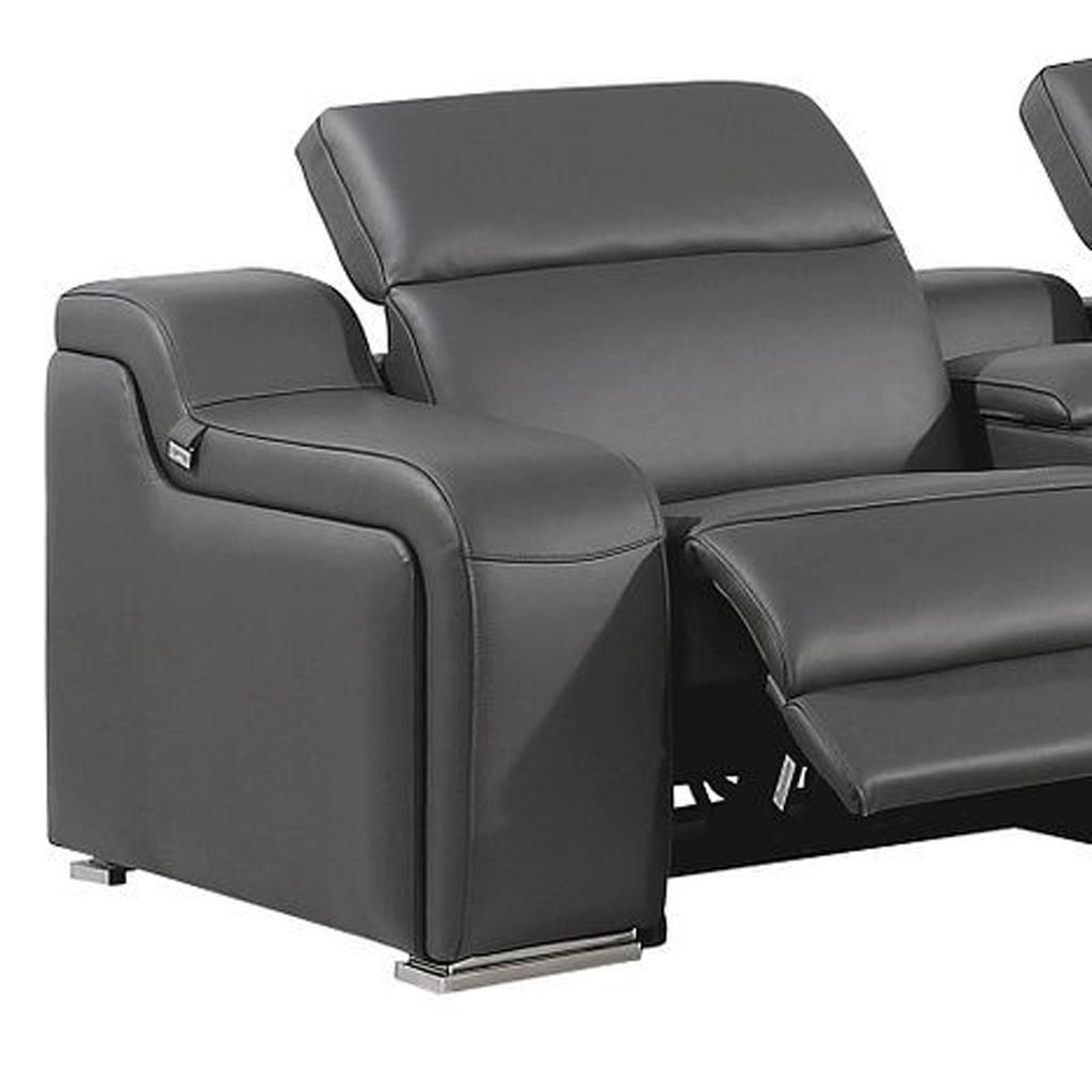 The gray italian leather power reclining curved seven piece corner sectional with console is spacious design meticulously crafted with extraordinary cushion comfort and ultimate durability so everyone in your home can have the best seat in the house. The high-end premium leather used makes your lounging luxuriously comfortable and adds an elegant appeal to your space. Solid colors give you lots of decorative options and are easy to work into your decor scheme. Round_arms offer a comfy place to rest. For the ultimate in relaxation, this sectional includes power - push button recline that turns it into a comfy lounge for sleeping or resting. Add versatility to your room as this sectional opens up into a n/a sleeper bed. Silver metal legs effortlessly elevate the room and add a touch of contemporary design. Curved sectionals are a great way to maximize seating space without someone getting stuck in the uncomfortable corner seat. A great showpiece for your room, this sectional is a must have. 39-inch h x 139-inch w x 125-inch d.