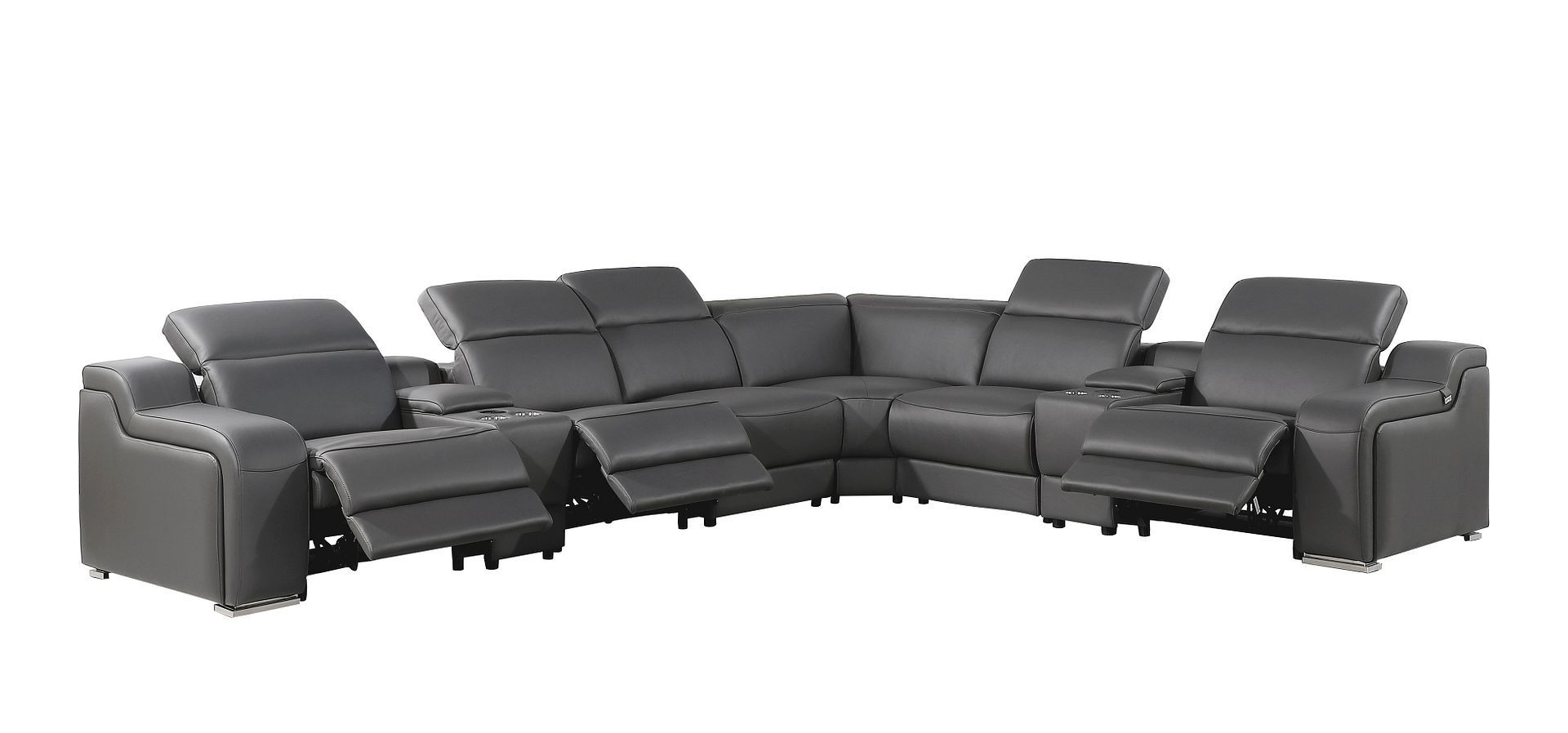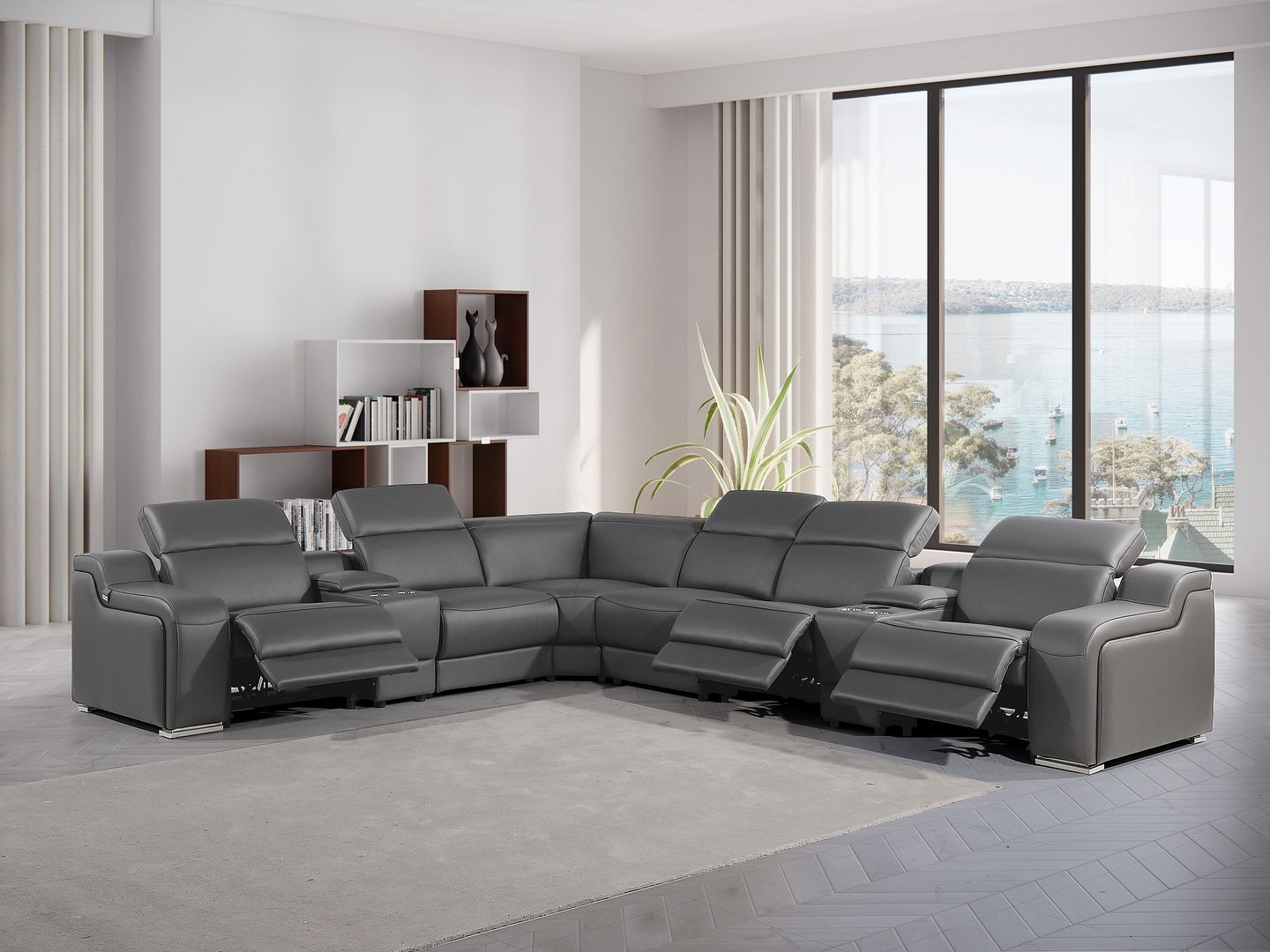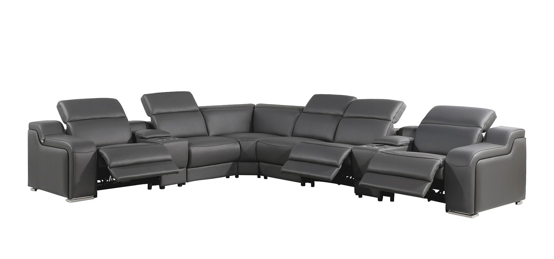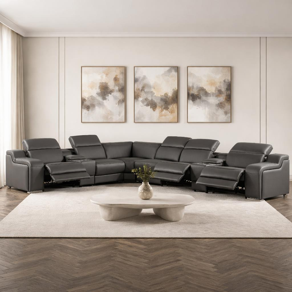 The gray italian leather power reclining curved eight piece corner sectional with console is spacious design meticulously crafted with extraordinary cushion comfort and ultimate durability so everyone in your home can have the best seat in the house. The high-end premium leather used makes your lounging luxuriously comfortable and adds an elegant appeal to your space. Solid colors give you lots of decorative options and are easy to work into your decor scheme. Round_arms offer a comfy place to rest. Power - push button recline allows you to truly rest, lounge and even sleep comfortably. Add versatility to your room as this sectional opens up into a n/a sleeper bed. Silver metal legs effortlessly elevate the room and add a touch of contemporary design. Ideal for placing in the middle of a room, this curved showstopper is an unconventional way to seat multiple people in a stylish and elegant manor. A great showpiece for your room, this sectional is a must have. 39-inch h x 152-inch w x 125-inch d.