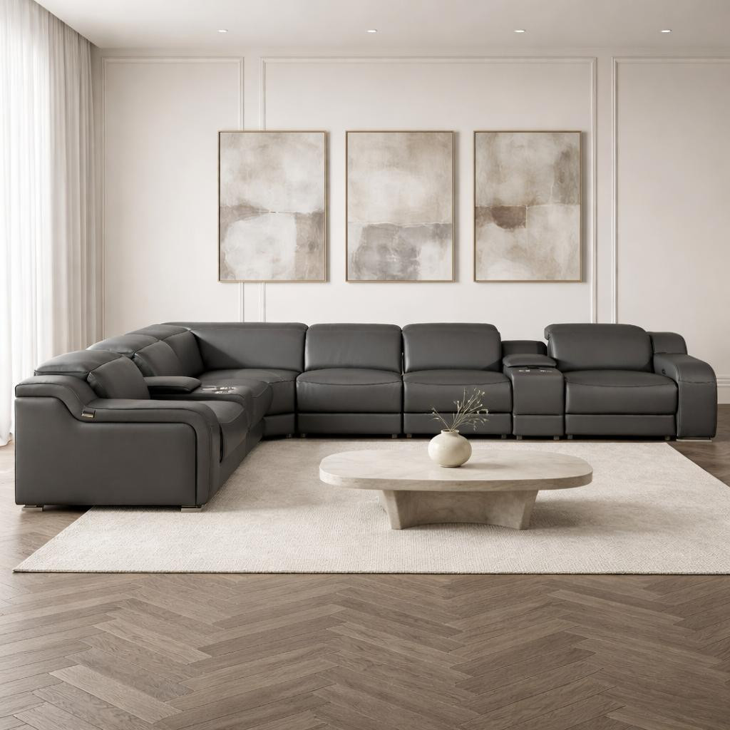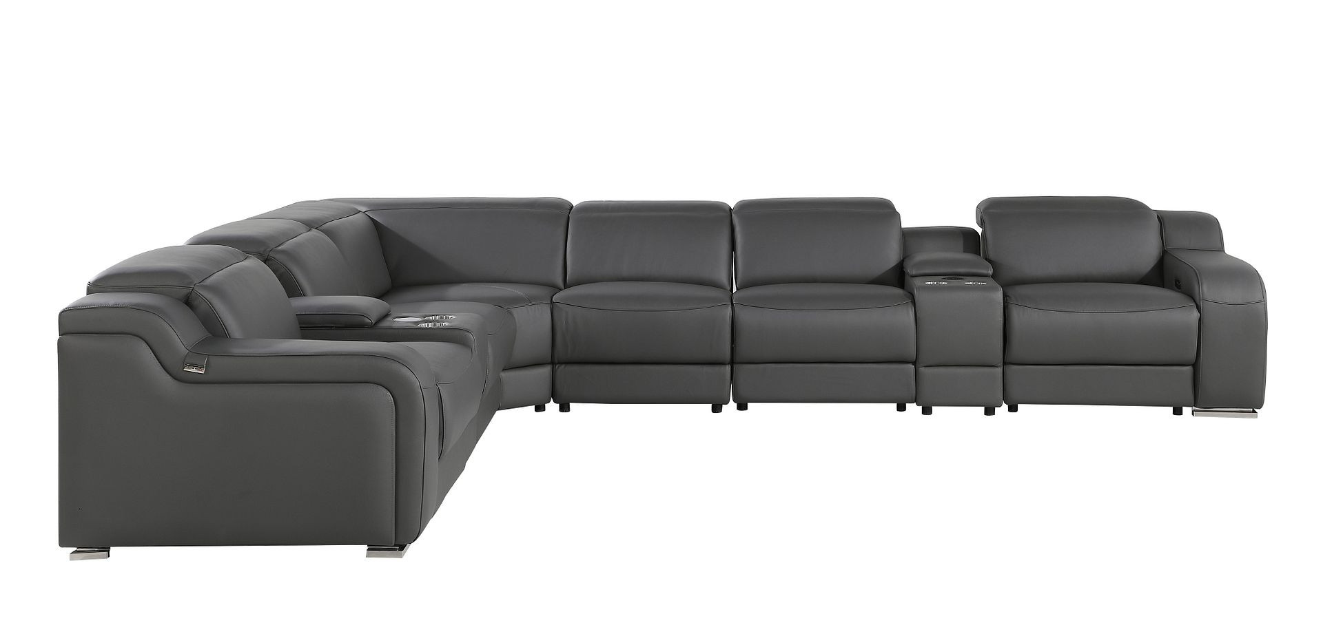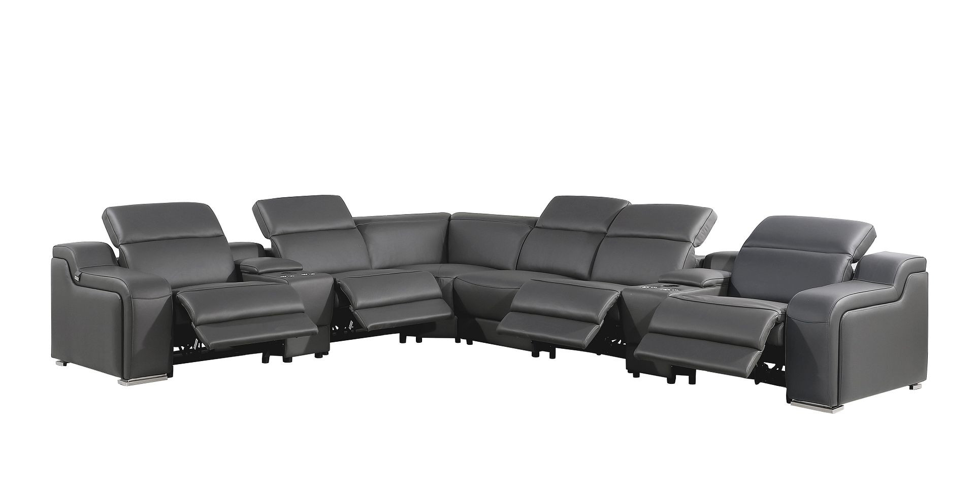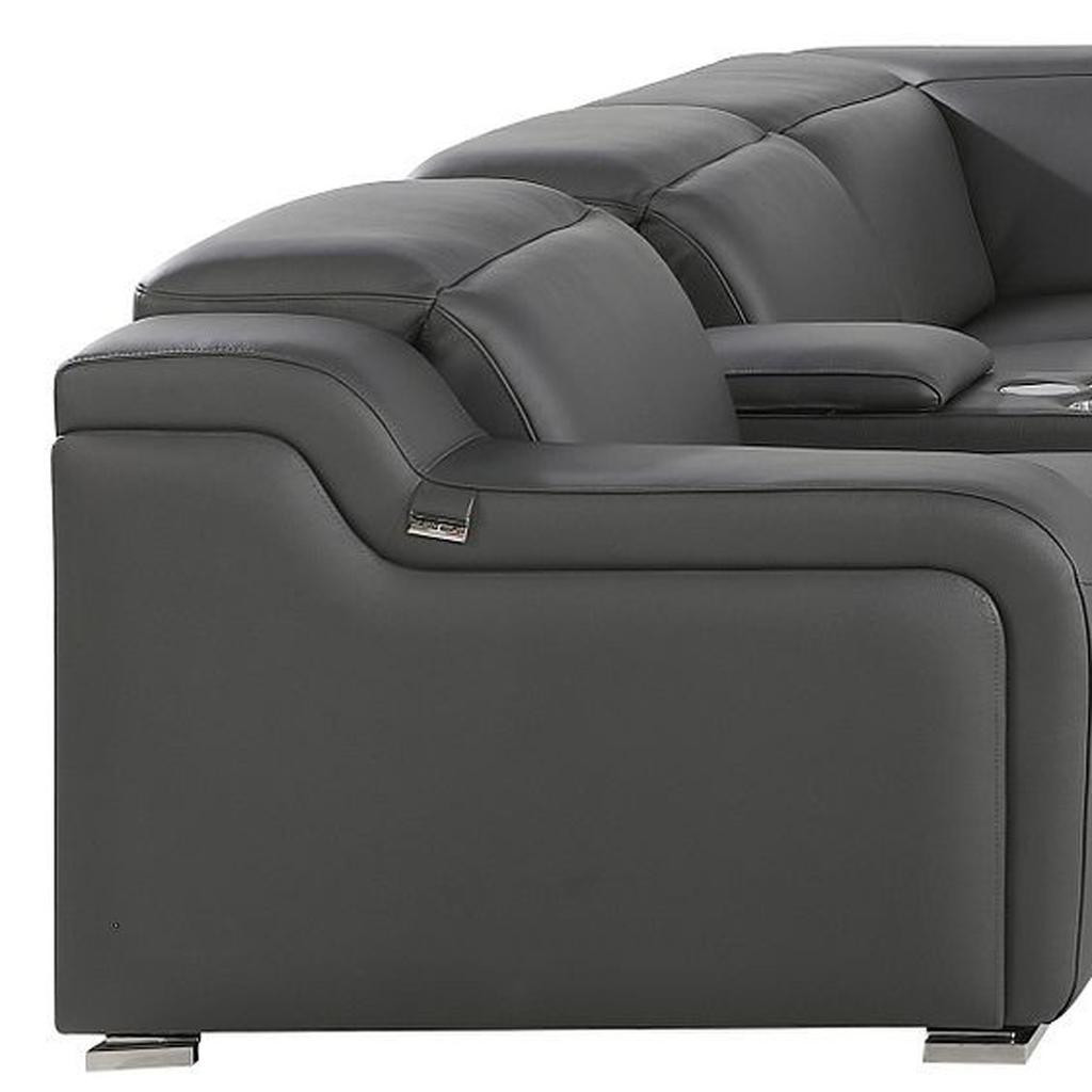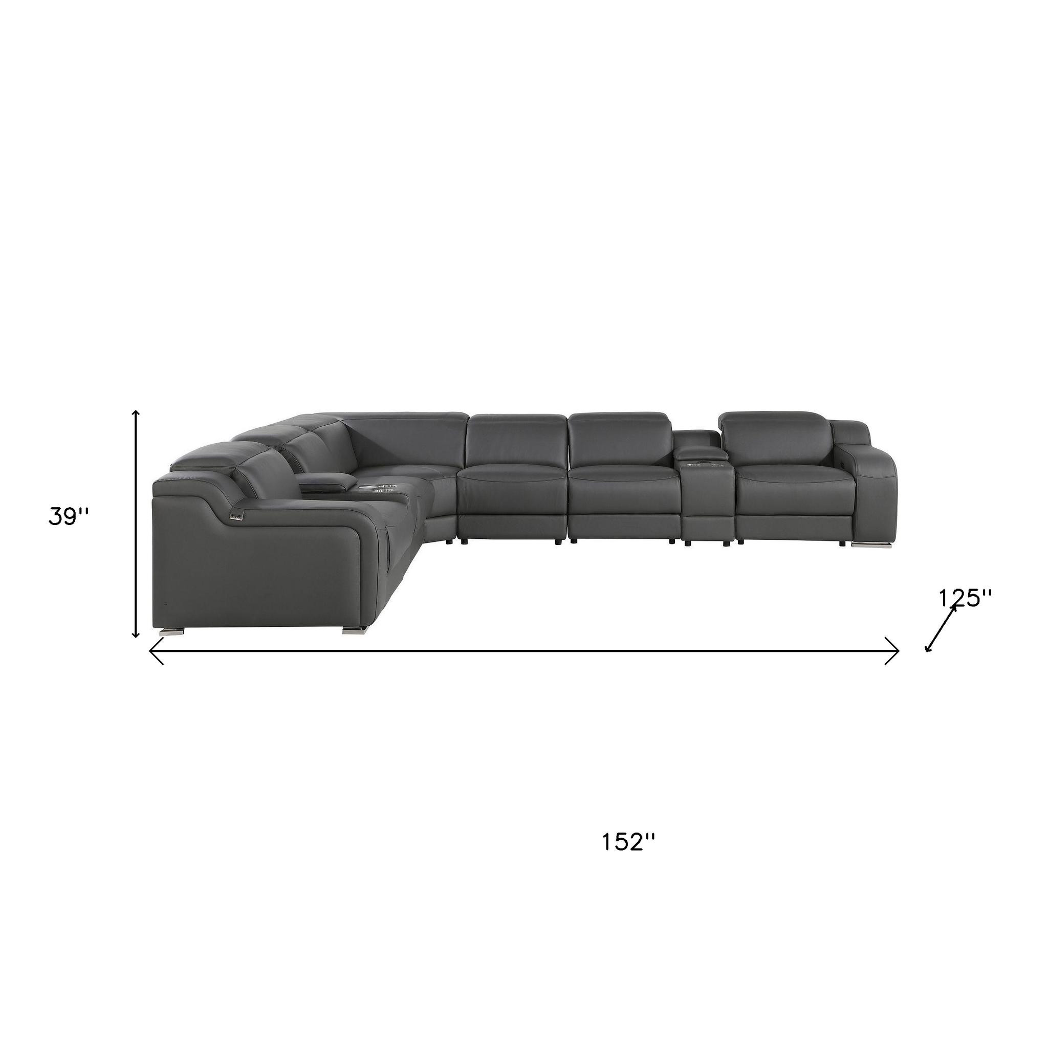 Take your relaxation to the next level with this super soft and comfortable gray italian leather power reclining curved eight piece corner sectional with console. The high-end premium leather used makes your lounging luxuriously comfortable and adds an elegant appeal to your space. Solid colors give you lots of decorative options and are easy to work into your decor scheme. Round_arms offer a comfy place to rest. For the ultimate in relaxation, this sectional includes power - push button recline that turns it into a comfy lounge for sleeping or resting. Add versatility to your room as this sectional opens up into a n/a sleeper bed. Silver metal legs effortlessly elevate the room and add a touch of contemporary design. Curved sectionals are a great way to maximize seating space without someone getting stuck in the uncomfortable corner seat. Great for everyday lounging and for entertaining, sectionals are an ideal way to seat multiple people. 39-inch h x 152-inch w x 125-inch d.