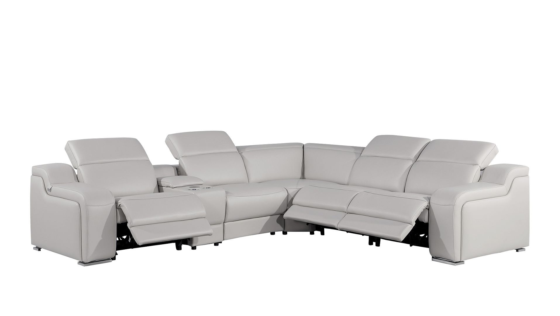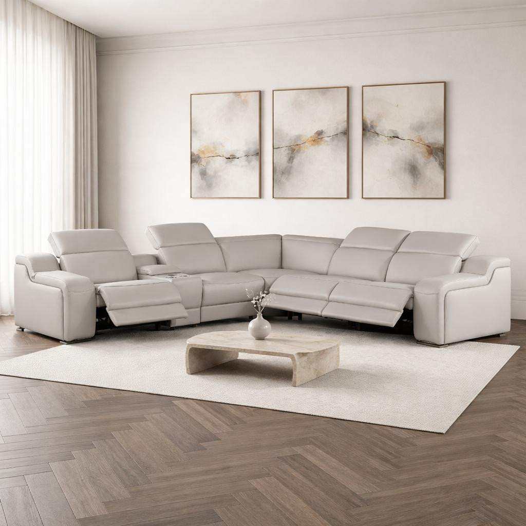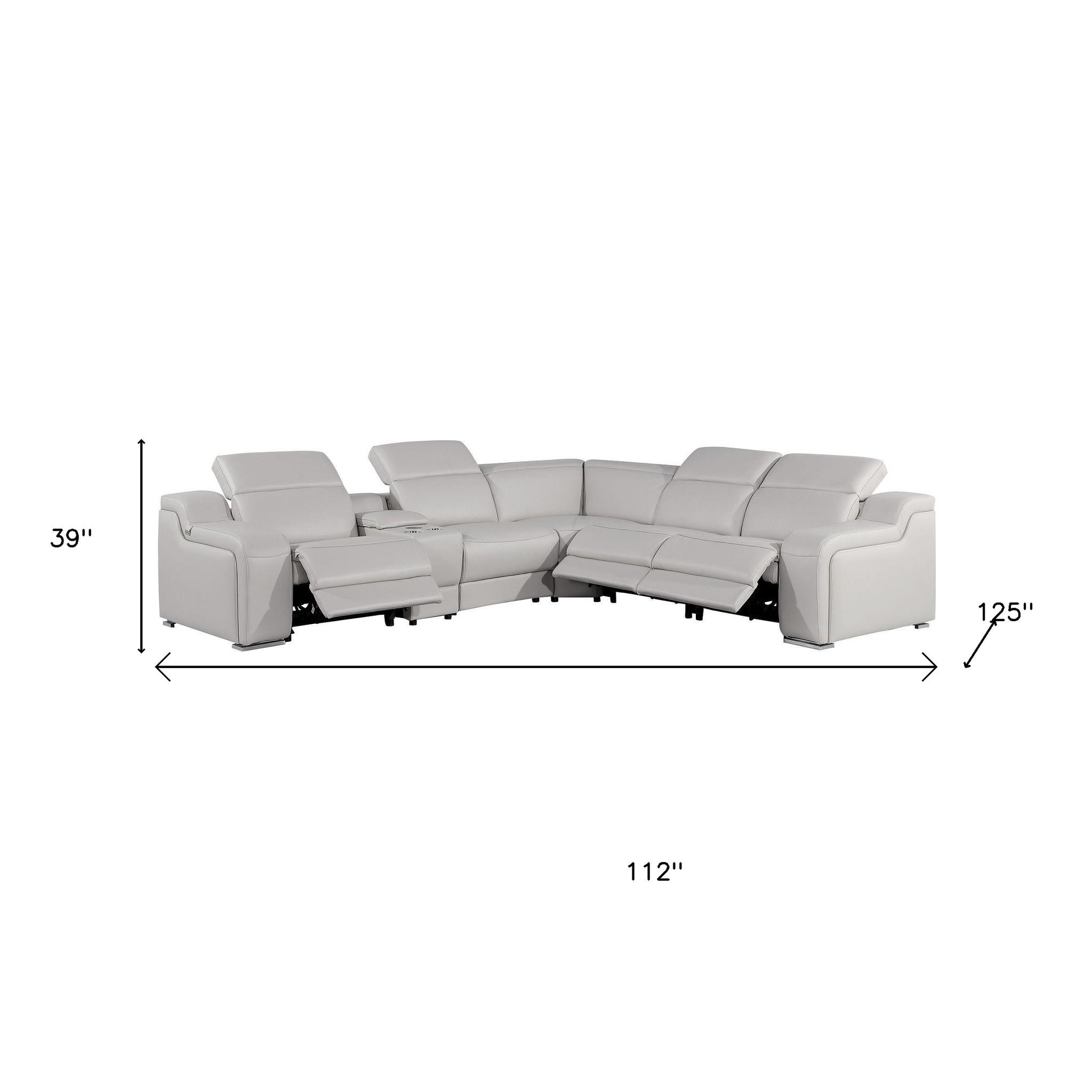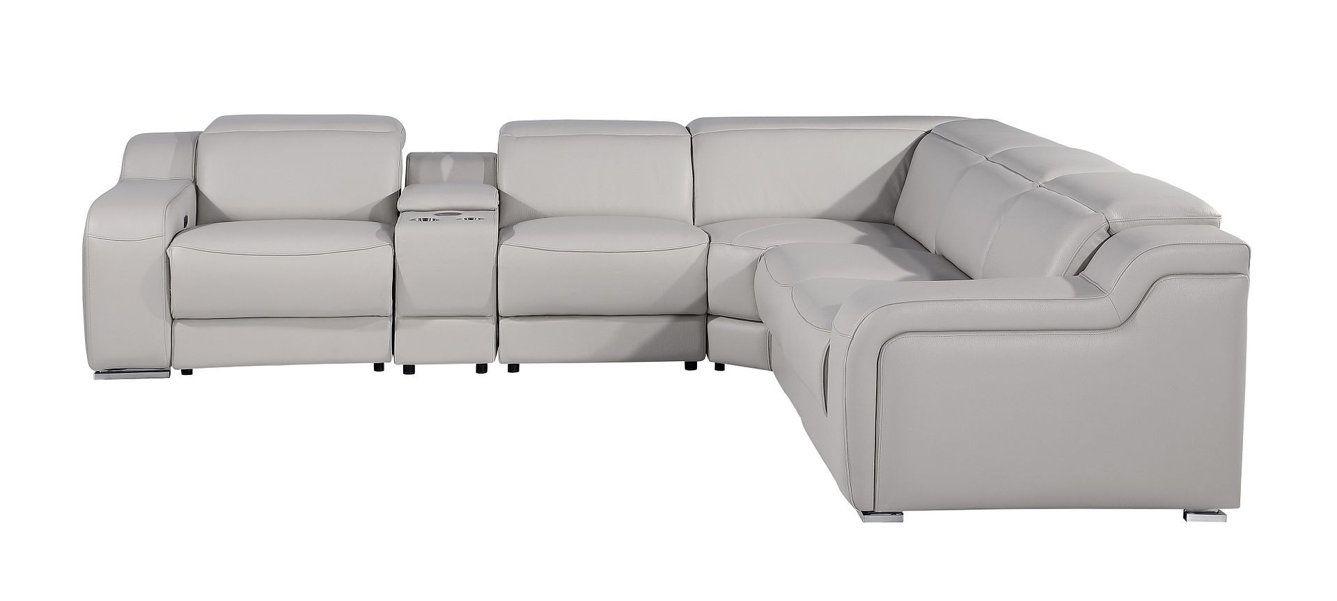 Made of the highest quality, supple leather, this light gray italian leather power reclining curved six piece corner sectional with console will be the star of your space. The high-grade premium leather used makes your lounging luxuriously comfortable and adds an elegant appeal to your space. Solid colors give you lots of decorative options and are easy to work into your decor scheme. Round_arms offer a comfy place to rest. Power - push button recline allows you to truly rest, lounge and even sleep comfortably. Add versatility to your room as this sectional opens up into a n/a sleeper bed. Silver metal legs effortlessly elevate the room and add a touch of contemporary design. Ideal for placing in the middle of a room, this curved showstopper is an unconventional way to seat multiple people in a stylish and elegant manor. A great showpiece for your room, this sectional is a must have. 39-inch h x 112-inch w x 125-inch d.