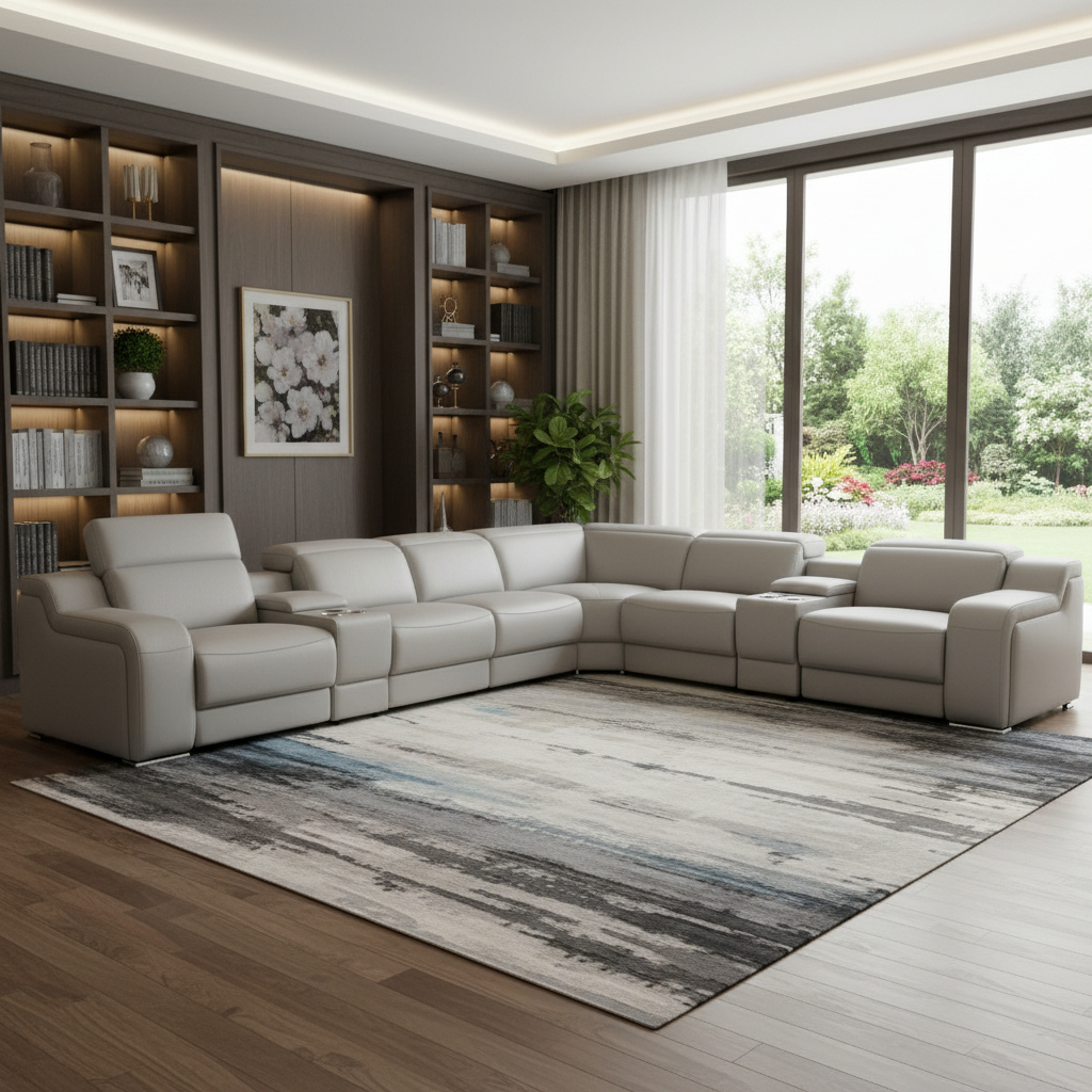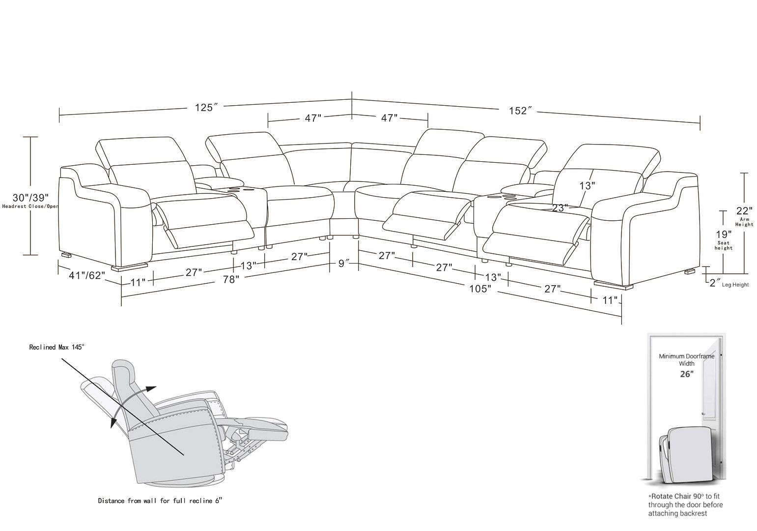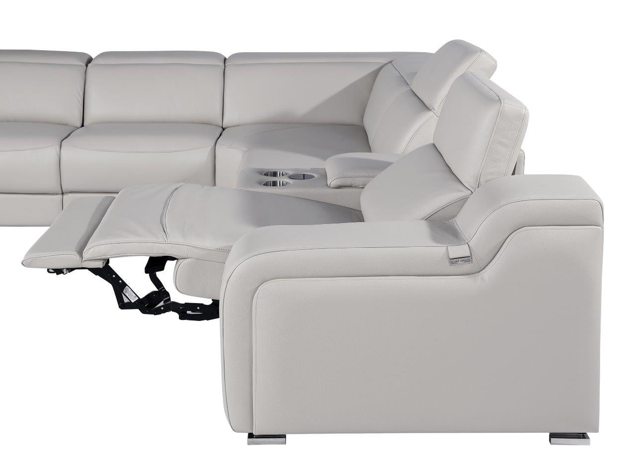 Take your relaxation to the next level with this super soft and comfortable light gray italian leather power reclining curved eight piece corner sectional with console. The high-end premium leather used makes your lounging luxuriously comfortable and adds an elegant appeal to your space. Solid colors give you lots of decorative options and are easy to work into your decor scheme. Round_arms offer a comfy place to rest. Power - push button recline allows you to truly rest, lounge and even sleep comfortably. Add versatility to your room as this sectional opens up into a n/a sleeper bed. Silver metal legs effortlessly elevate the room and add a touch of contemporary design. Ideal for placing in the middle of a room, this curved showstopper is an unconventional way to seat multiple people in a stylish and elegant manor. A great showpiece for your room, this sectional is a must have. 39-inch h x 152-inch w x 125-inch d.