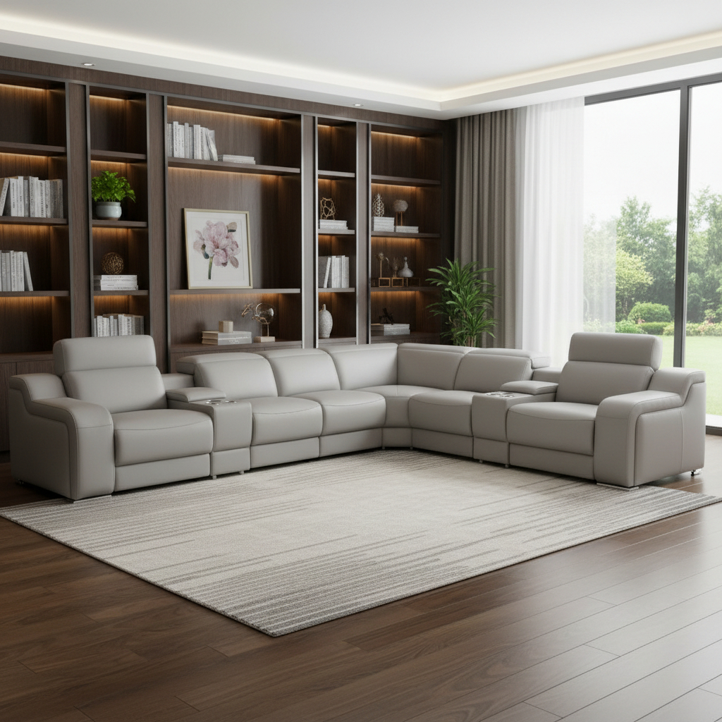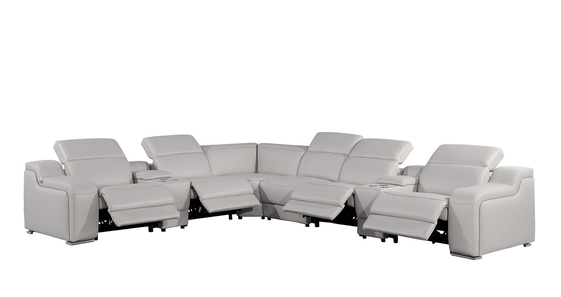 An interior designer's dream, this buttery soft high-grade leather light gray italian leather power reclining curved eight piece corner sectional with console will bring just the right touch to your space. The premium leather used makes your lounging luxuriously comfortable and adds an elegant appeal to your space. Solid colors give you lots of decorative options and are easy to work into your decor scheme. Round_arms offer a comfy place to rest. Power - push button recline allows you to truly rest, lounge and even sleep comfortably. Add sleeping options to your space as this fabulous sectional opens to a n/a sleeper. Silver metal legs effortlessly elevate the room and add a touch of contemporary design. Ideal for placing in the middle of a room, this curved showstopper is an unconventional way to seat multiple people in a stylish and elegant manor. A great showpiece for your room, this sectional is a must have. 39-inch h x 152-inch w x 125-inch d.