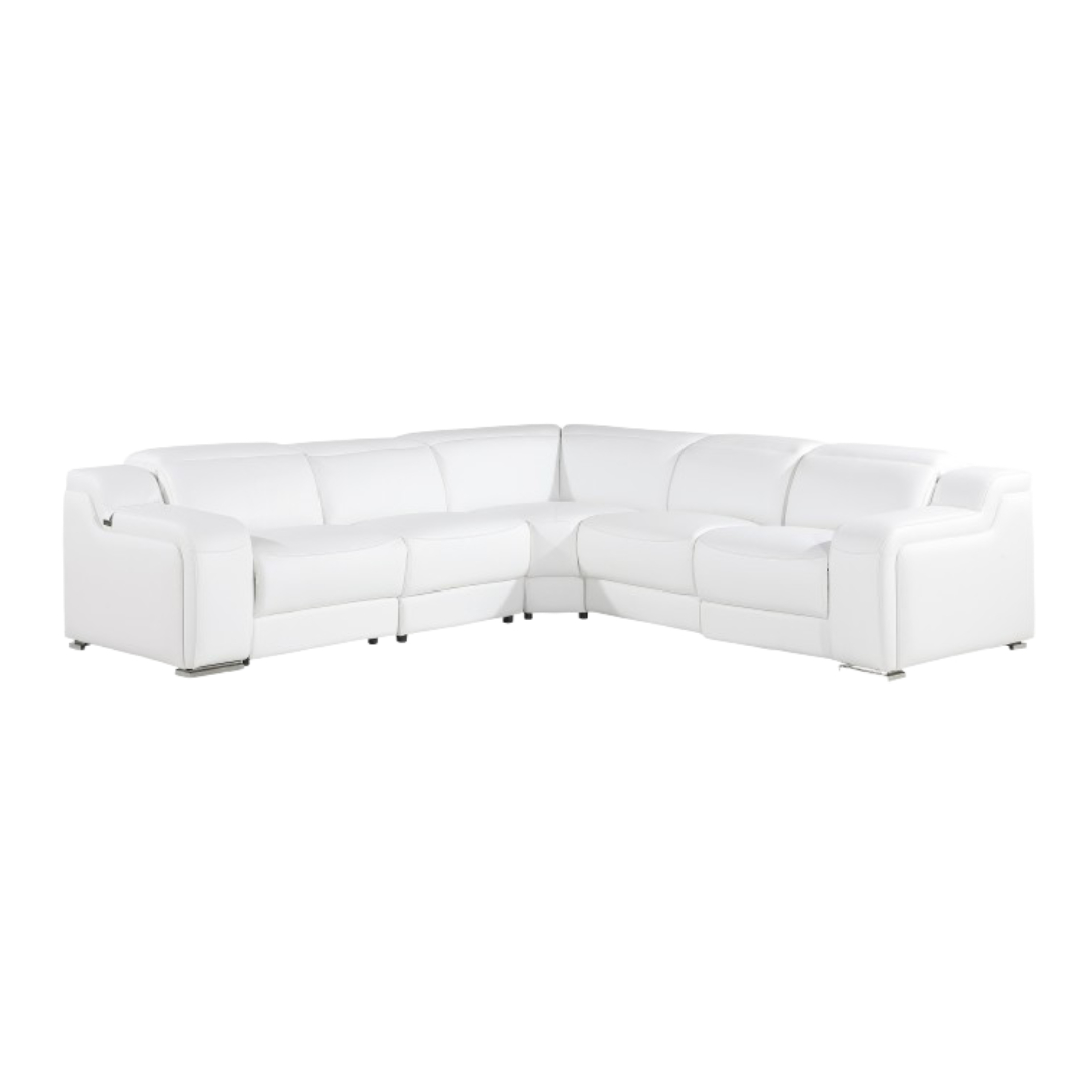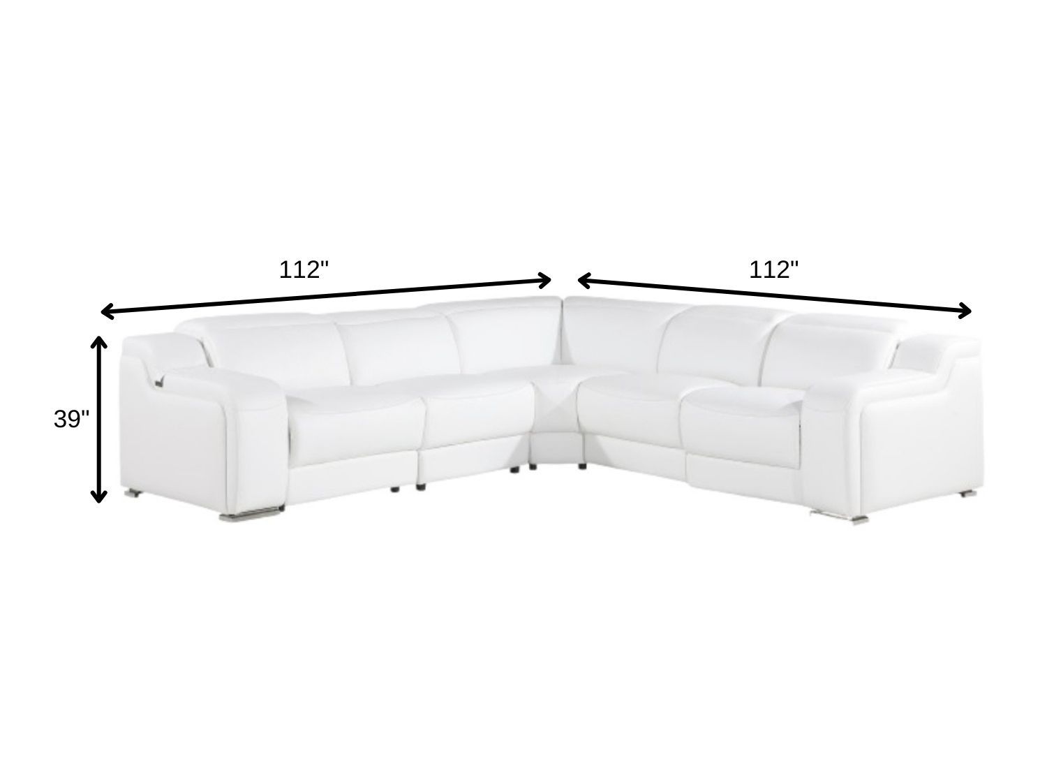 Take your relaxation to the next level with this super soft and comfortable white italian leather power reclining l shaped five piece corner sectional. The high-end premium leather used makes your lounging luxuriously comfortable and adds an elegant appeal to your space. Solid colors give you lots of decorative options and are easy to work into your decor scheme. Round arms offer a comfy place to rest. For the ultimate in relaxation, this sectional includes power - push button recline that turns it into a comfy lounge for sleeping or resting. Black metal legs effortlessly elevate the room and add a touch of contemporary design. Great for everyday lounging and for entertaining, sectionals are an ideal way to seat multiple people. 39-inch H x 112-inch W x 112-inch D