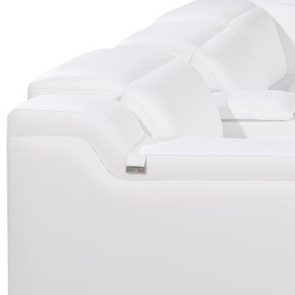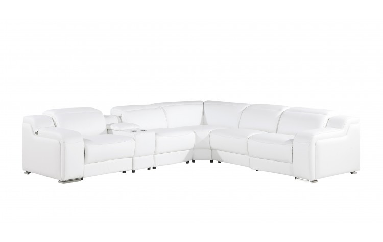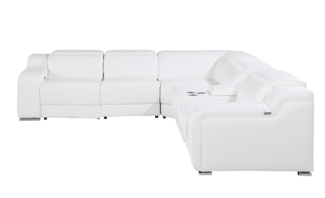 Made of the highest quality, supple leather, this white italian leather power reclining l shaped six piece corner sectional with console will be the star of your space. The high-grade premium leather used makes your lounging luxuriously comfortable and adds an elegant appeal to your space. Solid colors give you lots of decorative options and are easy to work into your decor scheme. Round arms offer a comfy place to rest. For the ultimate in relaxation, this sectional includes power - push button recline that turns it into a comfy lounge for sleeping or resting. Black metal legs effortlessly elevate the room and add a touch of contemporary design. A great showpiece for your room, this sectional is a must have. 39-inch H x 125-inch W x 112-inch D