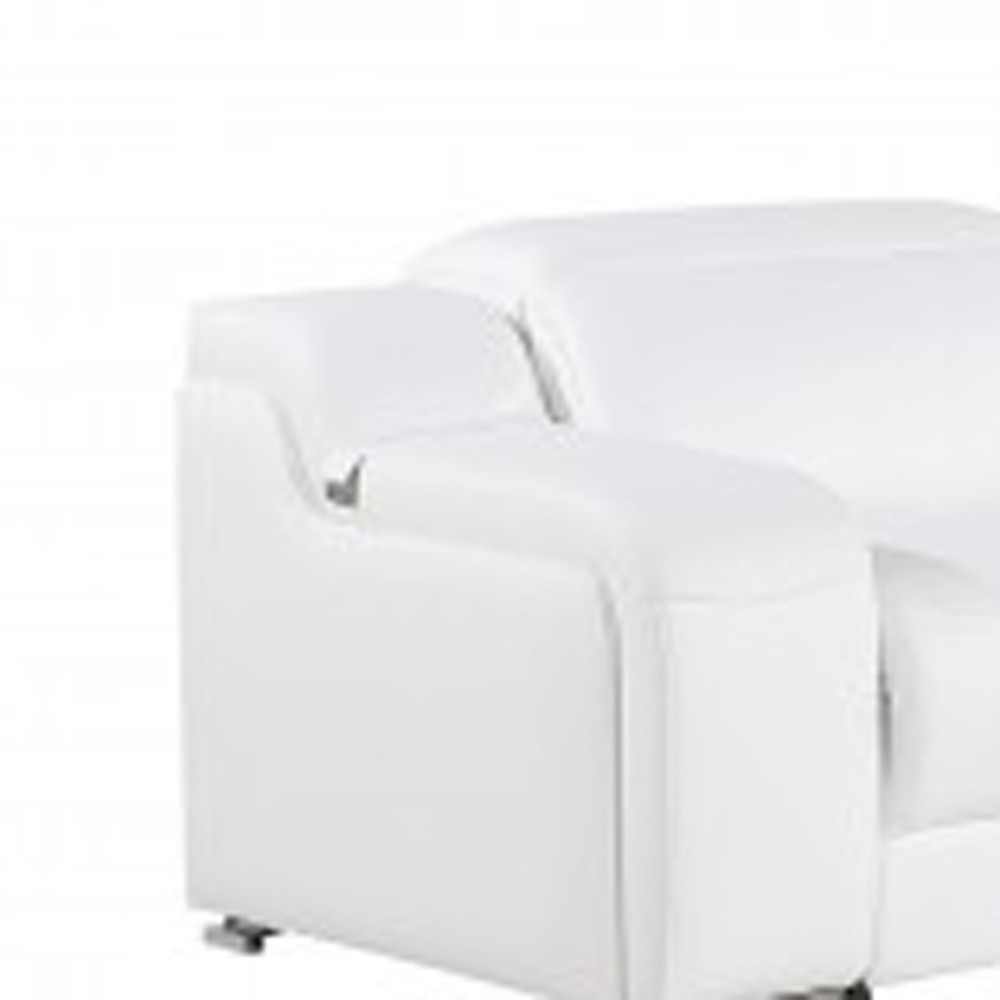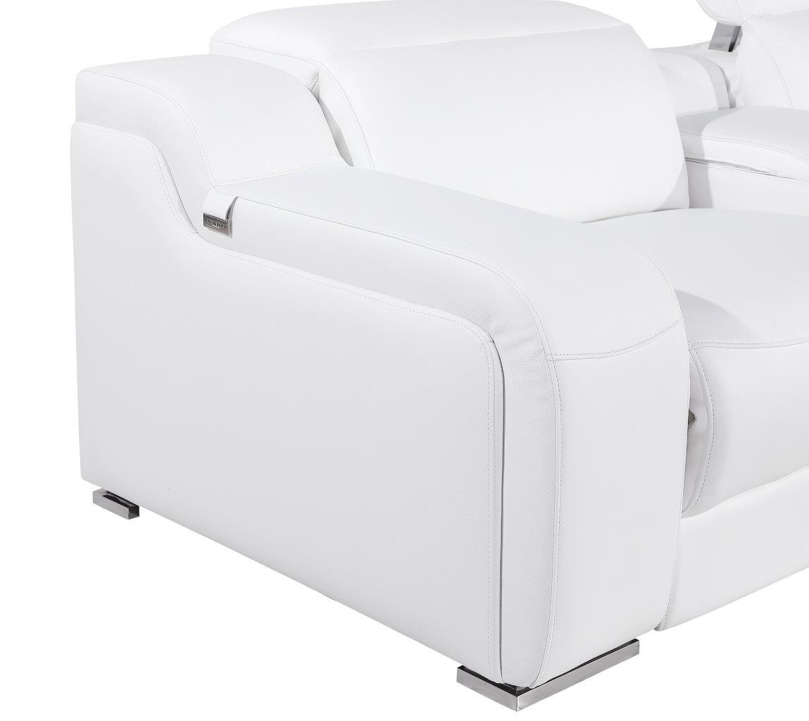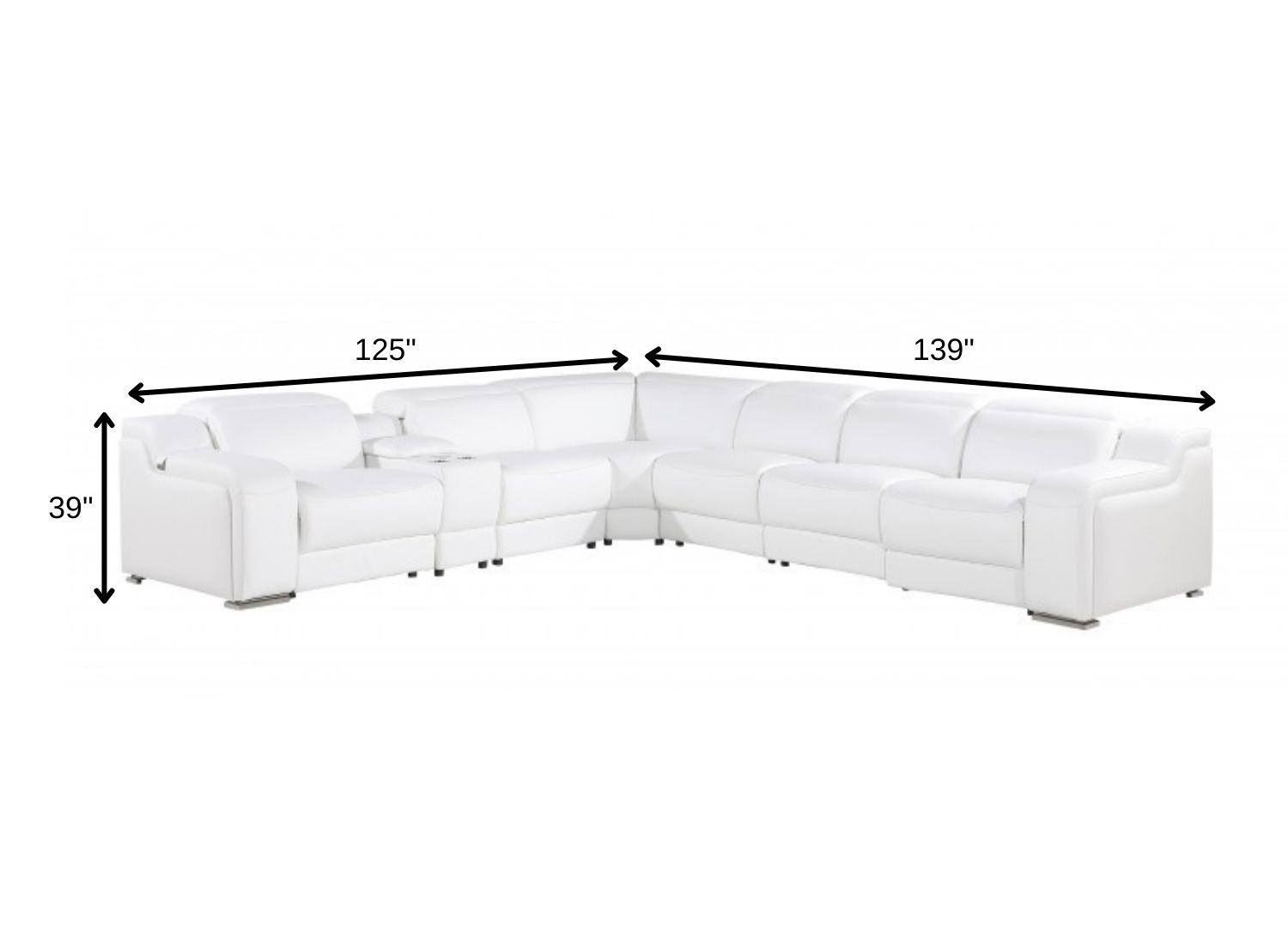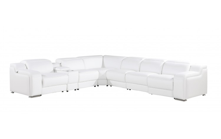 Made of the highest quality, supple leather, this white Italian leather 4 power reclining L shaped seven piece corner sectional with console will be the star of your space. The high-grade premium leather used makes your lounging luxuriously comfortable and adds an elegant appeal to your space. Solid colors give you lots of decorative options and are easy to work into your decor scheme. Round arms offer a comfy place to rest. For the ultimate in relaxation, this sectional includes power - push button recline that turns it into a comfy lounge for sleeping or resting. Black metal legs effortlessly elevate the room and add a touch of contemporary design. Features console storage for convenience and to help keep your space tidy. Great for everyday lounging and for entertaining, sectionals are an ideal way to seat multiple people. 39-inch H x 139-inch W x 125-inch D