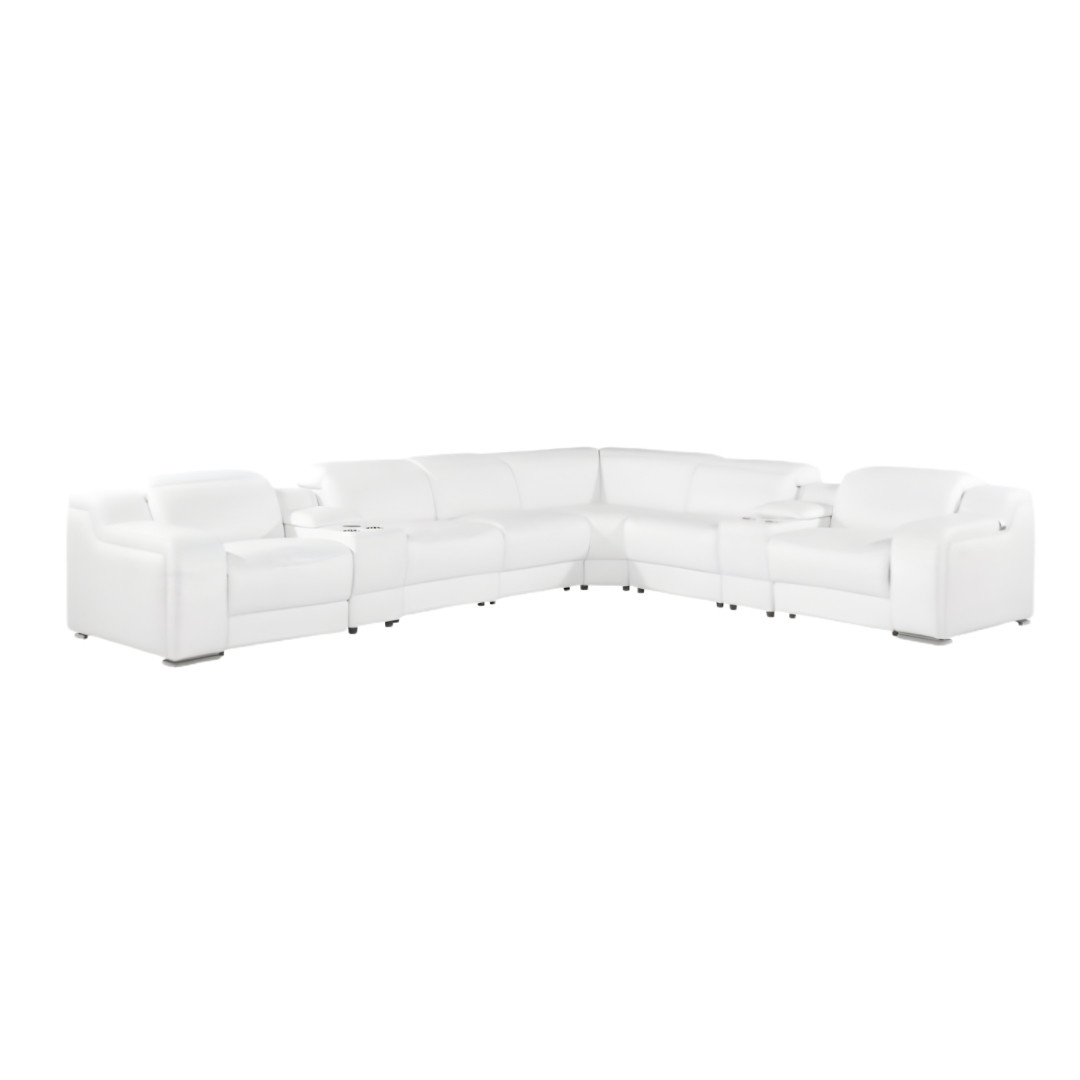 Made of the highest quality, supple leather, this white Italian leather 3 power reclining l shaped eight piece corner sectional with console will be the star of your space. The high-grade premium leather used makes your lounging luxuriously comfortable and adds an elegant appeal to your space. Solid colors give you lots of decorative options and are easy to work into your decor scheme. Round arms offer a comfy place to rest. For the ultimate in relaxation, this sectional includes power - push button recline that turns it into a comfy lounge for sleeping or resting. Black metal legs effortlessly elevate the room and add a touch of contemporary design. A great showpiece for your room, this sectional is a must have. 39-inch H x 152-inch W x 125-inch D