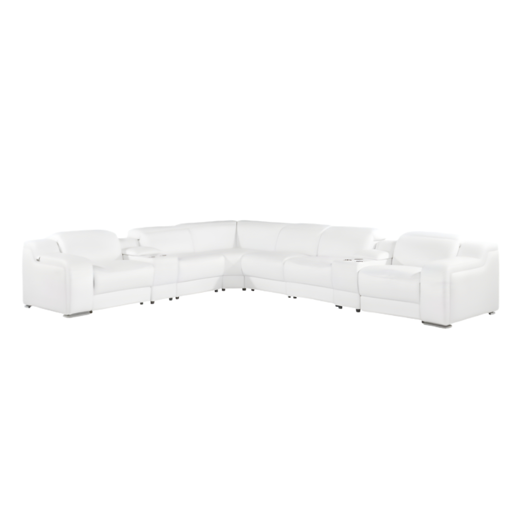 The white Italian leather 4 power reclining l shaped eight piece corner sectional with console is spacious design meticulously crafted with extraordinary cushion comfort and ultimate durability so everyone in your home can have the best seat in the house. The high-end premium leather used makes your lounging luxuriously comfortable and adds an elegant appeal to your space. Solid colors give you lots of decorative options and are easy to work into your decor scheme. Round arms offer a comfy place to rest. For the ultimate in relaxation, this sectional includes power - push button recline that turns it into a comfy lounge for sleeping or resting. Black metal legs effortlessly elevate the room and add a touch of contemporary design. Features console storage for convenience and to help keep your space tidy. Great for everyday lounging and for entertaining, sectionals are an ideal way to seat multiple people. 39-inch H x 152-inch W x 125-inch D