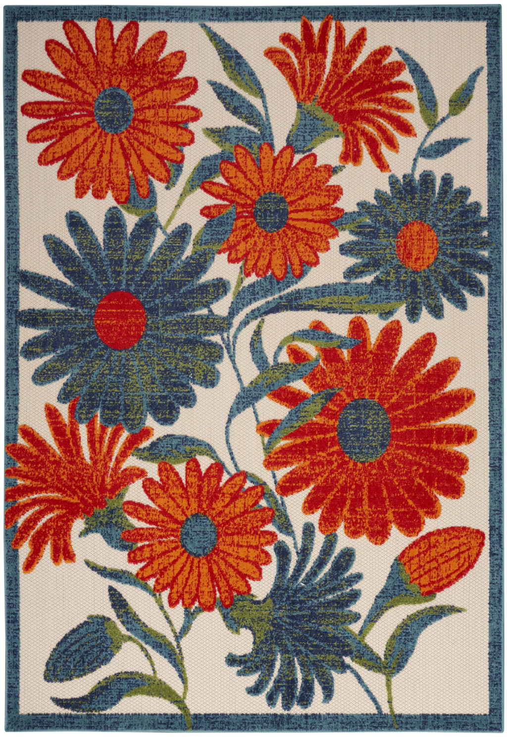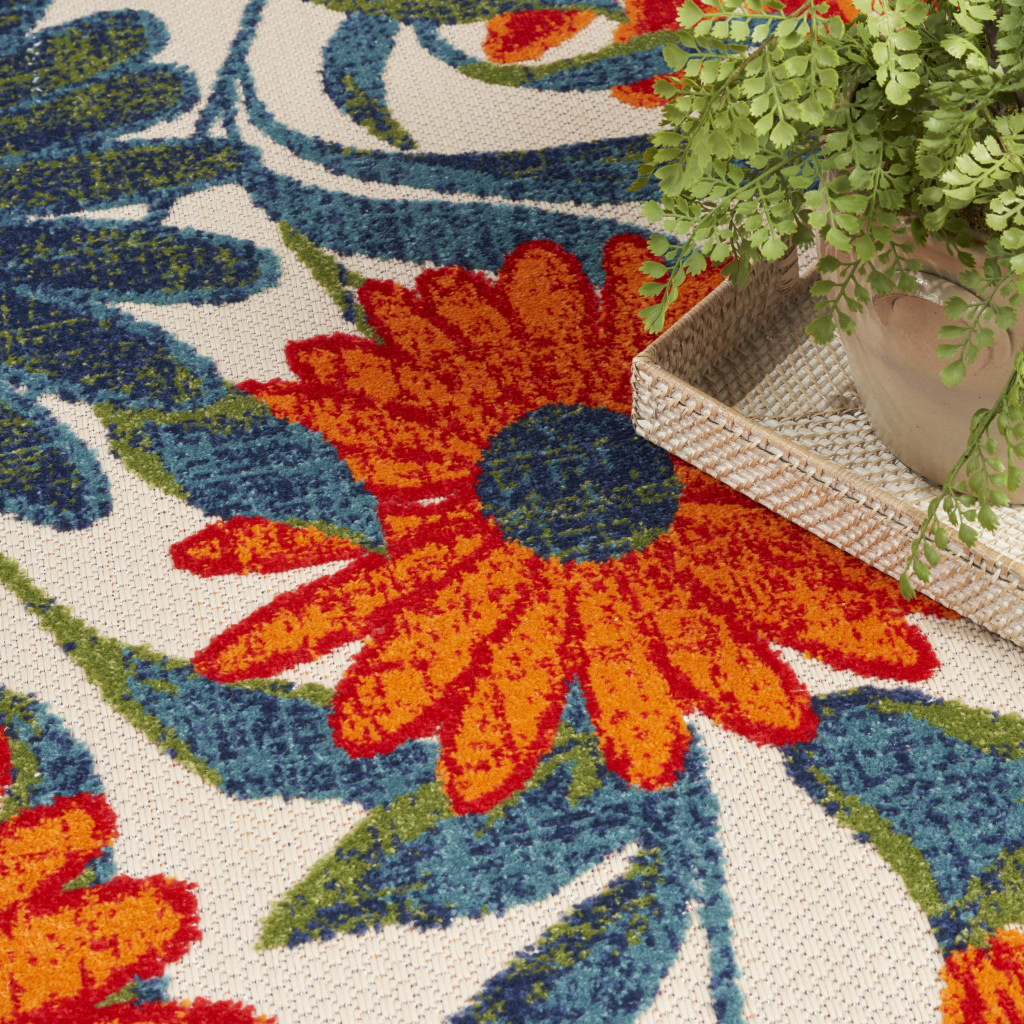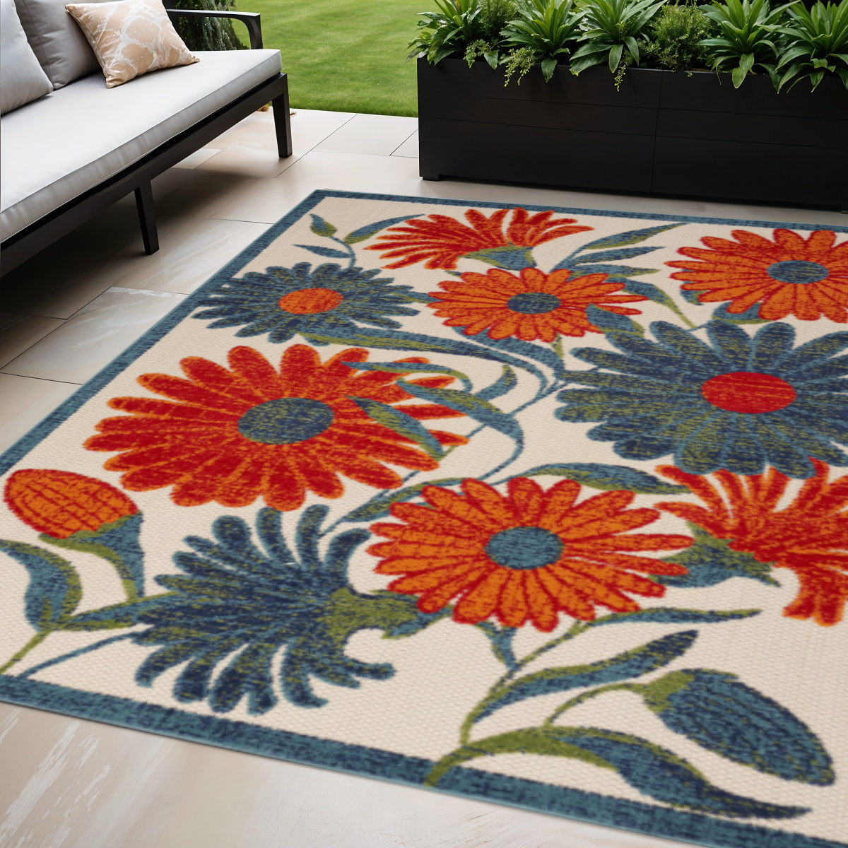 floral indoor outdoor area rug, indoor outdoor area rug, outdoor area rug, blue orange green floral indoor, ivory blue orange green |