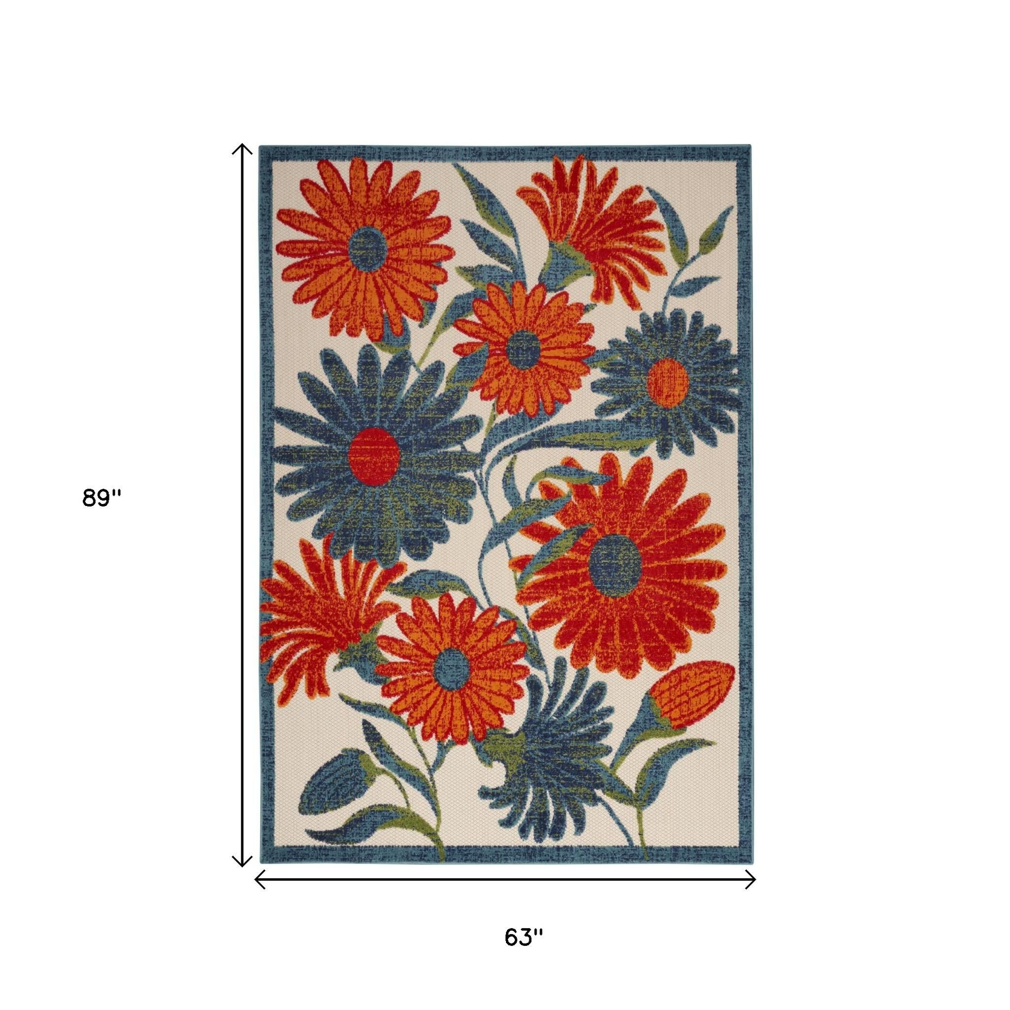 Set an inviting tone in your space with this 5-foot x 8-foot ivory blue orange and green floral indoor outdoor area rug. This rectangle shaped rug features a floral design that will work well both indoors or out. A classic shape marries with good looking design for your living room, hall, bedroom, porch, patio, or poolside. Ideal for outdoor spaces or high traffic areas with kids and pets, this rug is made from heavy duty polypropylene that is stain resistant to help repel water, dirt, and stains. Versatile in use, durable, and easy to maintain, this rug is an ideal solution to add a decorative and inviting touch to your indoor or outdoor space. 63-inch h x 89-inch w x 0.25-inch d.